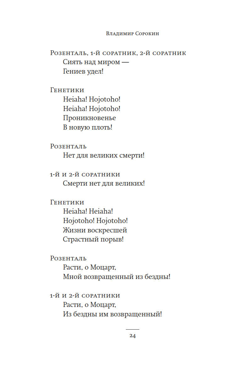 В сборник вошли либретто четырех опер, написанные Владимиром Сорокиным в сотрудничестве с выдающимися композиторами. Классик русского постмодернизма, легко нарушающий границы жанров и не признающий авторитетов, демонстрирует глубокое понимание оперы и специфики музыкального театра. Стилистическая чуткость, которая не мешает автору оставаться самим собой, объединяет тексты для очень непохожих друг на друга спектаклей. Постановка «Детей Розенталя» на музыку Леонида Десятникова в Большом театре в 2005 году вызвала бурные дискуссии и получила премию «Золотая маска»; эксперимент «Снов Минотавра», показанных в 2012 году на фестивале «Территория», оказался слишком радикальным для широкой публики; оратория Генделя, давшая название всему сборнику, стала первой работой режиссера Константина Богомолова на музыкальной сцене, а «Фиолетовый снег» поставлен на сцене Берлинского оперного театра. Либретто, написанные Сорокиным, открывают с неожиданной стороны не только творчество писателя, но и современную оперу.