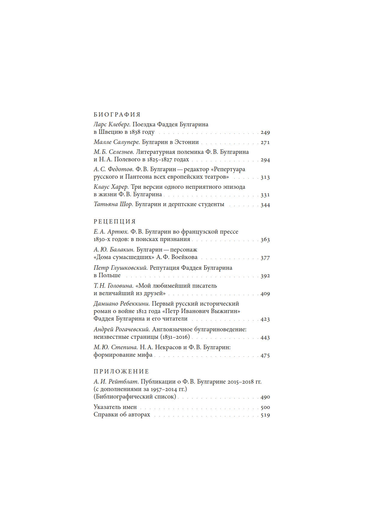 Сборник статей, подготовленных на основе докладов на конференции «Ф. В. Булгарин — писатель, журналист, театральный критик» (2017), организованной журналом «Новое литературное обозрение» и Российской государственной библиотекой искусств, в которой приняли участие исследователи из Белоруссии, Германии, Италии, Польши, России, США, Украины, Эстонии. Статьи посвященных различным аспектам биографии и творчества Ф. В. Булгарина, а также рецепции его произведений публикой и исследователями разных стран.