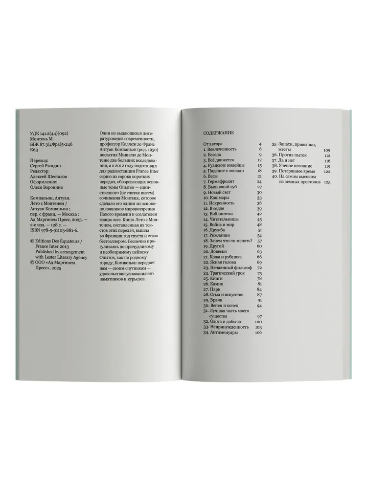 Один из выдающихся литературоведов современности, профессор Коллеж де Франс Антуан Компаньон (род. 1950) посвятил Мишелю де Монтеню два больших исследования, а в 2012 году подготовил для радиостанции France Inter серию из сорока коротких передач, обозревающих основные темы Опытов — единственного (не считая писем) сочинения Монтеня, которое сделало его одним из основоположников мировоззрения Нового времени и создателем жанра эссе. Книга Лето с Монтенем, составленная из текстов этих передач, вышла во Франции год спустя и стала бестселлером. Беспечно прогуливаясь по причудливому и необозримому пейзажу Опытов, как по родному городу, Компаньон передает нам — своим спутникам — удовольствие узнавания его памятников и курьезов.