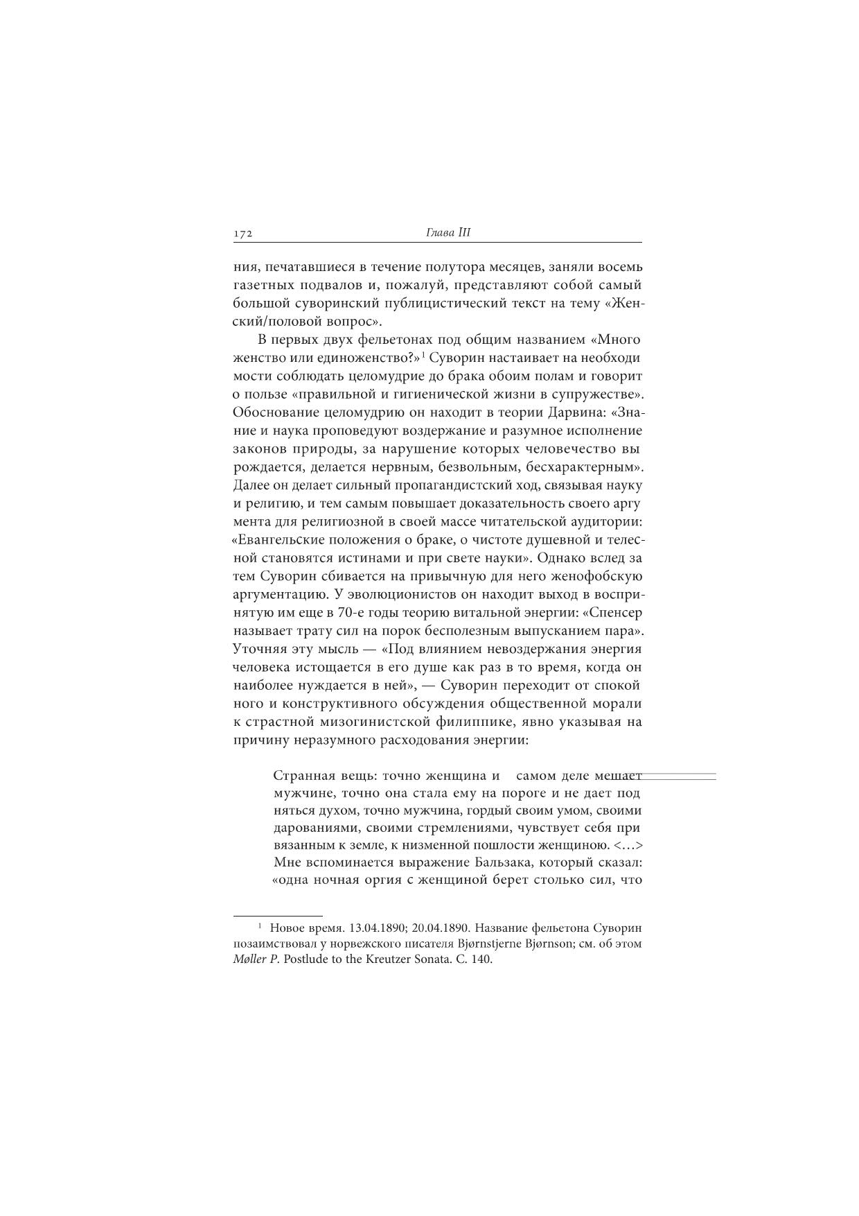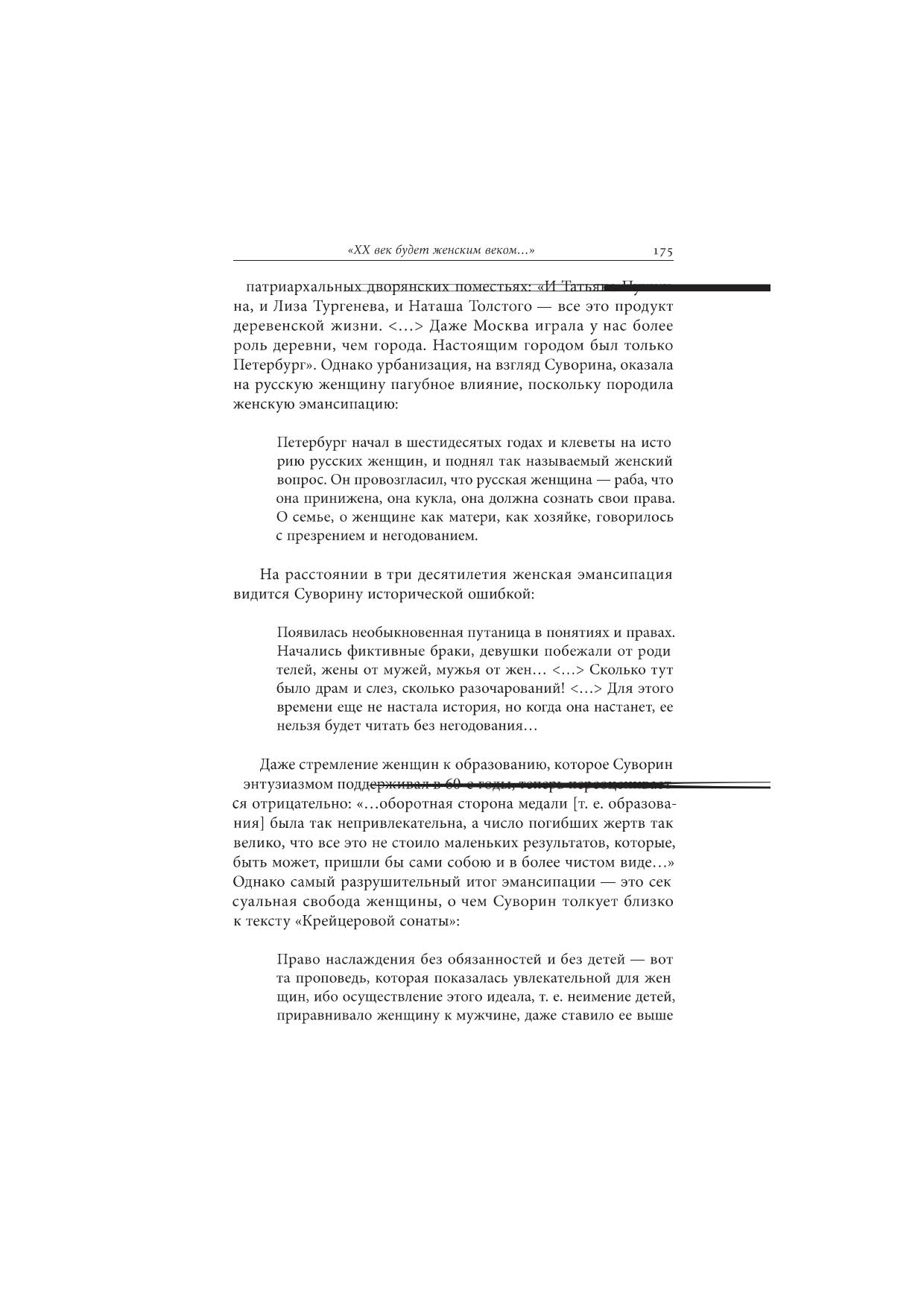 Эта книга проливает новый свет на дискуссии о женской эмансипации, которые велись в России во второй половине XIX века. В центре исследования — малоизвестные тексты Алексея Сергеевича Суворина (1834—1912), одного из самых влиятельных русских журналистов своего времени, издателя газеты «Новое время». Статьи, фрагменты дневника и писем, а также художественные произведения Суворина служат хорошим образцом для изучения менталитета разночинцев, к которым принадлежал герой книги, в том числе их взглядов на «женский вопрос». При этом позиция Суворина служит иллюстрацией двойственного восприятия набиравшего силу феминистского движения: поддерживая идеи женского образования в духе либерального дискурса, журналист отвергал идею личной свободы женщины в консервативном духе.