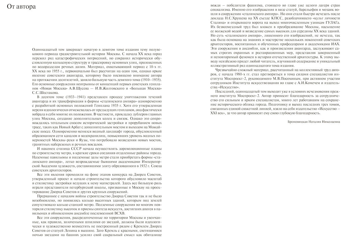 Одиннадцатый том завершает начатую в девятом томе издания тему полувекового периода градостроительной истории Москвы. С начала XX века город пережил ряд катастрофических потрясений, но сохранил исторически обусловленную кольцевую структуру и трассировку основных улиц, проложенных по водоразделам речных долин. Материал, охватывающий период с 10-х гг. XX века по 1955 г., первоначально был рассчитан на один том, однако яркое явление советского авангарда, которому было посвящено внимание автора на протяжении десятилетий, заняло большую часть девятого тома (1910-1935).