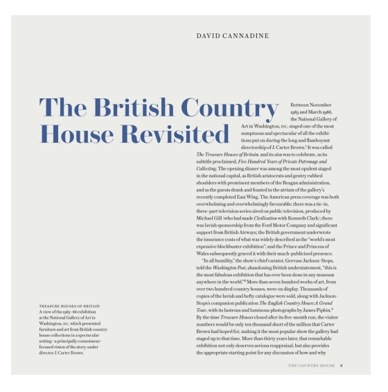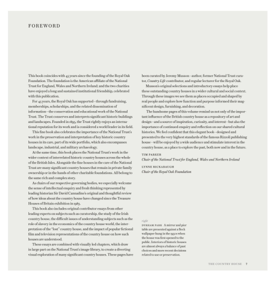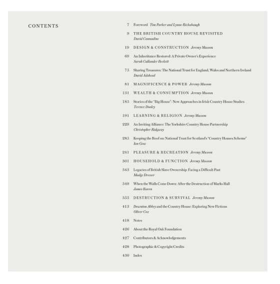 В глубоком эссе известного британского писателя и историка Дэвида Каннадайна рассказывается о том, как менялось представление о загородном доме за последние сорок лет. В дополнительных очерках рассказывается о том, как изменение ценностей двадцатого века повлияло на загородный дом, а также представлены работы таких писателей и ученых, как Сара Калландер-Беккет о частном доме, доктор Мэдж Дрессер о рабстве и загородном доме и доктор Дж. Оливер Кокс об эффекте "Аббатства Даунтон". Тексты основаны на обширных фоторепортажах, подготовленных специалистом по загородным домам Джереми Массоном (Jeremy Musson), в которых рассматриваются особенности и имидж британских загородных домов всех видов, а также истории, которые они содержат.