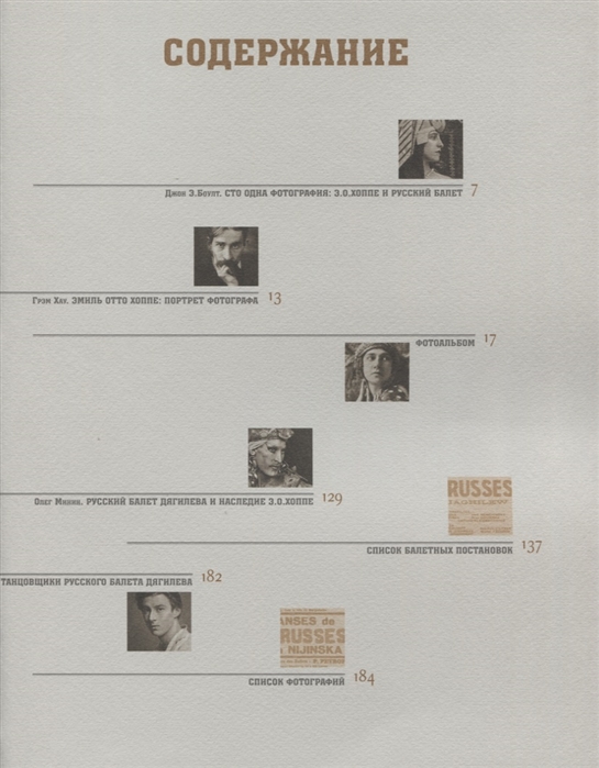 На страницах фотолетописи — студийных портретах, фотографиях сцен из спектаклей — представлены не только звёзды «Русского балета», такие как Адольф Больм, Михаил и Вера Фокины, Тамара Карсавина и Вацлав Нижинский. Здесь и другие знаменитости, которых связывали с Дягилевым не столь прочные отношения: это и Матильда Кшесинская, и Анна Павлова. Многие фотографии из архива Коллекции наследия Э.О. Хоппе публикуются впервые. Кроме того, они дают возможность познакомиться с творчеством выдающегося фотографа 1910-1930-х годов, имя которого оказалось незаслуженно забытым.