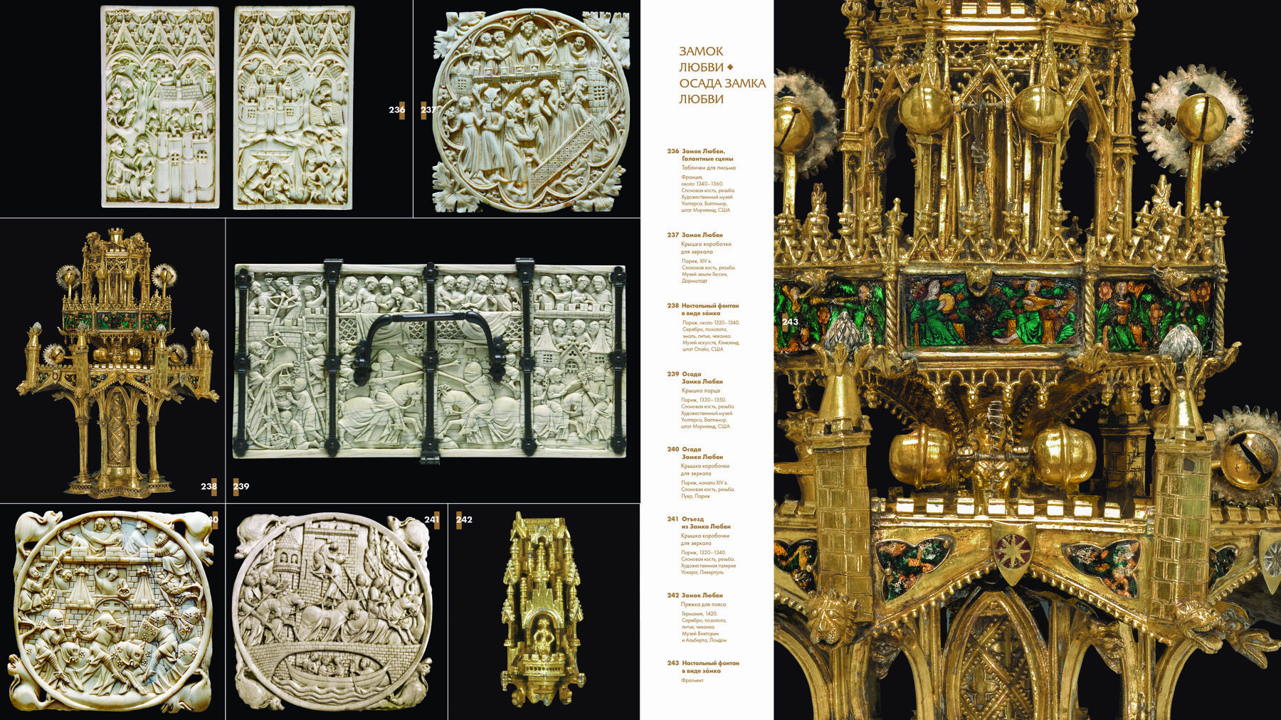 Художественные памятники, характерные для эпохи прекрасных дам и благородных рыцарей, ценящих красоту и роскошь, рассматриваются в контексте их исторического и культурного значения. Они оживают в жилых интерьерах, где находят своё воплощение герои рыцарских романов, сюжеты кельтских и германских легенд, а также поэтические аллегории куртуазной любви.