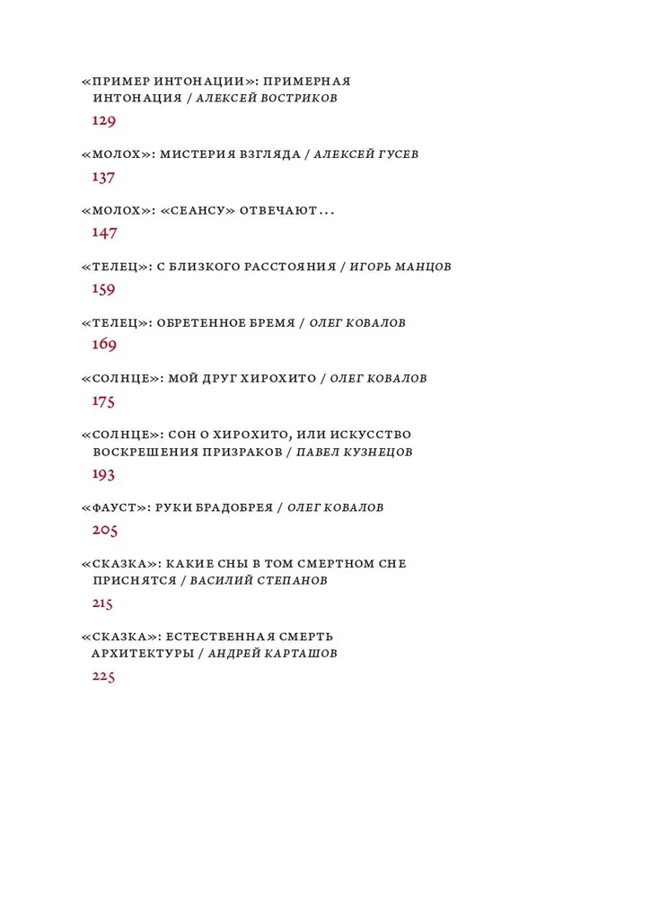 В декабре 2024 года Александр Сокуров дал мастер‑класс для студентов онлайн‑школы журнала «Сеанс»; его расшифровка легла в основу этого издания. Школа «Сеанс» — новый этап в жизни петербургского издательства, авторы которого больше тридцати лет пишут о кино и времени. Задача школы — сформировать новое поколение сценаристов, редакторов, кураторов и кинокритиков. В сердце учебной программы — курсы лекций по истории ХХ века: истории искусства, истории идей, истории общества, истории человека. В соответствии с этим выбрана и тема мастер‑класса Александра Сокурова: мы говорим о фильмах «Тетралогии власти» («Молох», «Телец», «Солнце» и «Фауст»), которая аккумулирует самые болезненные вопросы и конфликты XX столетия.