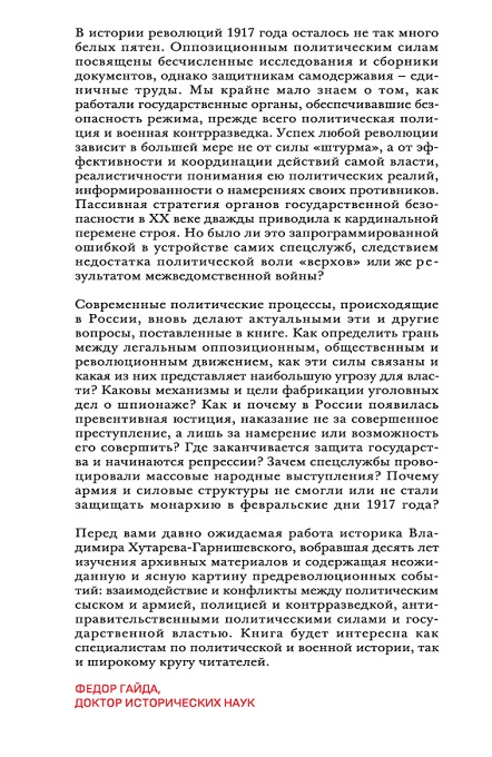 Февральская революция 1917 г. разделила русскую историю на два огромных пласта. Российское общество до сих пор в латентной фазе переживает последствия порожденной расколом Гражданской войны. Историки в своих исследованиях пытаются понять механизм падения монархии, породивший невиданный социальный взрыв, который изменил ход отечественной и мировой истории. Цель данного исследования — ответить на наиболее острые вопросы: было ли руководство МВД готово наладить работу политической полиции и эффективно пользоваться ее плодами, была ли способна власть в годы Первой мировой войны сформулировать приоритетные задачи жандармерии, обеспечить ее необходимой материальнотехнической и нормативной базой, обладал ли личный состав спецслужб необходимыми качествами и подготовкой для выполнения поставленных задач? В книге рассматривается деятельность политического сыска России по поддержанию государственной безопасности в оперативном взаимодействии с политическими и военными властями империи.