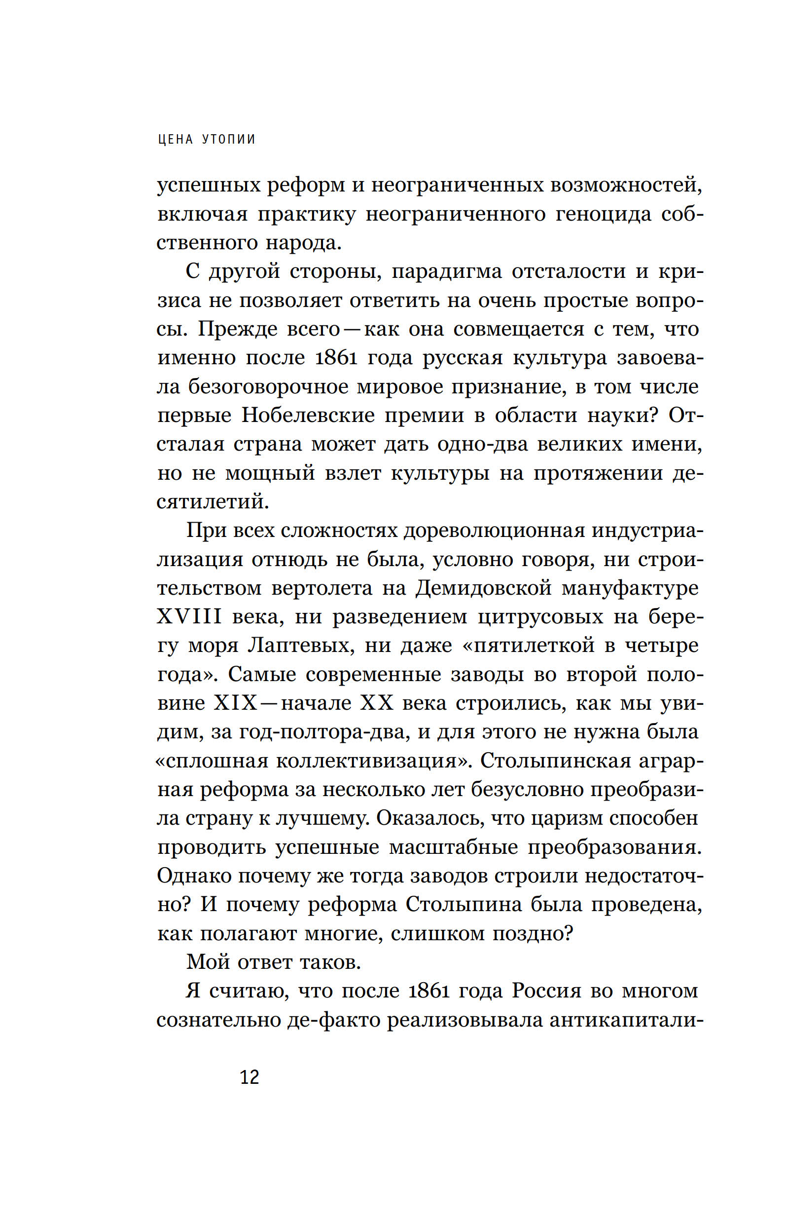 Почему все попытки модернизации и либерализации России за последние 160 лет заканчивались неудачей? Этот ключевой для нашей истории вопрос ставит в своей книге Михаил Давыдов. Чтобы попытаться на него ответить, автор предлагает обратиться ко второй половине XIX века — времени, когда, по его словам, Россия пыталась реализовать первую в своей истории антикапиталистическую утопию. Власть и часть общества соглашались, что в индустриальную эпоху можно быть «самобытной» великой державой, то есть влиять на судьбы мира, принципиально отвергая все, за счет чего конкуренты и противники добились процветания, и в первую очередь — общегражданский правовой строй и соответствующие права всех слоев населения. В итоге в начале ХХ века Российская империя была единственной мировой державой, которая обходилась без парламента и на которую не распространялось понятие правового государства. Какие социально-экономические процессы помогли сформировать эту утопию? Как Витте и Столыпину удалась модернизация страны и почему, по мнению автора, она происходила вопреки активному противодействию элит? И самое главное: как эта утопия предопределила судьбу страны на много лет вперед?