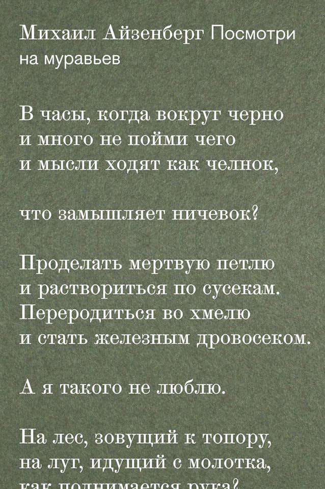 В стихах Михаила Айзенберга с нами как будто говорит не привычное лирическое «я», но скрытые силы самого языка — на наших глазах из средства описания мира язык претворяется в его полноправную часть, такую же, как дерево или воздух, и обретает собственный голос. Вот почему в этих стихах всегда столько нового для нас: у языка есть свое знание о мире, у Айзенберга оно становится достоянием человека.