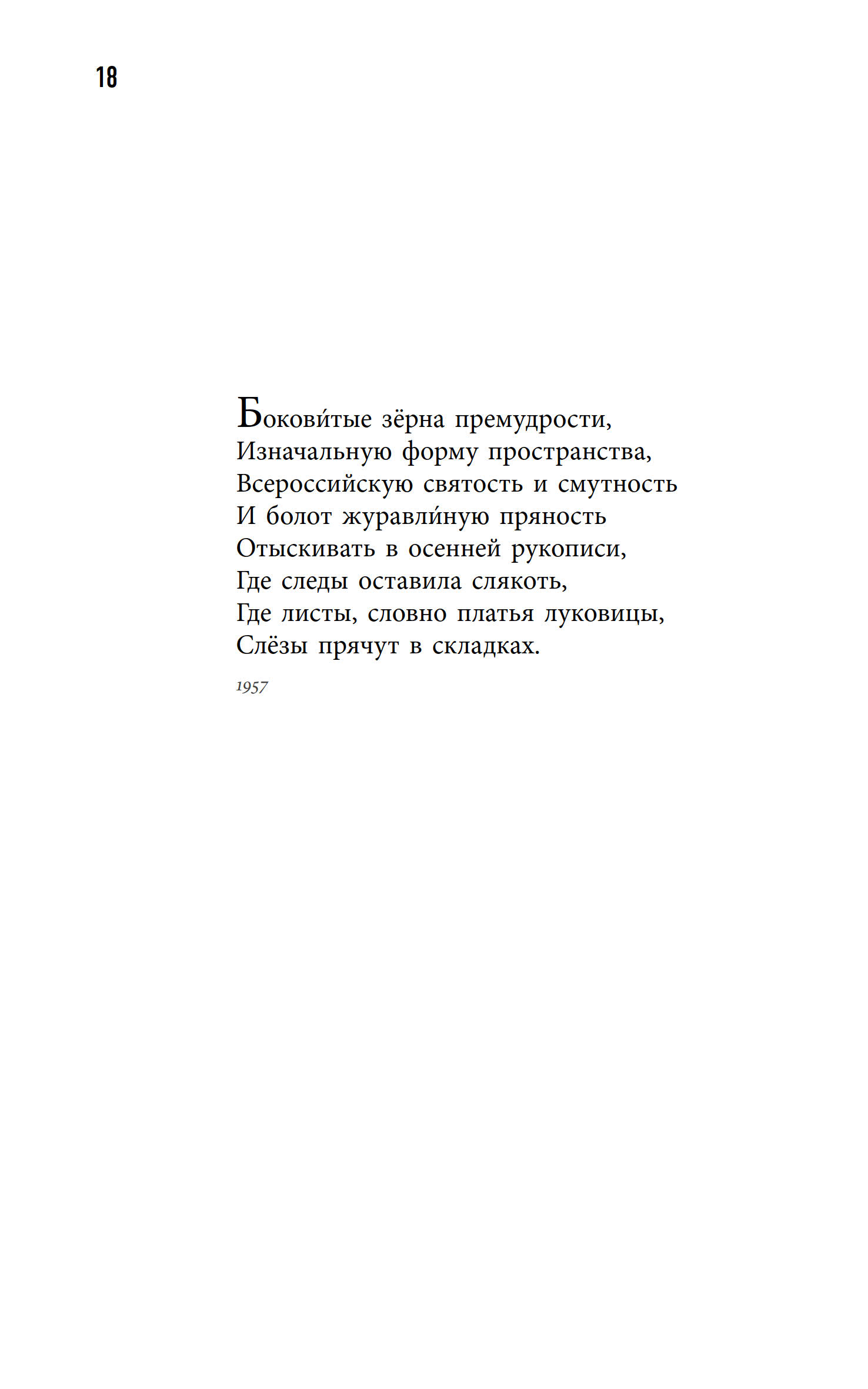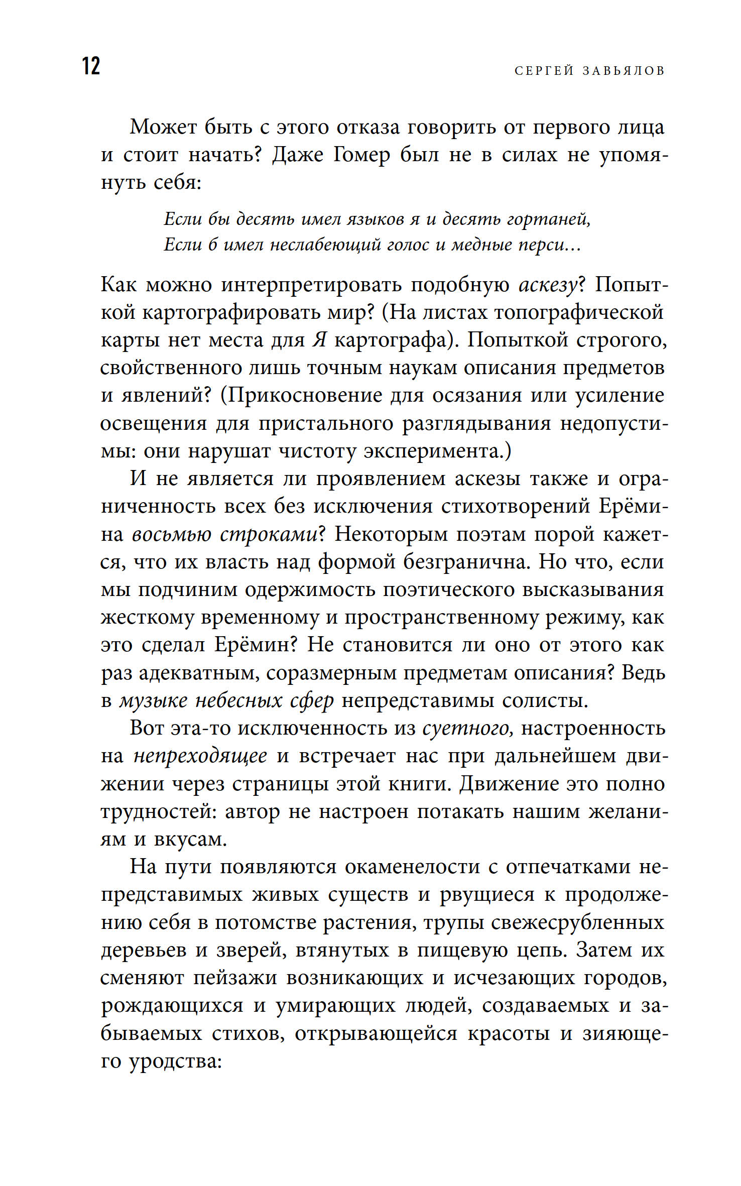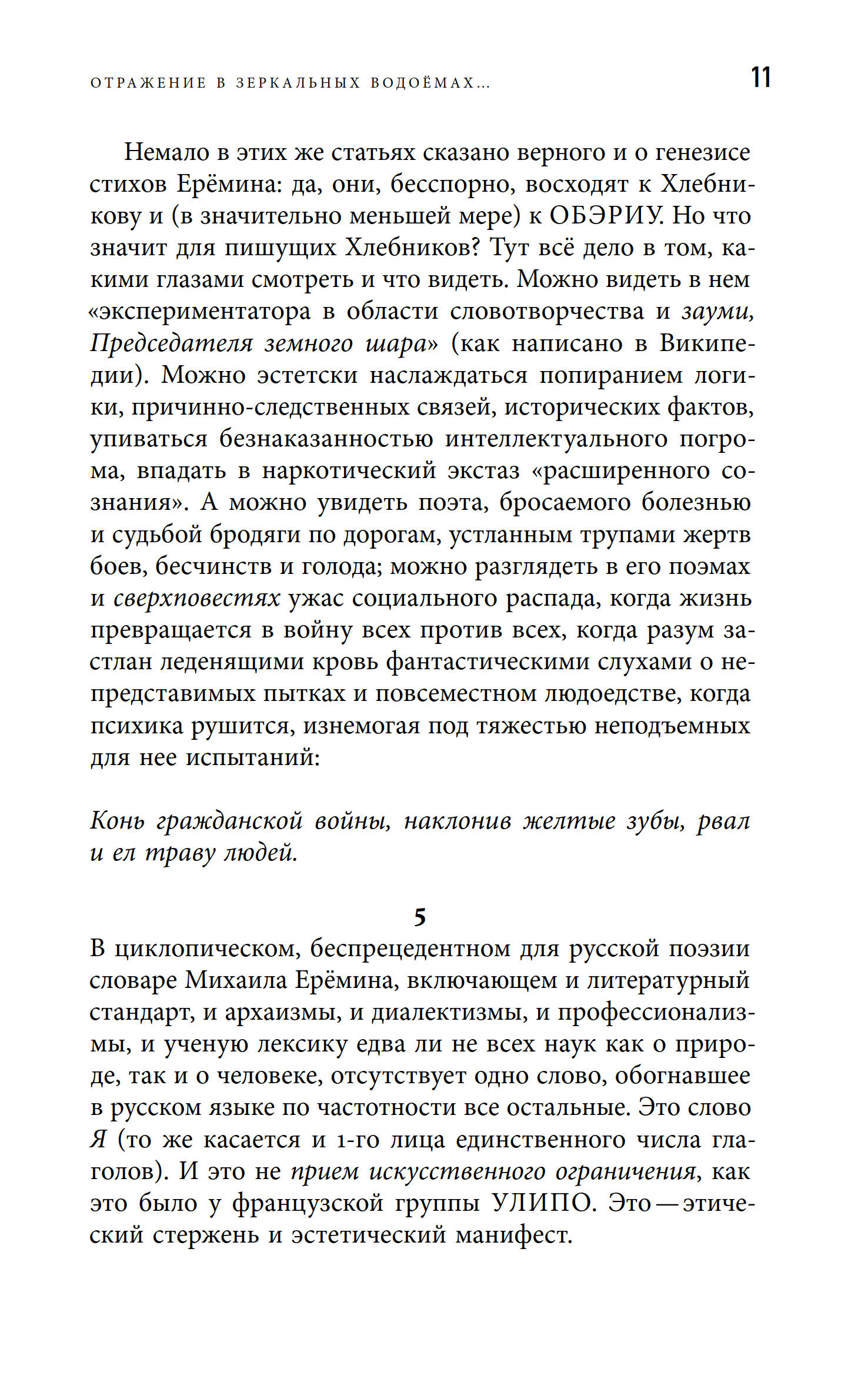 В настоящем томе впервые собраны стихотворения Ерёмина 1957–2020 годов и переводы, без которых непонятны многие особенности его оригинальной поэтики. Визитная карточка поэта — «свернутый» в миниатюру-восьмистишие полифонический образ, чувственная сторона которого дополняется насыщенной интеллектуальной составляющей (комментарии, реминисценции, расширение поэтического словаря научными терминами и условными символами естественных наук). Это своеобразная натурфилософская лирика, обновленная благодаря обращению к опыту русского и англо-американского модернизма, к античной традиции развернутых метафор и средневековой ученой поэзии.