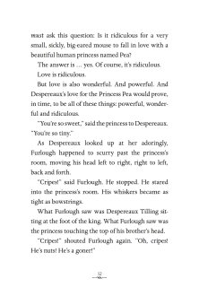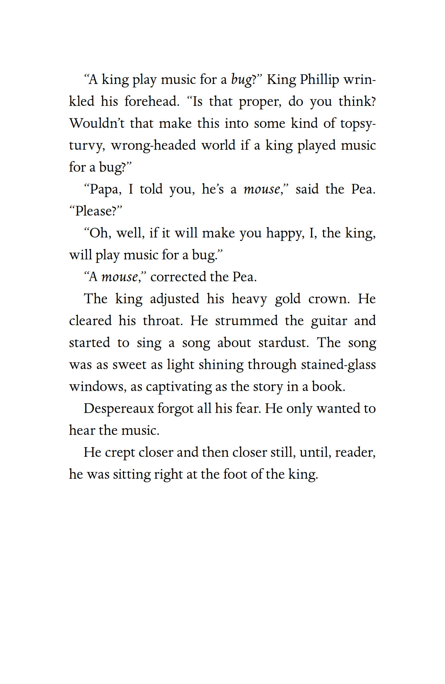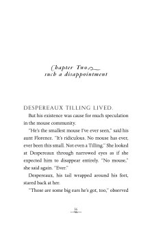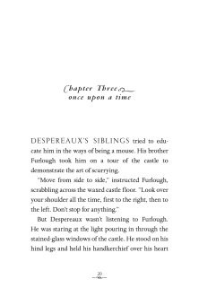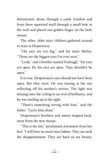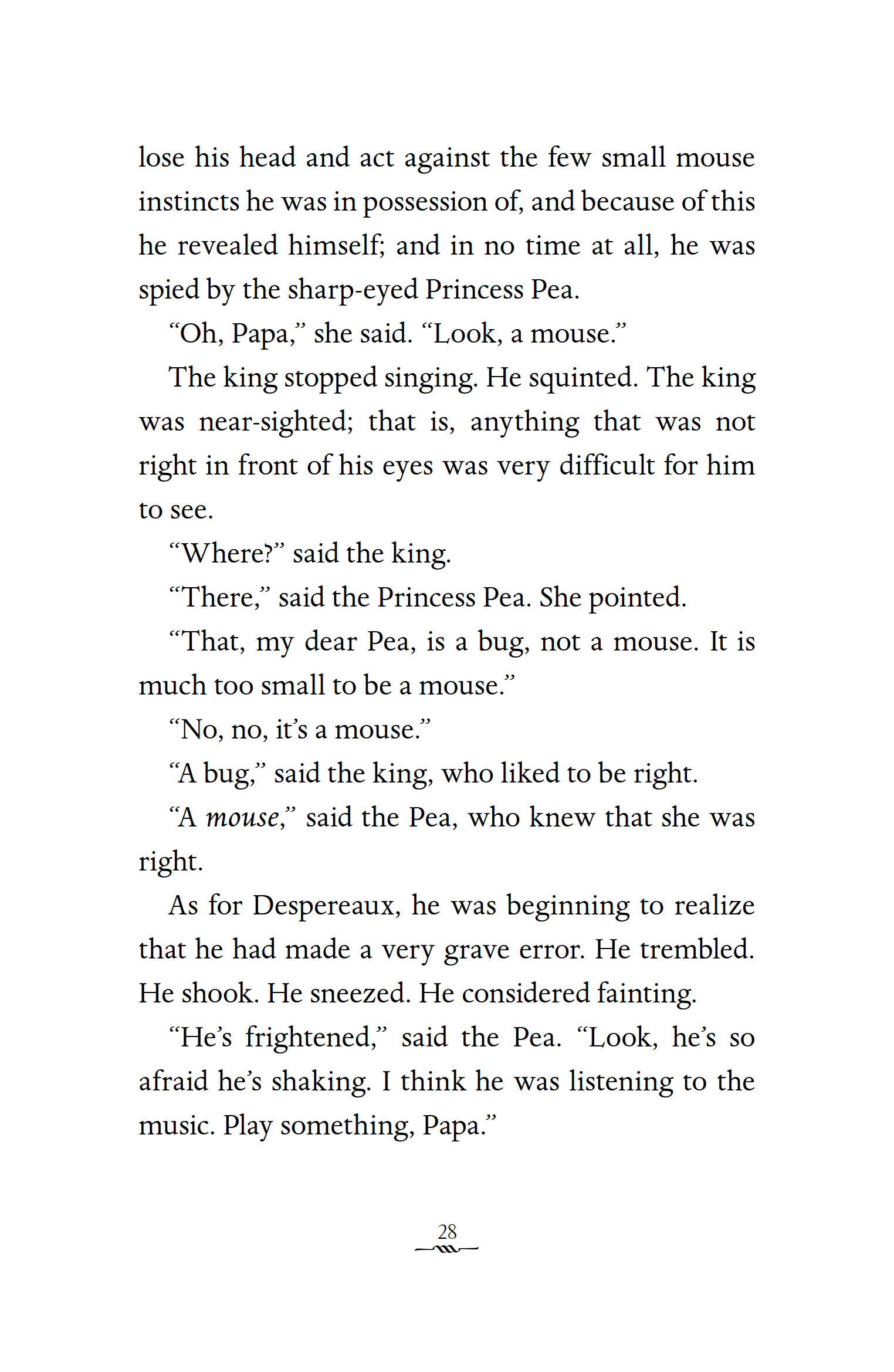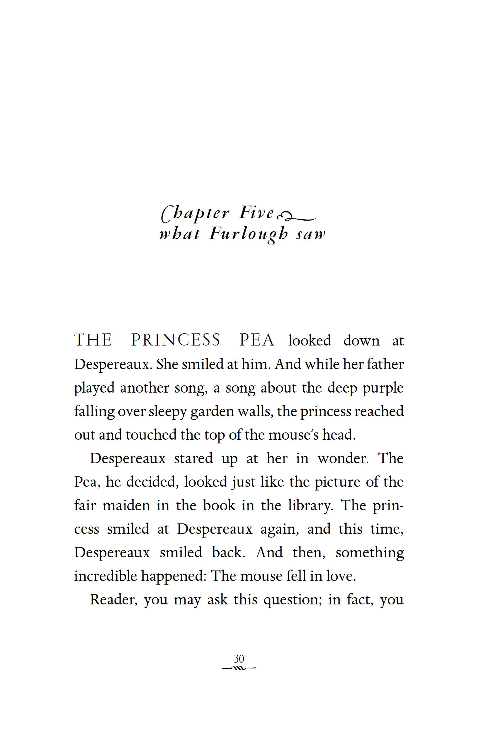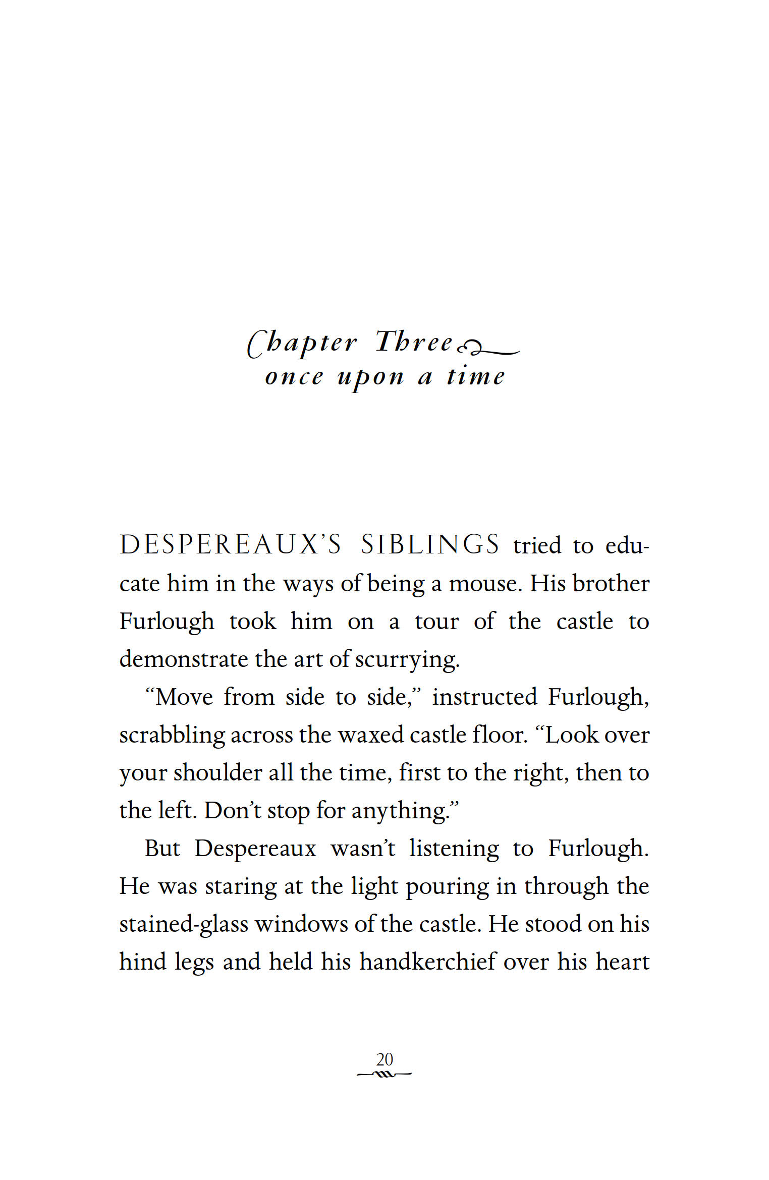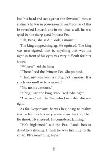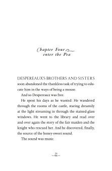Welcome to the story of Despereaux Tilling, a mouse who is in love with music, stories, and a princess named Pea. It is also the story of a rat called Roscuro, who lives in the darkness and covets a world filled with light. And it is the story of Miggery Sow, a slow-witted serving girl who harbors a simple, impossible wish.