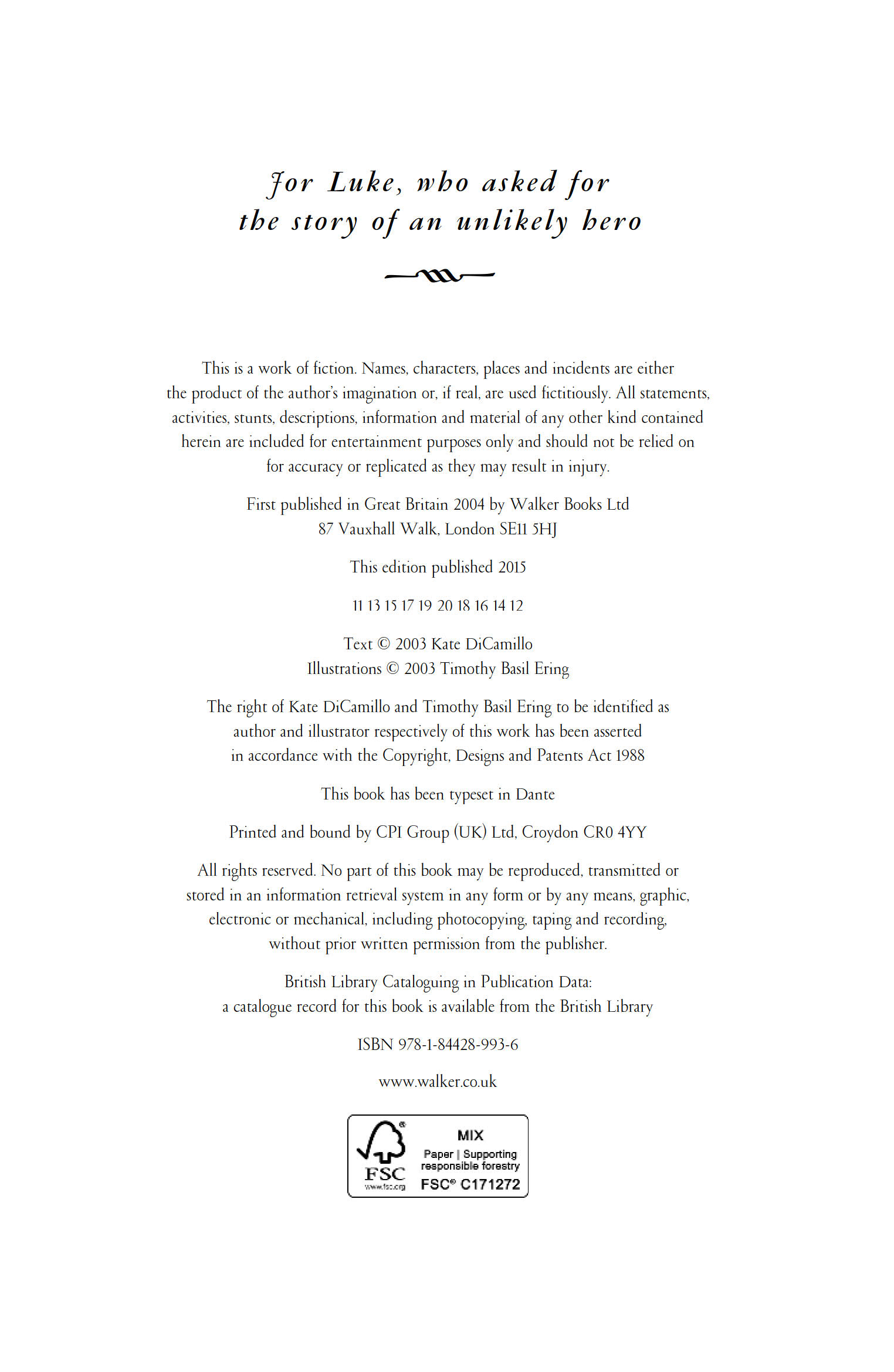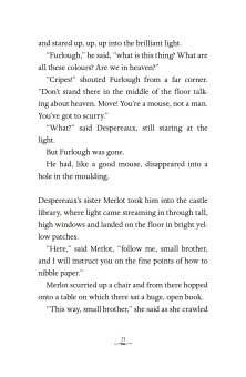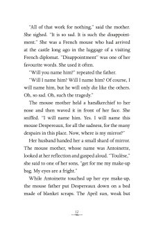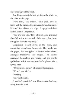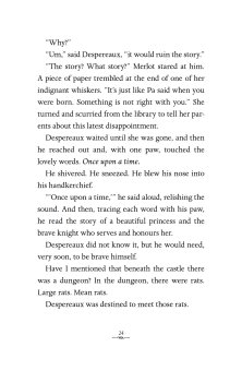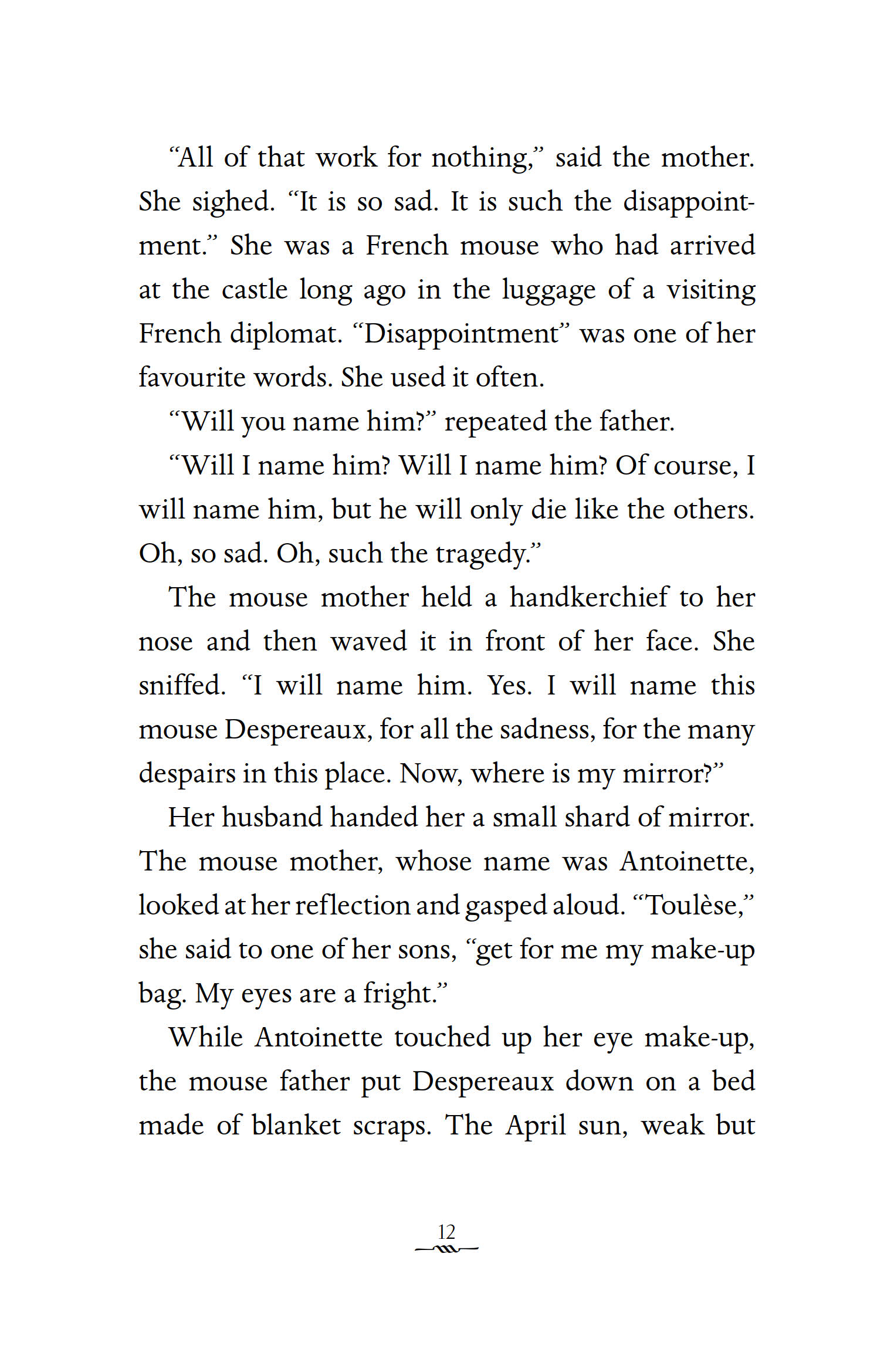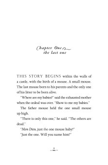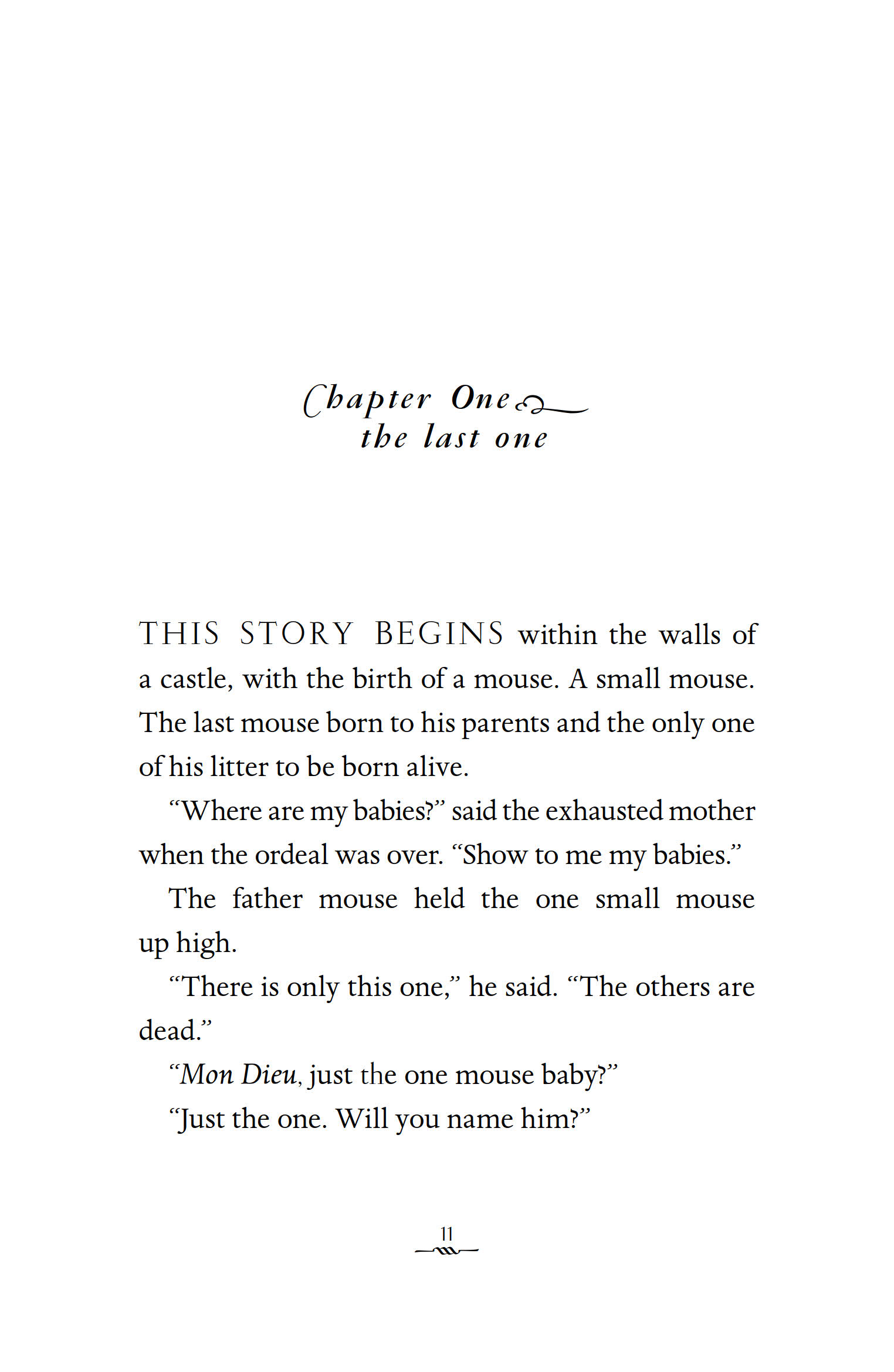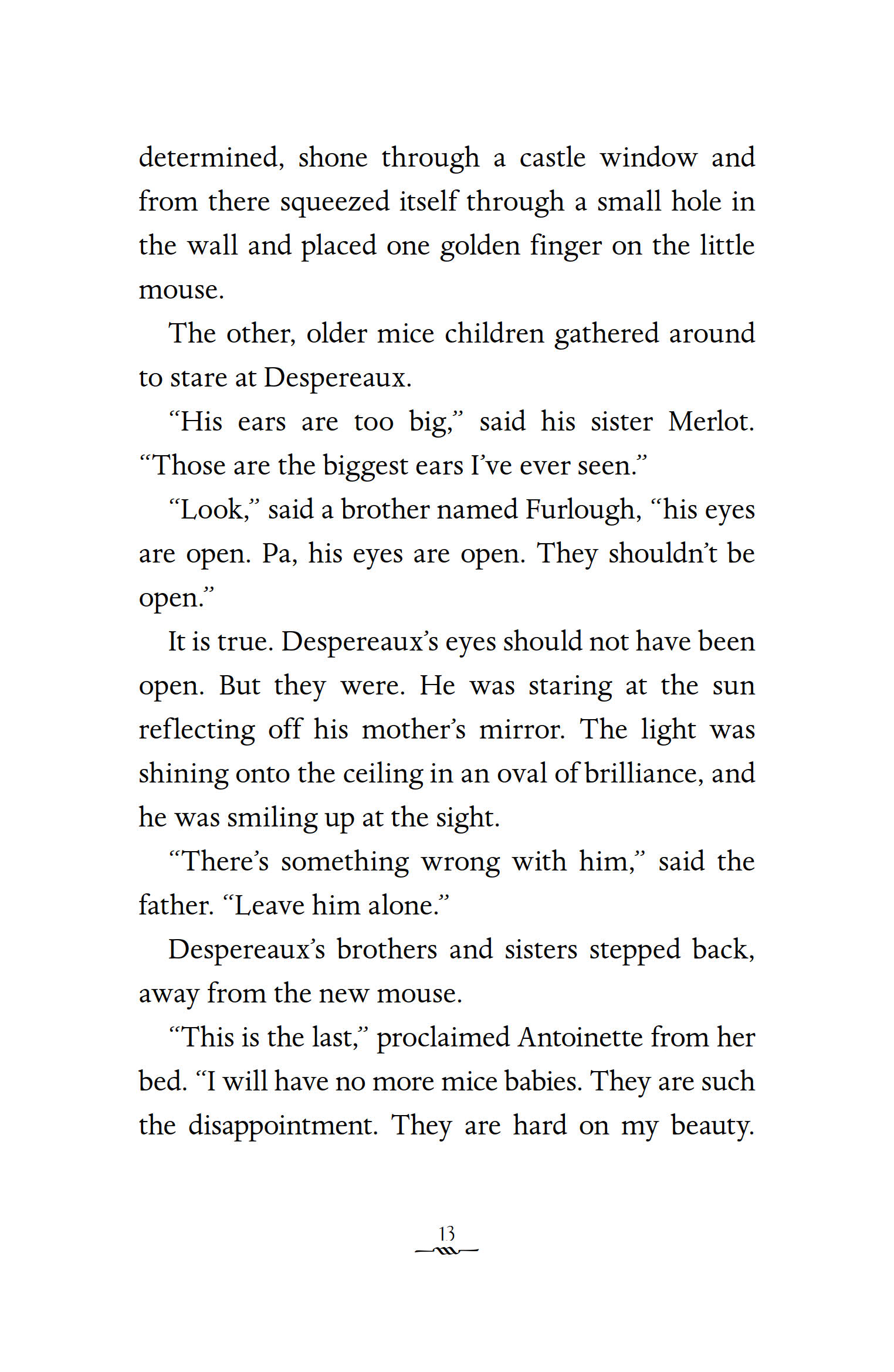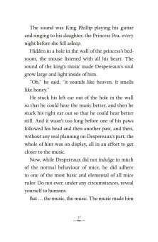 Welcome to the story of Despereaux Tilling, a mouse who is in love with music, stories, and a princess named Pea. It is also the story of a rat called Roscuro, who lives in the darkness and covets a world filled with light. And it is the story of Miggery Sow, a slow-witted serving girl who harbors a simple, impossible wish.