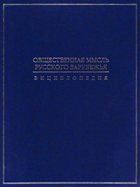 Энциклопедия «Общественная мысль Русского зарубежья» - научно-справочное издание, ставящее целью проследить развитие отечественной общественной мысли в хронологических рамках всех волн эмиграции с середины XIX в. по настоящее время. Отдельные статьи посвящены вопросам общего характера: географии общественной мысли Русского зарубежья, важнейшим направлениям, концепциям и теориям общественного развития, раскрывающим мировоззренческие представления лучших умов российской эмиграции, социально-политические идеалы ее различных слоев и страт. Основной массив составляют статьи о выдающихся представителях интеллектуальной элиты российского общества, оказавшихся в силу различных обстоятельств вне пределов Отечества.