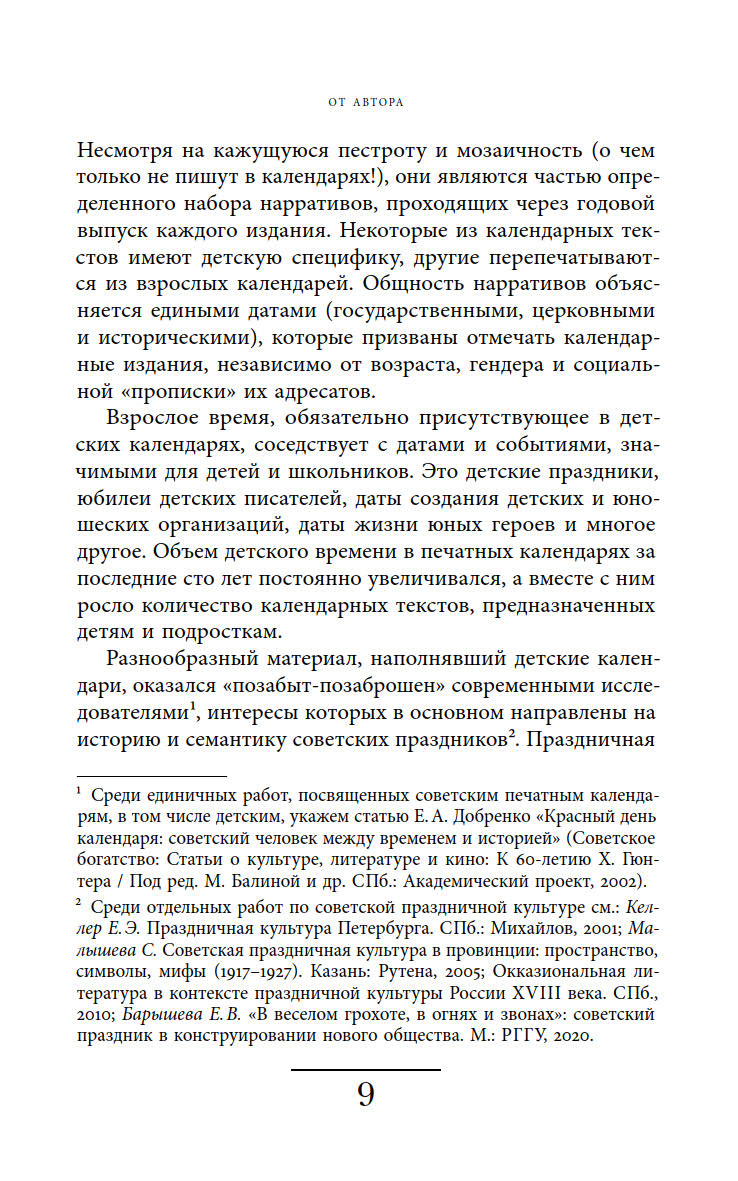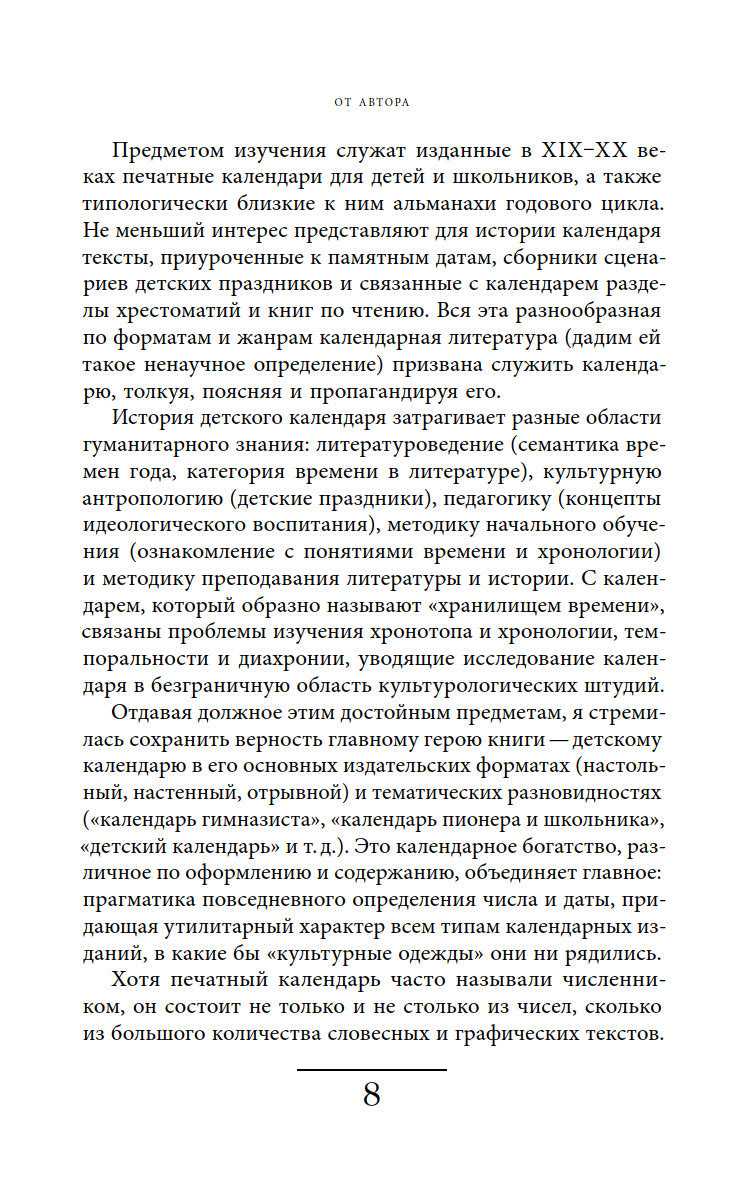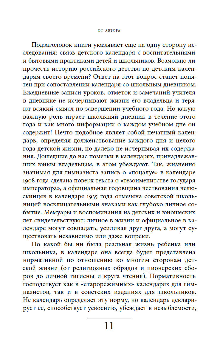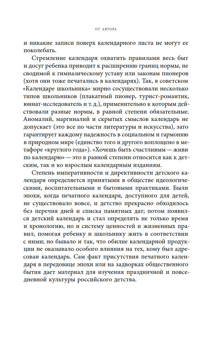 Книга Марины Костюхиной, собравшая уникальный материал, представляет собой исследование о календарях, их авторах и читателях. В ней представлены интересные факты, полезные советы и пафосные лозунги, которые дополняли даты и дни недели. Рассматривая календари в контексте разных эпох, автор показывает, как в этом культурном объекте сочетаются реальная история российского и советского детства и нормативные представления о нём.