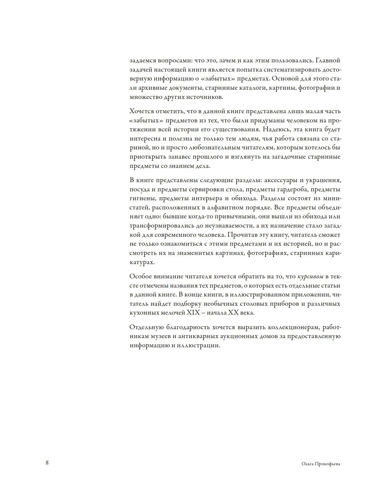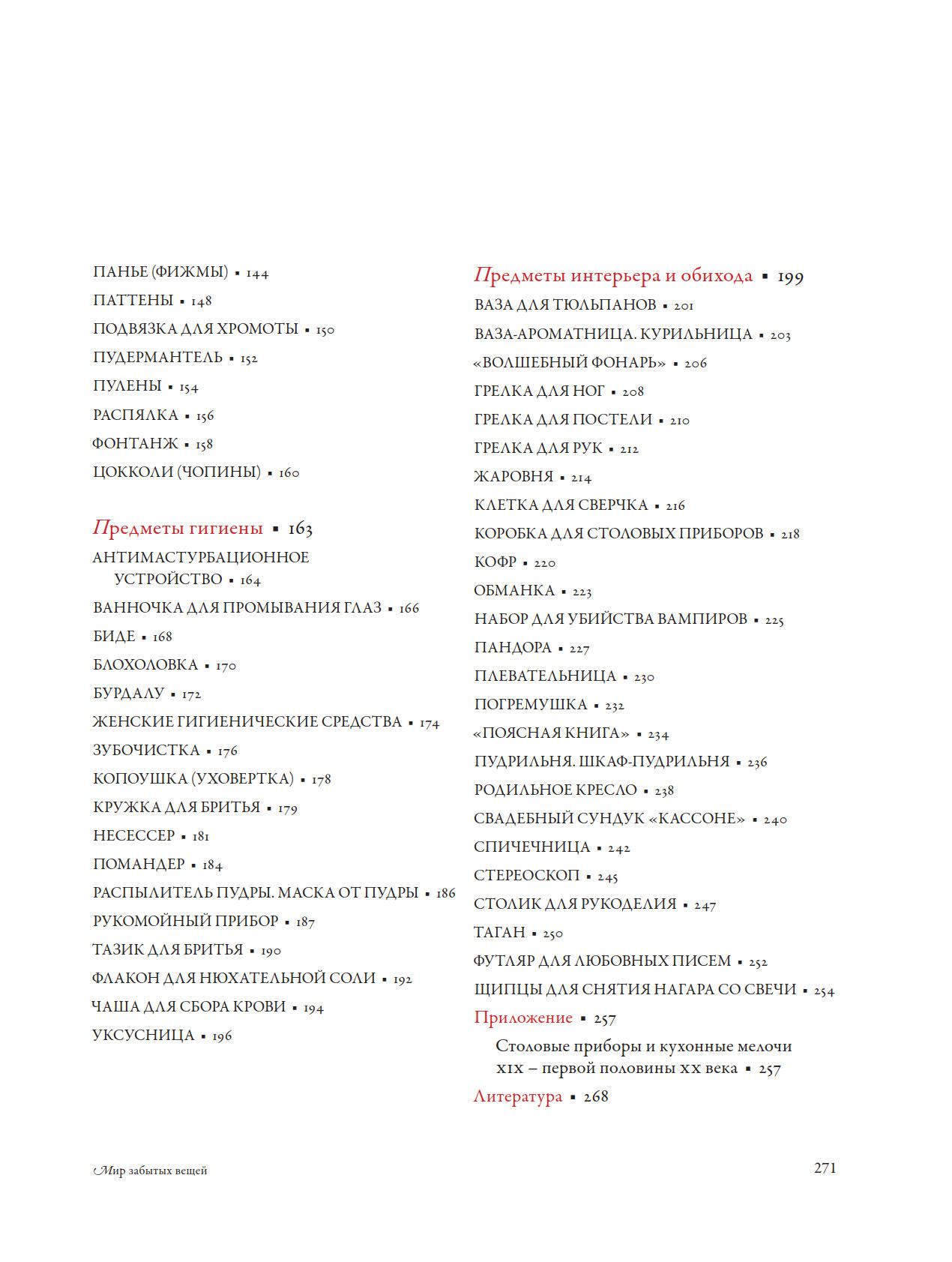 Эта книга посвящена вещам, которые были привычными в прошлом, но сейчас вызывают у нас недоумение. Она представляет собой попытку систематизировать знания о том, как жили люди в былые времена: что они ели, как одевались, какими предметами быта пользовались. Речь идёт о вещах, которые человечество изобретало на протяжении веков, но которые затем были «забыты» из-за появления более совершенных аналогов или из-за того, что они стали ненужными. Сегодня мало кто знаком с такими предметами, как копоушка, косник, карне-де-баль, тремблез, пандора и братина, хотя когда-то они были неотъемлемой частью повседневной жизни. Многие из этих артефактов можно увидеть на полотнах старых мастеров, в антикварных лавках и на рынках, а также в музеях и коллекциях.