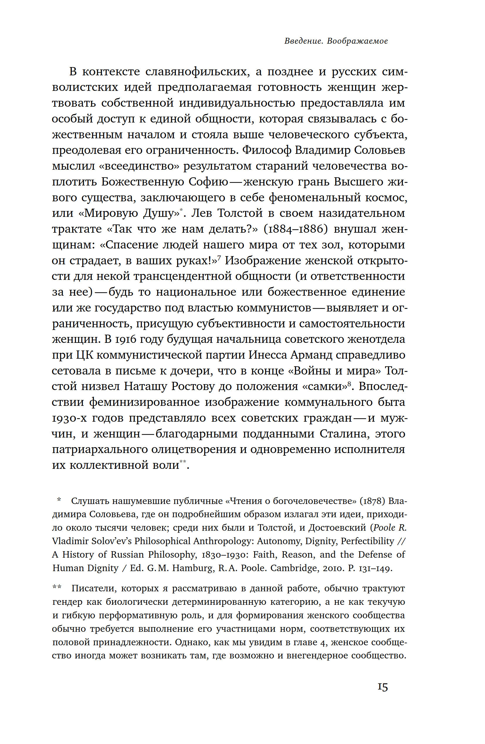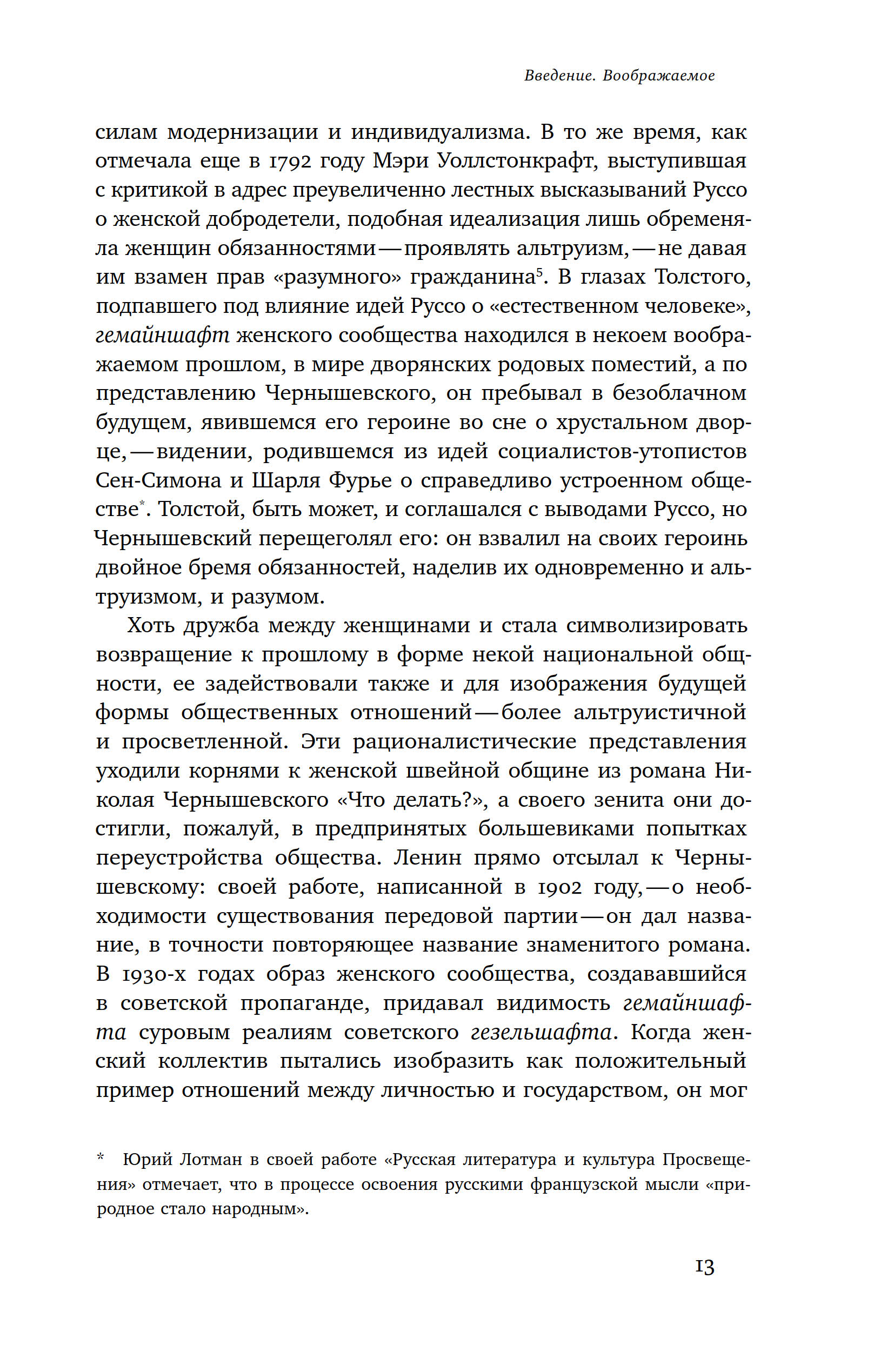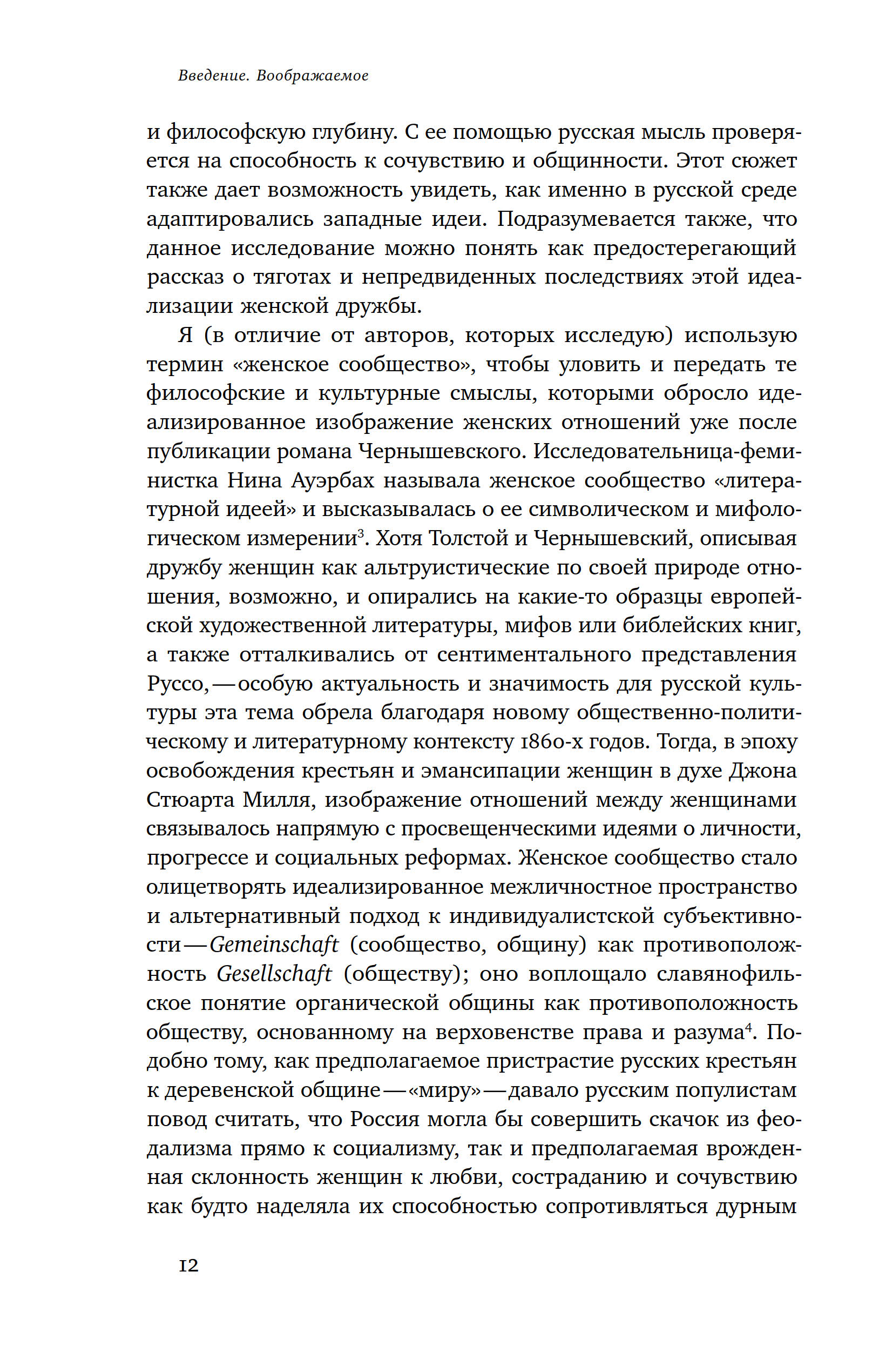 Вторая половина XIX века в русской истории стала временем активного конструирования утопических социальных моделей, а начало XX века целиком было посвящено попыткам воплощения этих моделей в жизнь. В философских и литературных дискуссиях того времени важное место занимал образ идеальных отношений между женщинами: многие авторы, и среди них Толстой, Чернышевский, Чехов, изображали женское сообщество как силу, способную содействовать положительным переменам в обществе. До эпохи реализма женская дружба редко удостаивалась внимания авторов, но, начиная с романов «Что делать?» и «Война и мир», она обретает философскую глубину и становится самостоятельной линией повествования. Исследование Энн Икин Мосс посвящено способам изображения такой идеализированной дружбы — автор демонстрирует, какое место этот образ занимает в русской мысли и прослеживает, как он меняется на протяжении нескольких эпох, заканчивая свой анализ обращением к сталинскому кино.