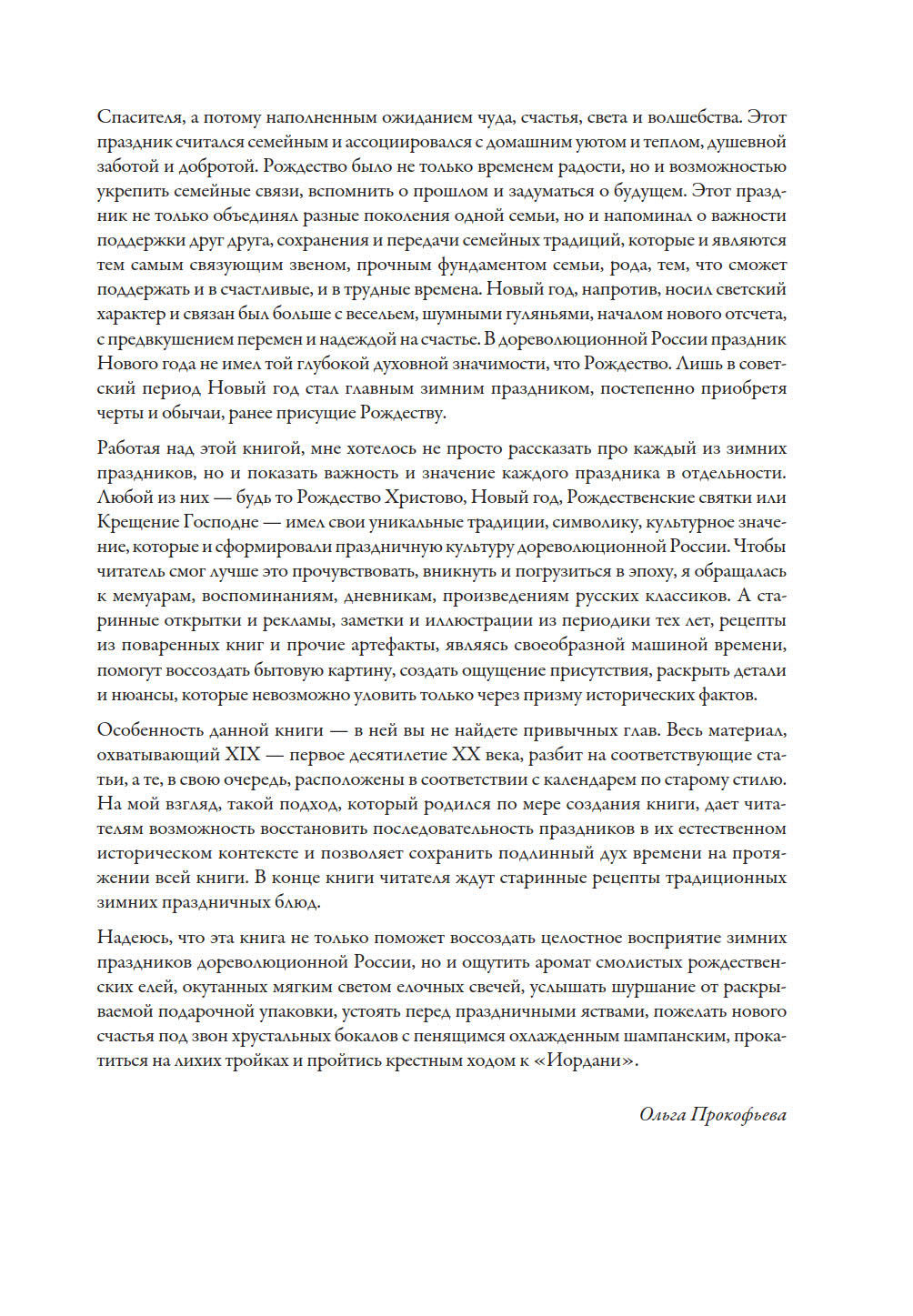 Рождество и Новый год, несмотря на то что их даты расположены близко друг к другу в календаре, имеют совершенно разные исторические истоки, традиции и обычаи, которые складывались на протяжении веков. Рождество всегда было религиозным праздником, символизирующим рождение Спасителя, и поэтому наполнено ожиданием чуда, радости, света и волшебства. В то же время Новый год носил светский характер, связанный с весельем, шумными празднествами, началом нового отсчета времени и надеждой на счастье. В данной книге Ольга Прокофьева не просто описывает Рождество Христово, Новый год, Рождественские святки или Крещение Господне, но и раскрывает их уникальные традиции, символику и культурное значение, которые формировали праздничные обычаи дореволюционной России.