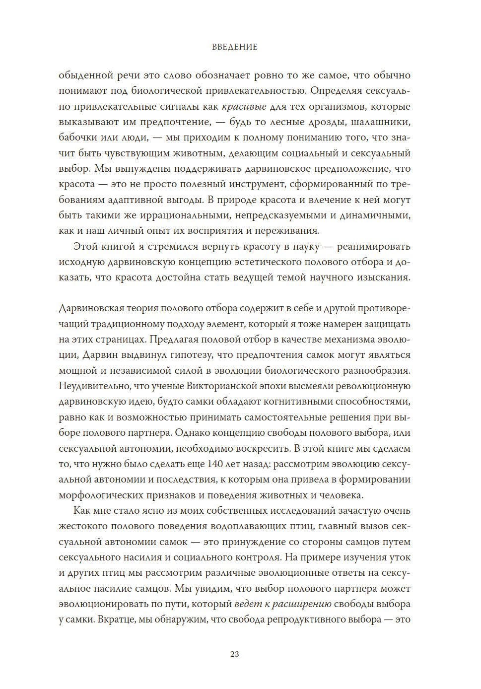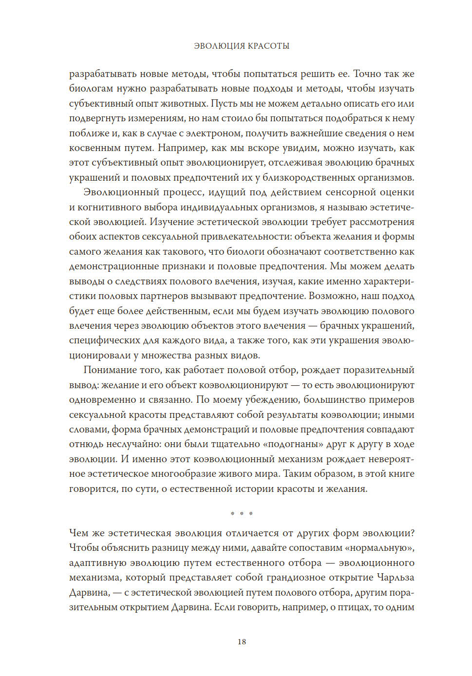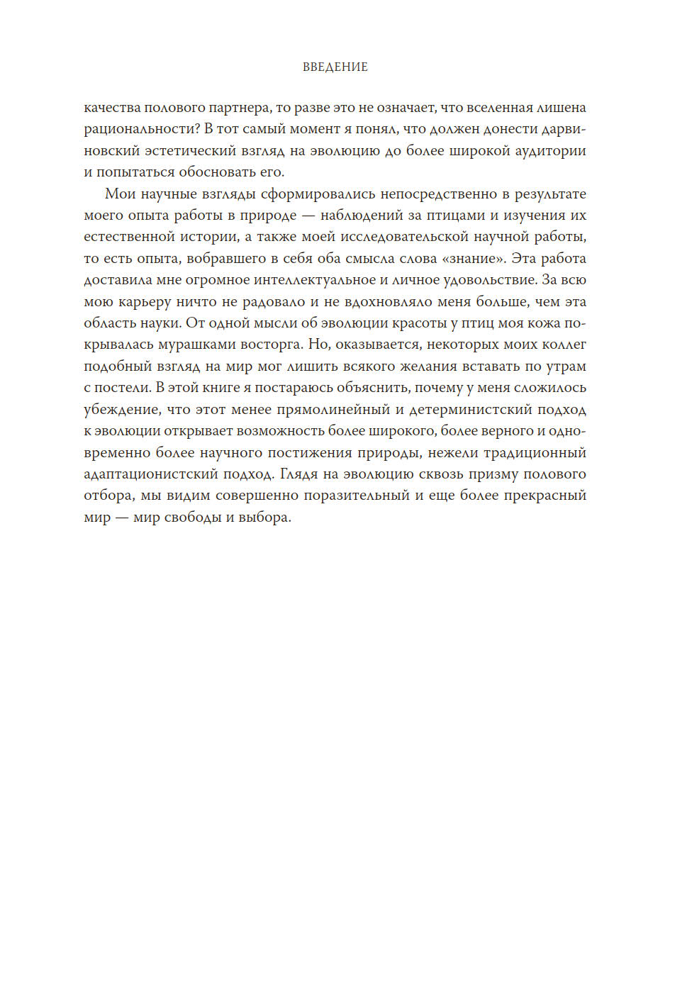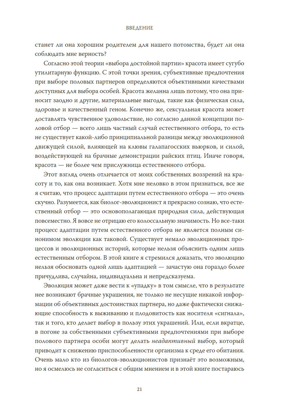 Тот же эстетический принцип вносит свою лепту в эволюцию всех живых существ, включая человека. Привлекательный признак формируется поколение за поколением и в итоге становится определяющим для вида. В книге описаны десятки примеров эволюционных изменений, обусловленных, судя по всему, исключительно тягой живых существ к прекрасному, будь то визуальные, слуховые или тактильные ощущения. Также на страницах вы найдете цветные иллюстрации из мира дикой природы.