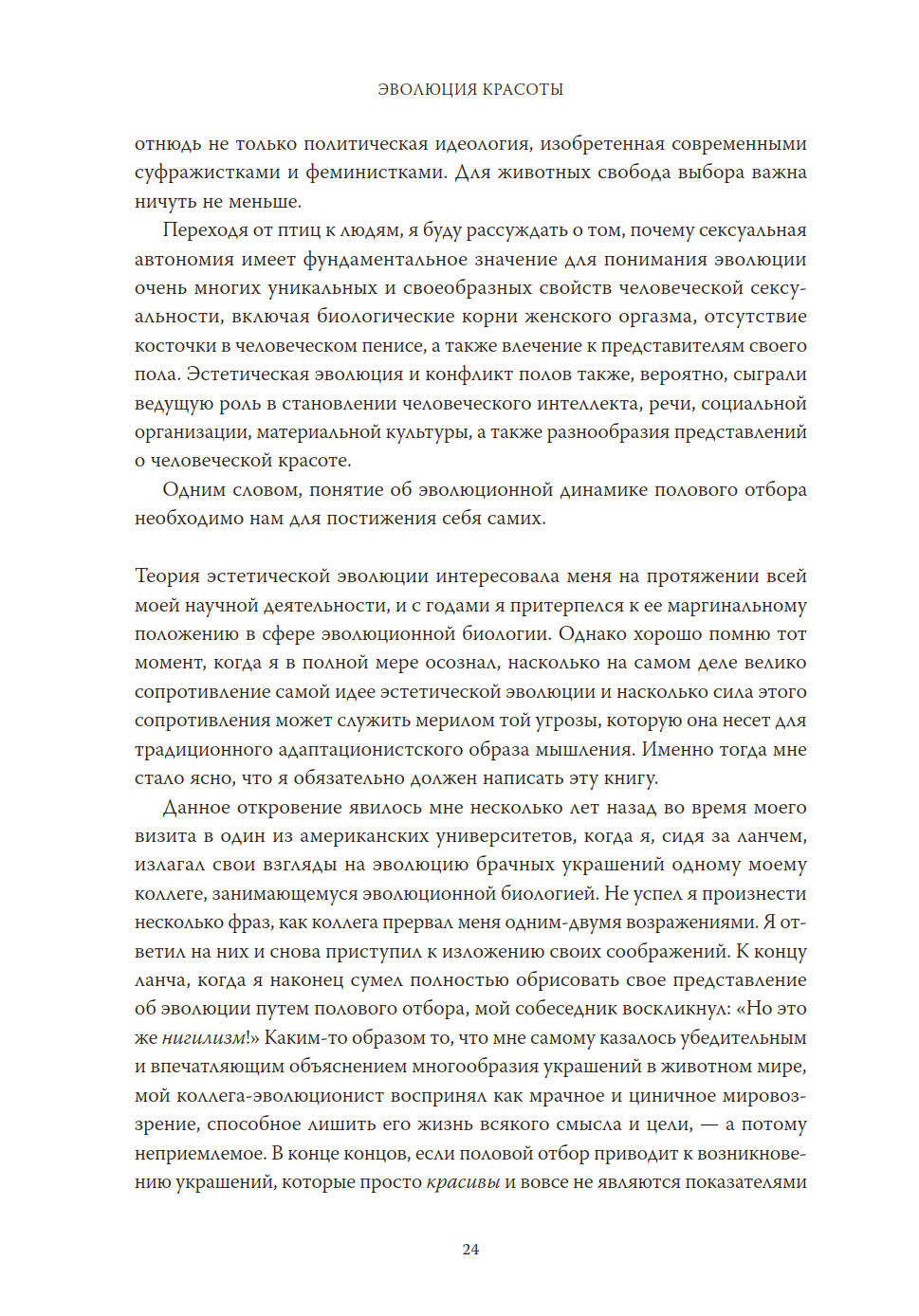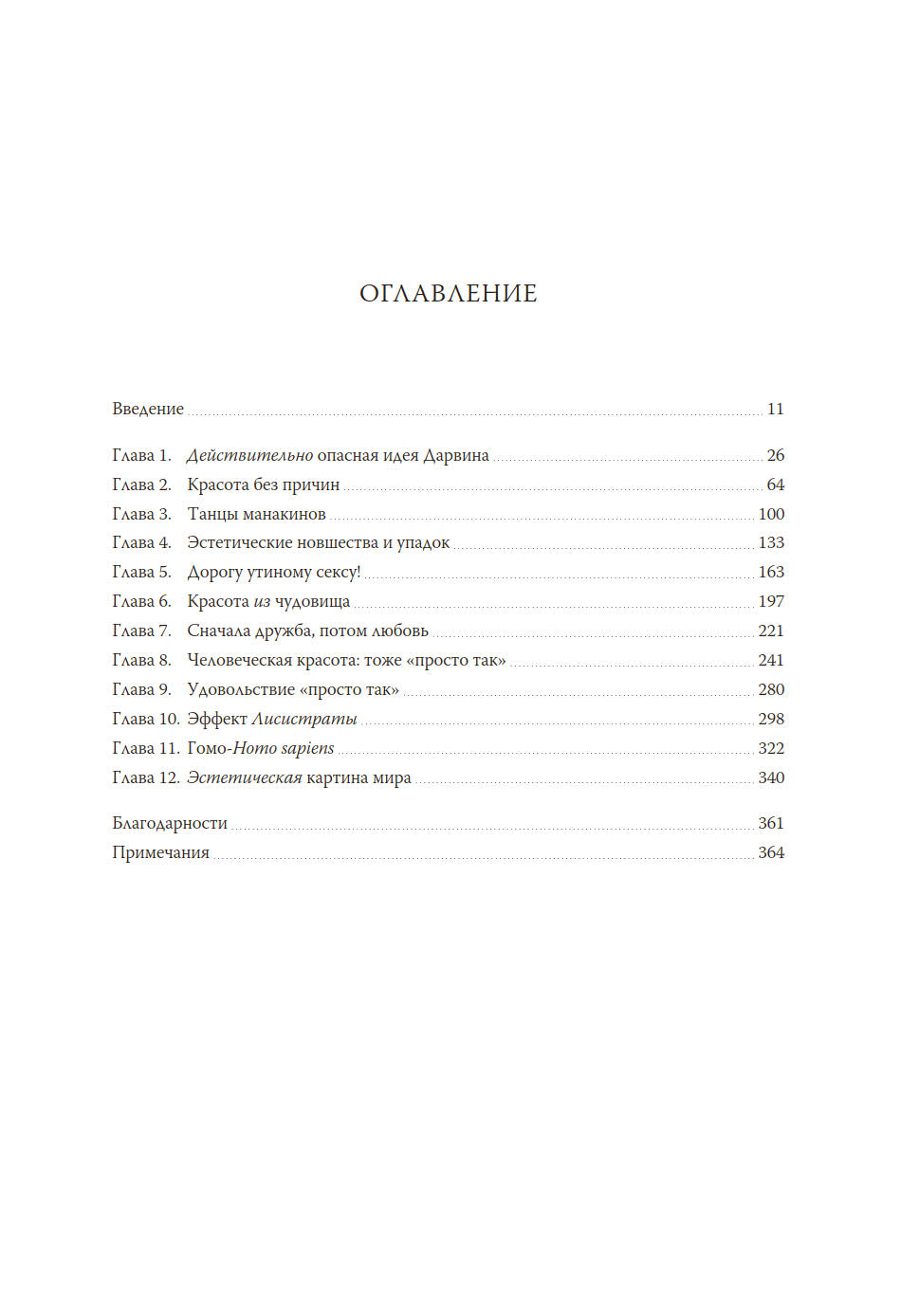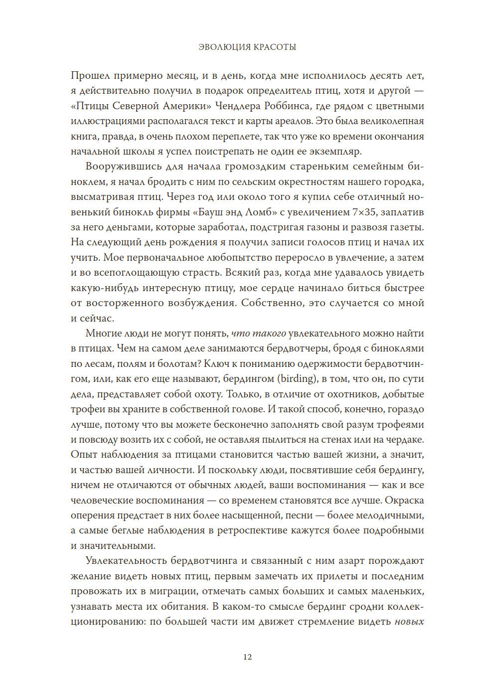 Тот же эстетический принцип вносит свою лепту в эволюцию всех живых существ, включая человека. Привлекательный признак формируется поколение за поколением и в итоге становится определяющим для вида. В книге описаны десятки примеров эволюционных изменений, обусловленных, судя по всему, исключительно тягой живых существ к прекрасному, будь то визуальные, слуховые или тактильные ощущения. Также на страницах вы найдете цветные иллюстрации из мира дикой природы.