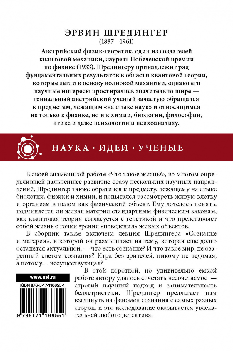 В этой короткой, но удивительно емкой работе автору удалось сочетать несочетаемое — строгий научный подход и занимательность беллетристики. Шрёдингер предлагает нам взглянуть на феномен сознания с самых разных сторон, и это исследование оказывается увлекательней любого детектива.
