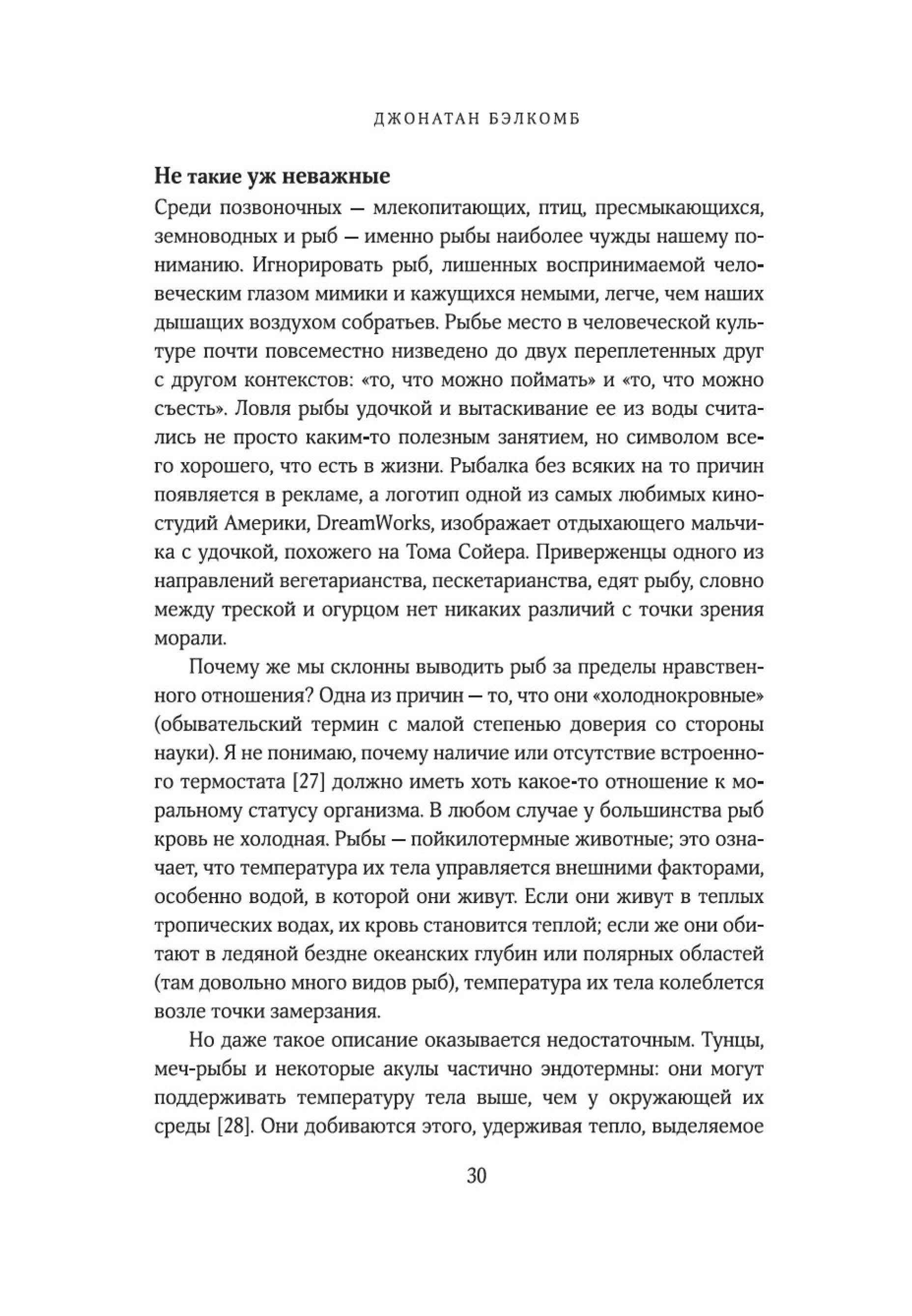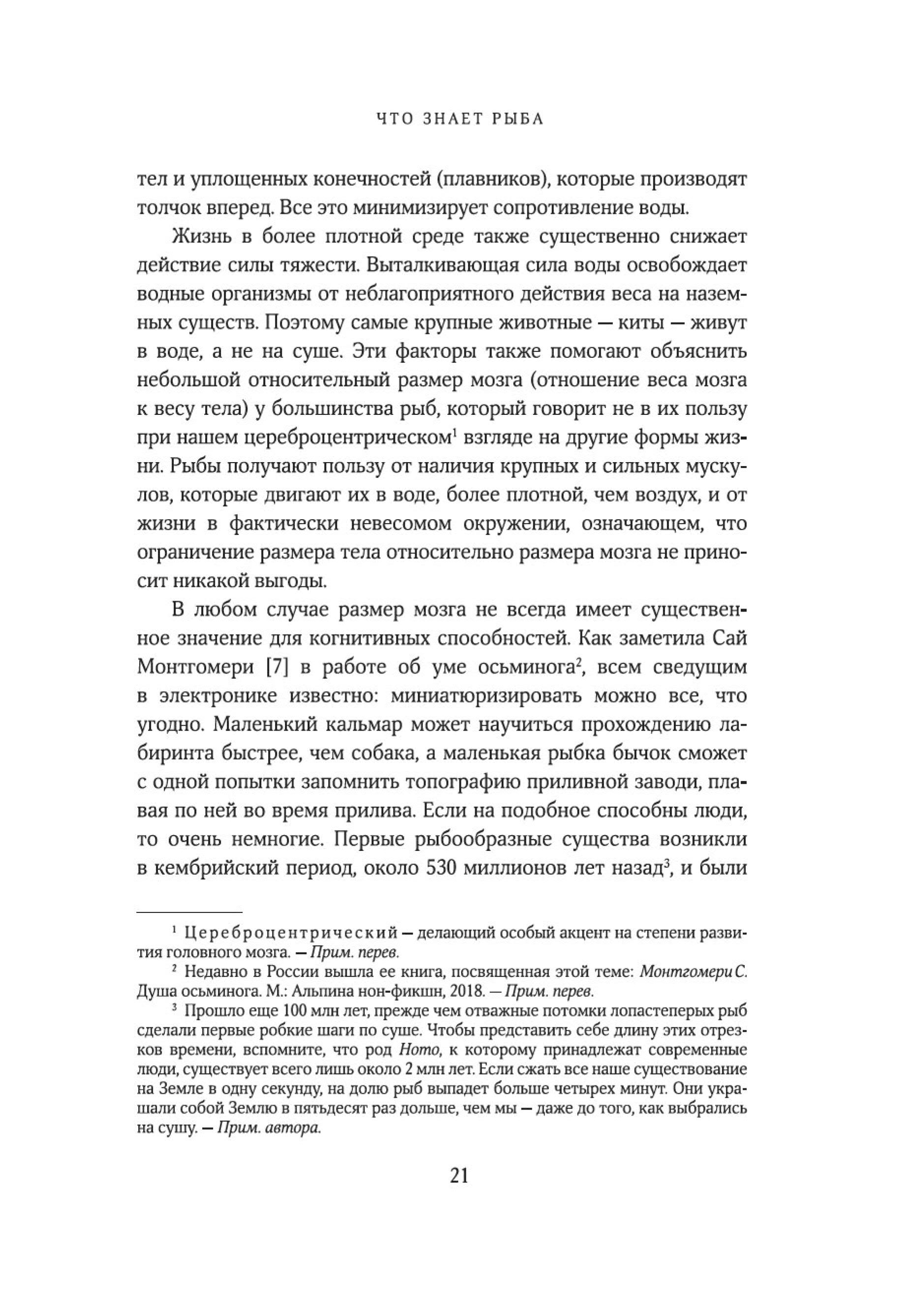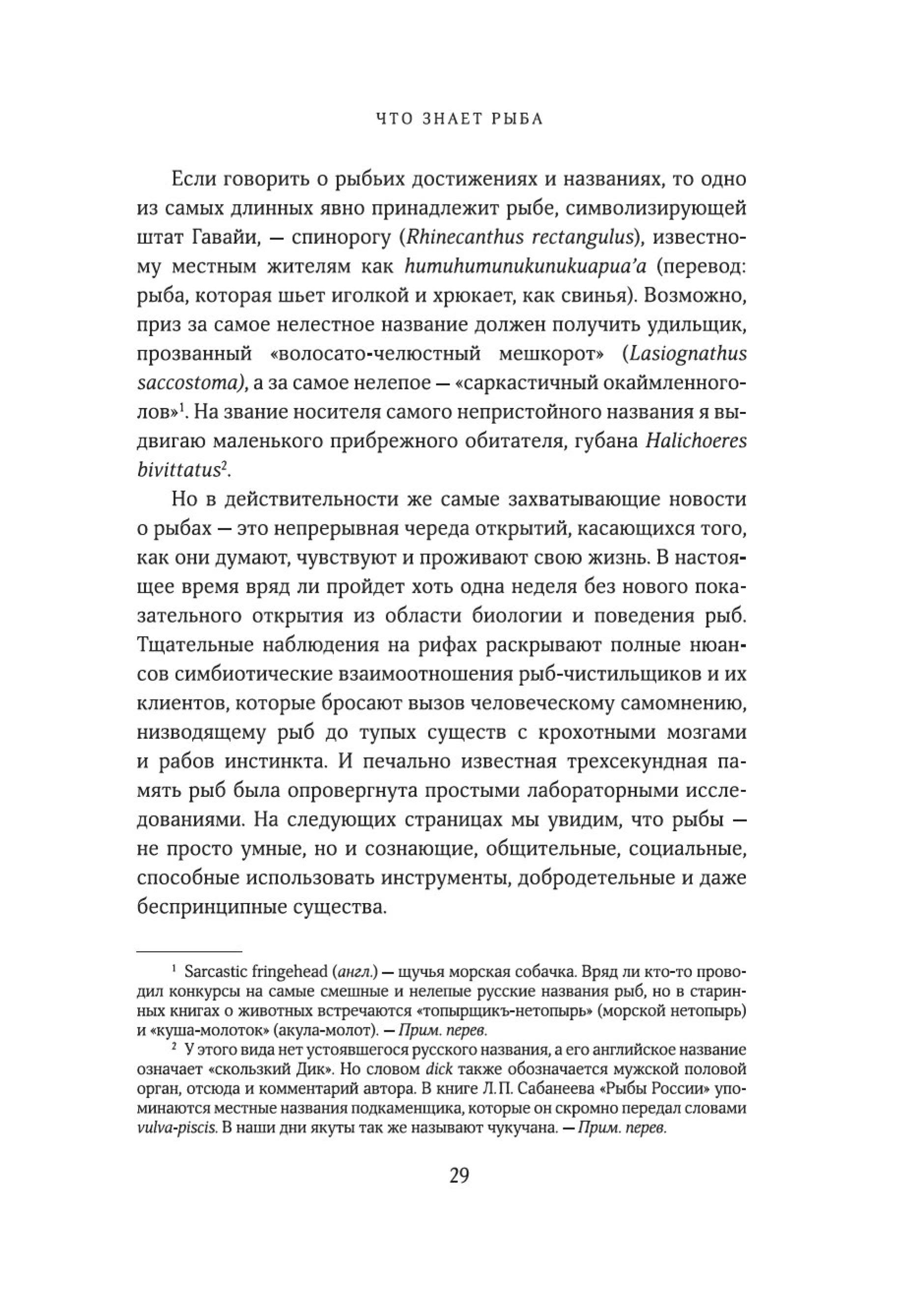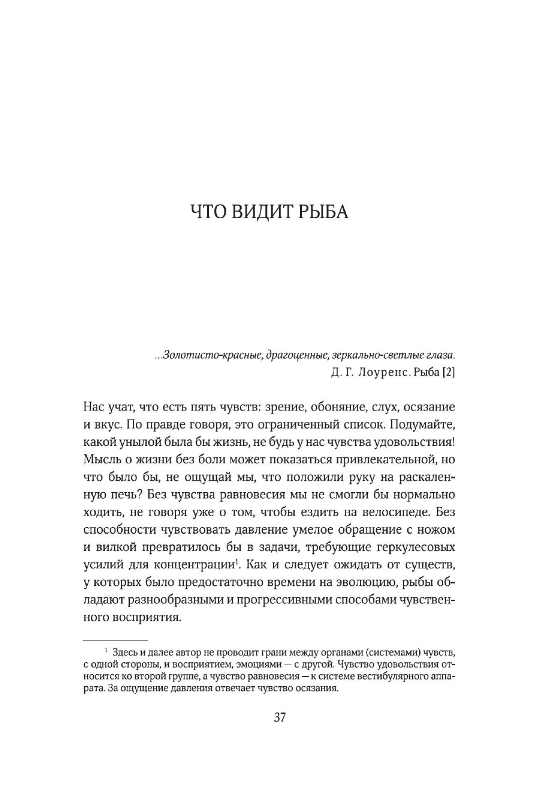 «Рыбы — не просто живые существа: это индивидуумы, обладающие личностью и строящие отношения с другими. Они могут учиться, воспринимать информацию и изобретать новое, успокаивать друг друга и строить планы на будущее. Они способны получать удовольствие, находиться в игривом настроении, ощущать страх, боль и радость. Это не просто умные, но и сознающие, общительные, социальные, способные использовать инструменты коммуникации, добродетельные и даже беспринципные существа. Цель моей книги — позволить им высказаться так, как было невозможно в прошлом. Благодаря значительным достижениям в области этологии, социобиологии, нейробиологии и экологии мы можем лучше понять, на что похож мир для самих рыб, как они воспринимают его, чувствуют и познают на собственном опыте».