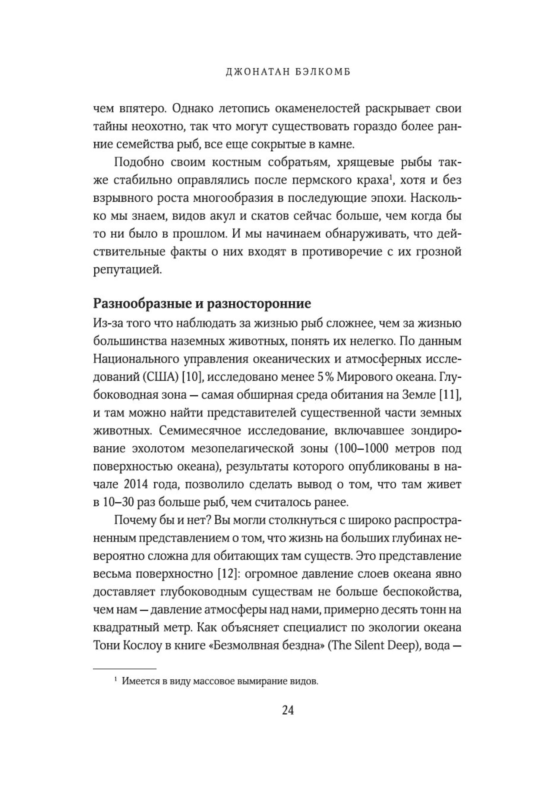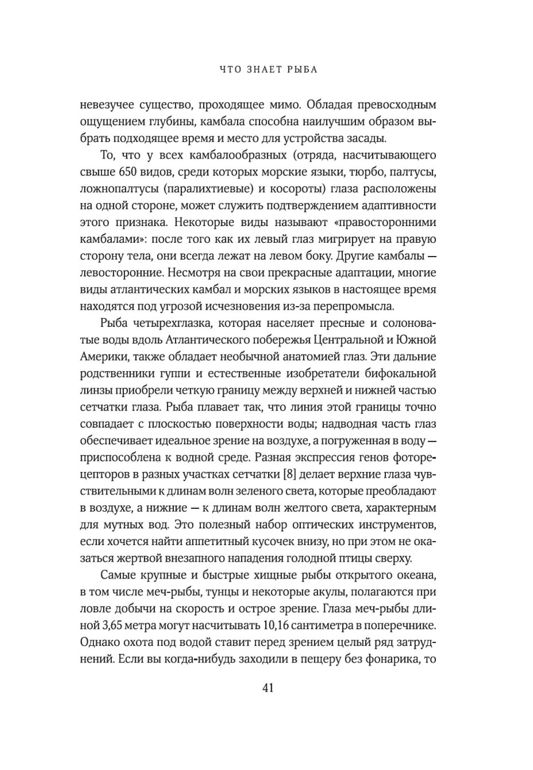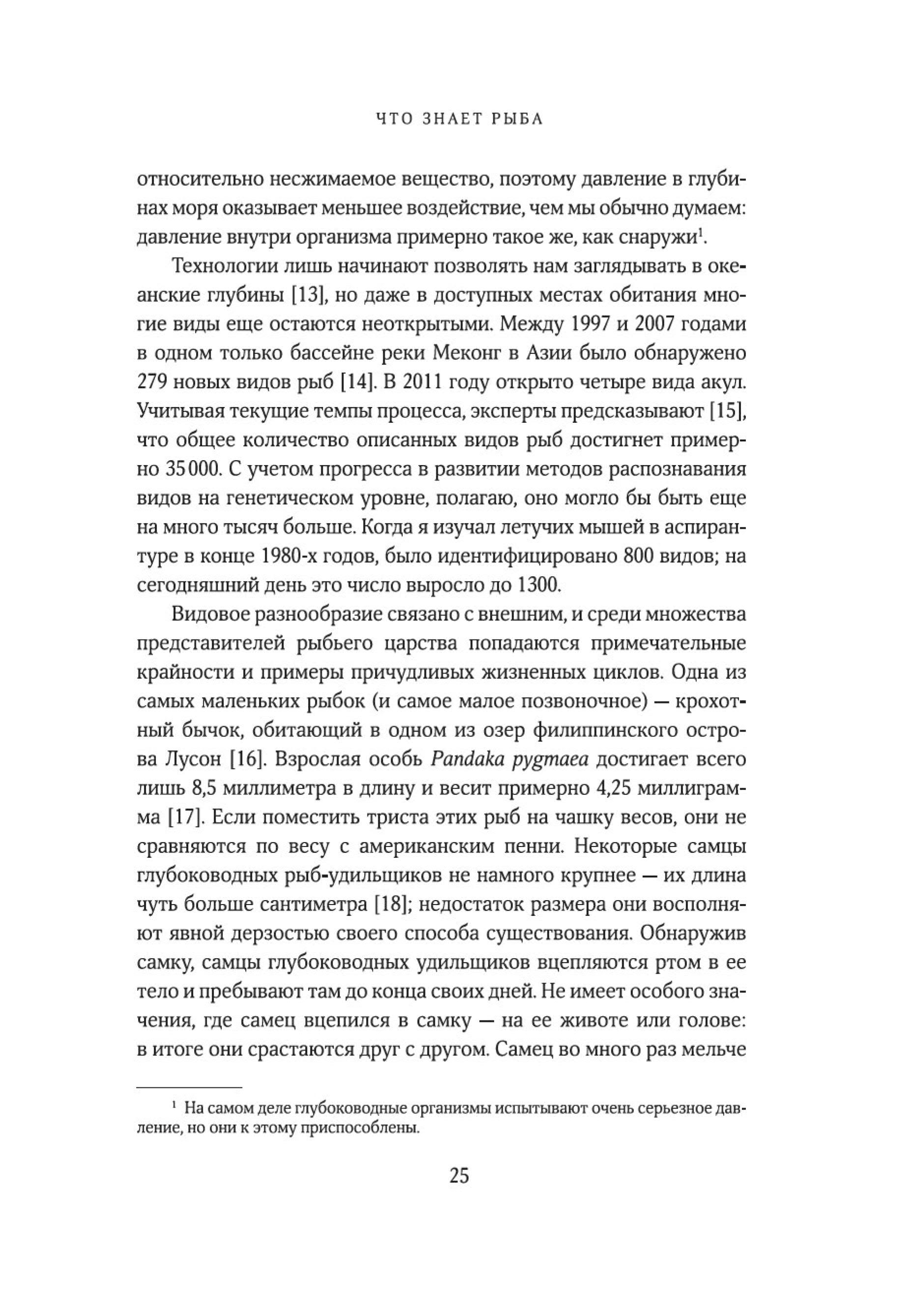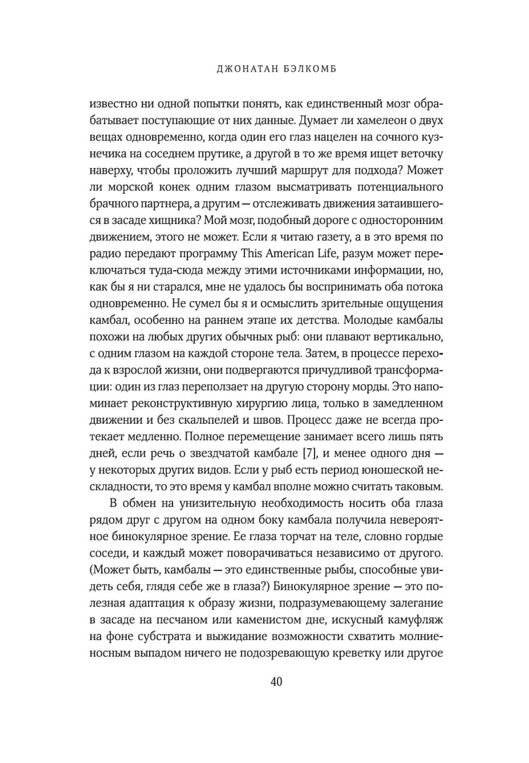 «Рыбы — не просто живые существа: это индивидуумы, обладающие личностью и строящие отношения с другими. Они могут учиться, воспринимать информацию и изобретать новое, успокаивать друг друга и строить планы на будущее. Они способны получать удовольствие, находиться в игривом настроении, ощущать страх, боль и радость. Это не просто умные, но и сознающие, общительные, социальные, способные использовать инструменты коммуникации, добродетельные и даже беспринципные существа. Цель моей книги — позволить им высказаться так, как было невозможно в прошлом. Благодаря значительным достижениям в области этологии, социобиологии, нейробиологии и экологии мы можем лучше понять, на что похож мир для самих рыб, как они воспринимают его, чувствуют и познают на собственном опыте».