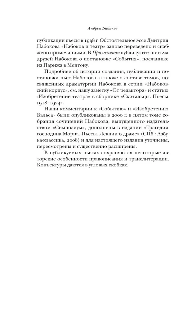 Сборник дополняет статья «Набоков и театр», написанная сыном писателя Дмитрием, приложение с письмами друзей Набокова, а также обширные комментарии и источники, которые раскрывают обстоятельства работы над пьесами.