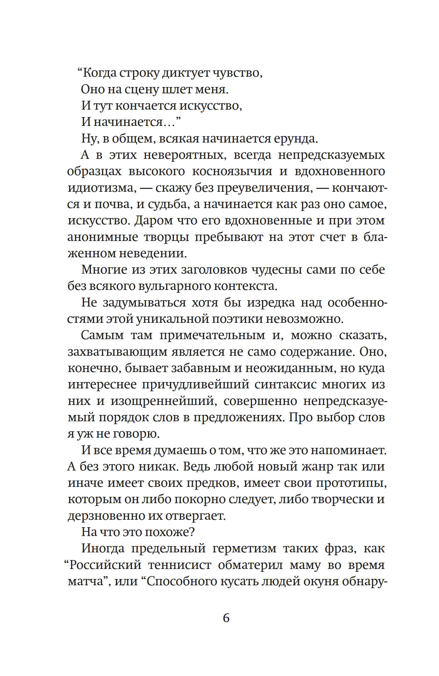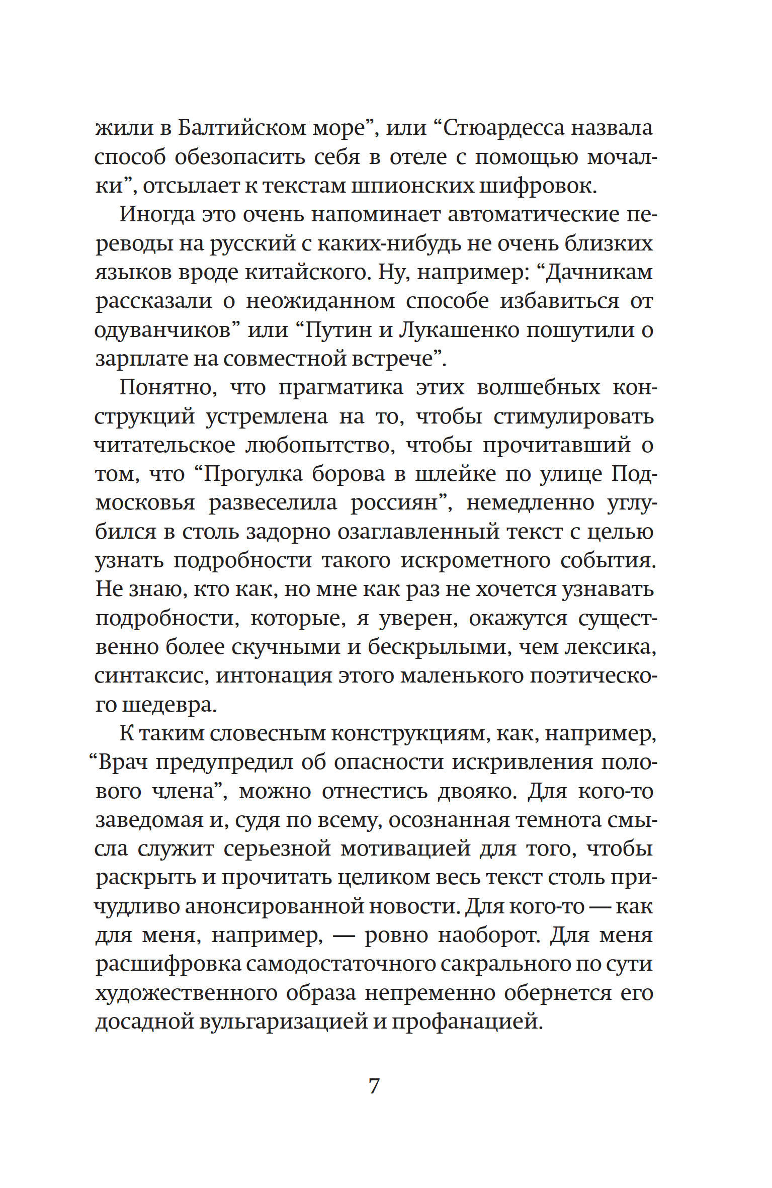 Автор собирает коллекцию маленьких шедевров новостных заголовков и комментирует их. Новостные заголовки, обычно имеющие прикладную функцию, становятся аккумуляторами неожиданных значений и смыслов.