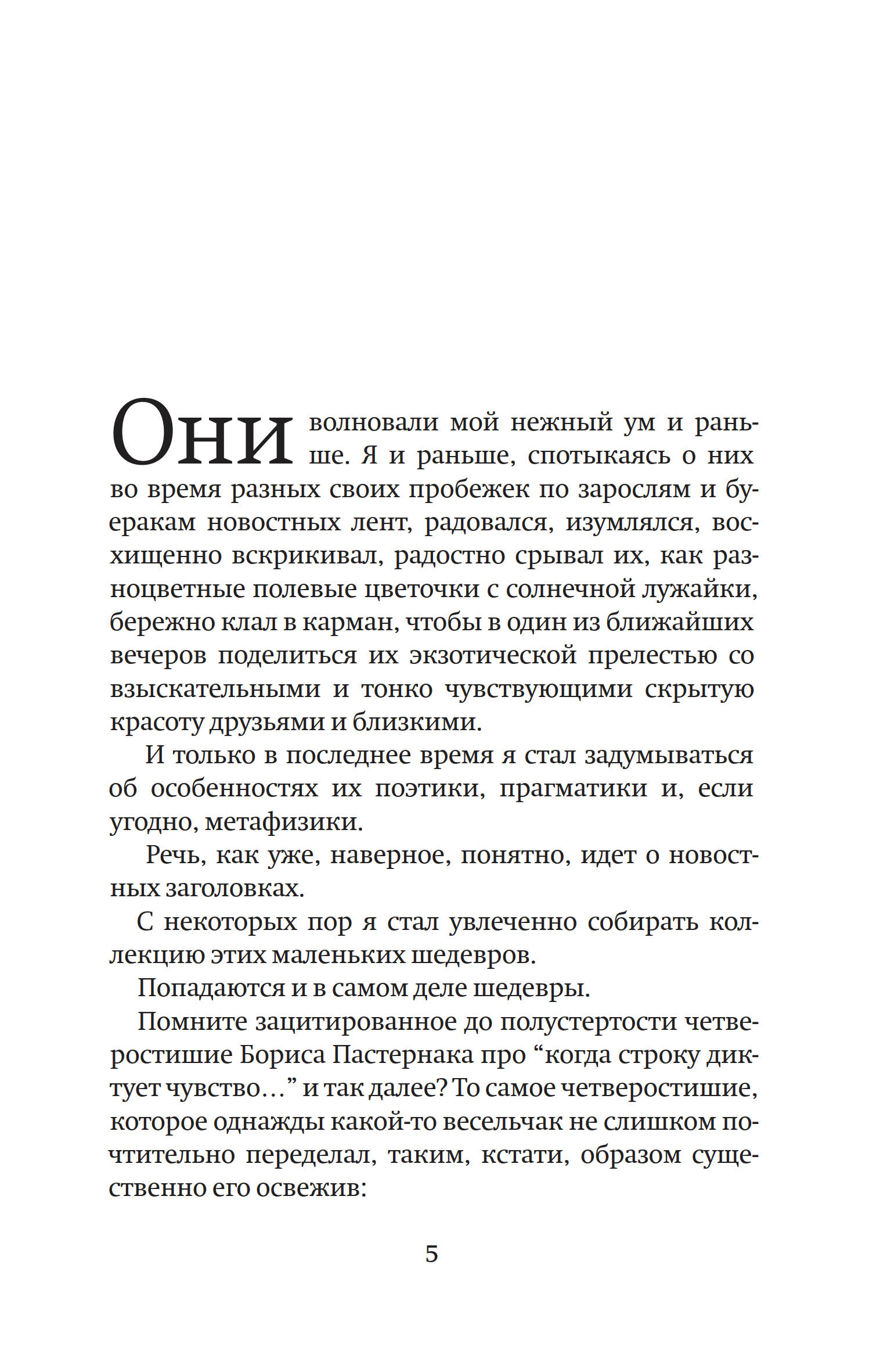 Новая книга Льва Рубинштейна — это одновременно признание в любви к новостным заголовкам и попытка понять, как устроена их причудливая поэтика. Собирая коллекцию маленьких шедевров этого жанра, автор сопровождает их комментариями, в которых воспоминания перемежаются с размышлениями о сегодняшней исторической реальности. В основе такой композиции лежит парадокс: новостные заголовки, обычно сводимые к своей прикладной функции, вдруг становятся аккумуляторами неожиданных значений и смыслов, наслаивающихся друг на друга и превращающих информационный шум в поэзию.