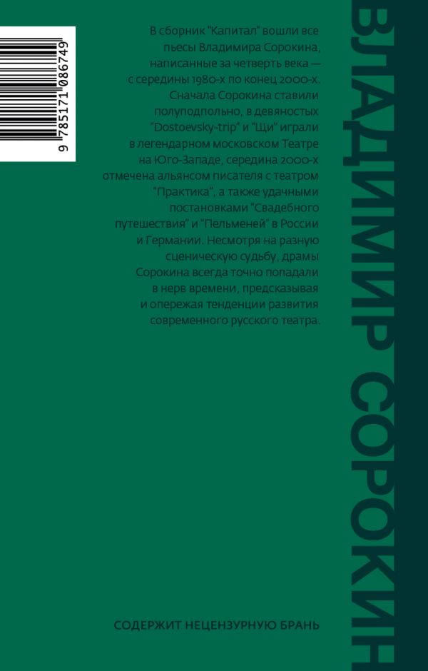 В сборник «Капитал» вошли все пьесы Владимира Сорокина, написанные за четверть века — с середины 1980‑х по конец 2000-х.