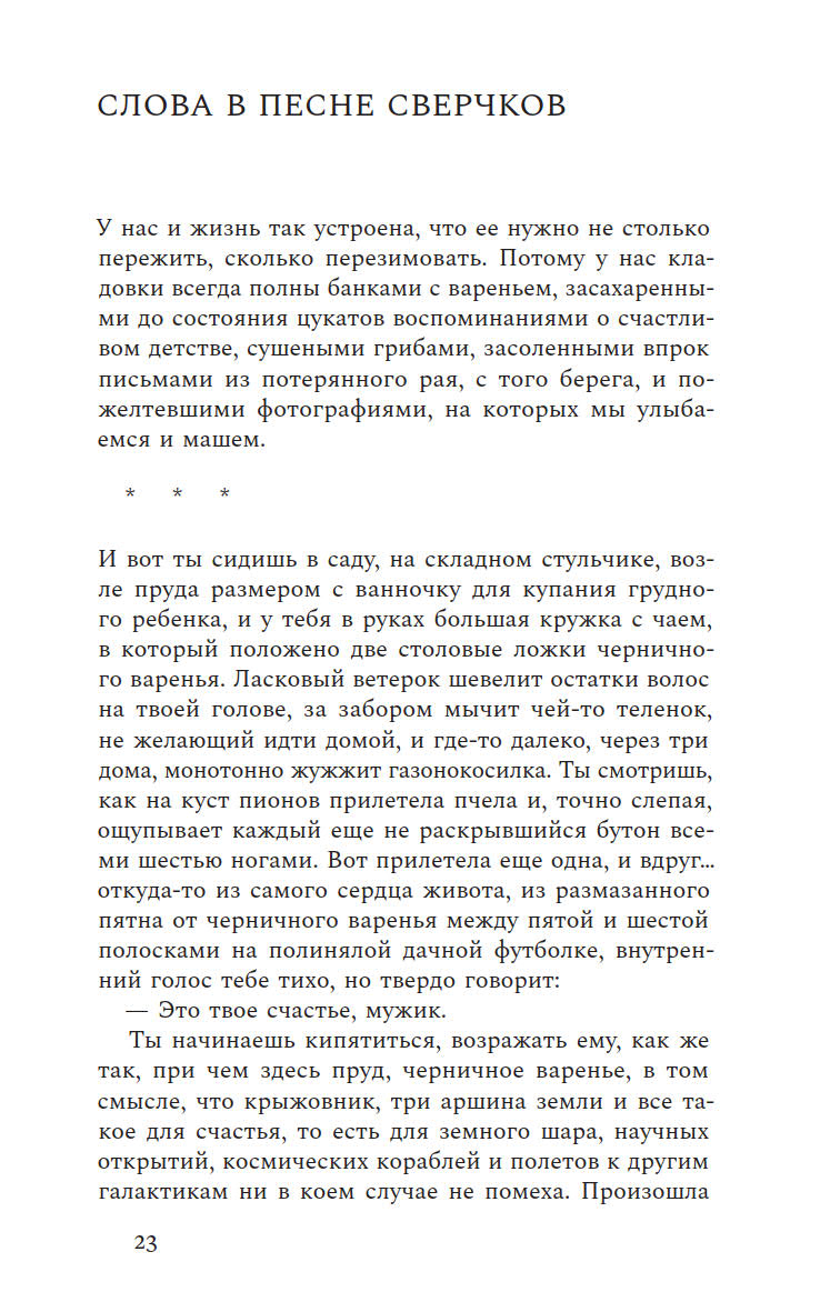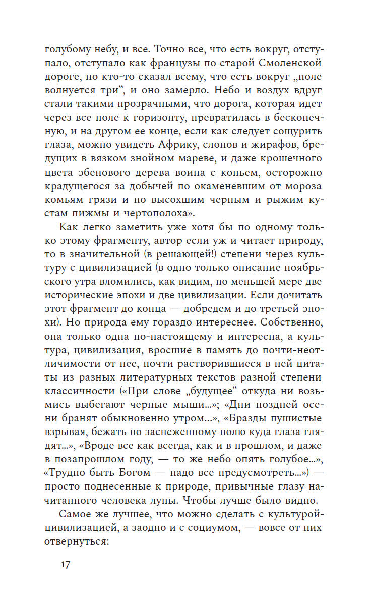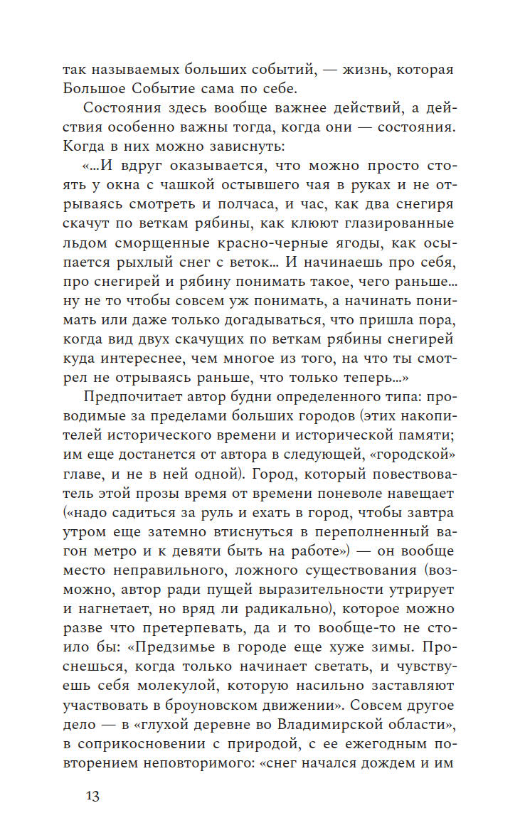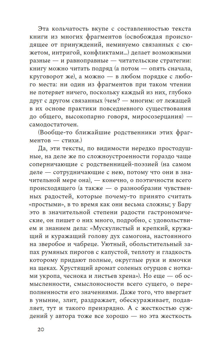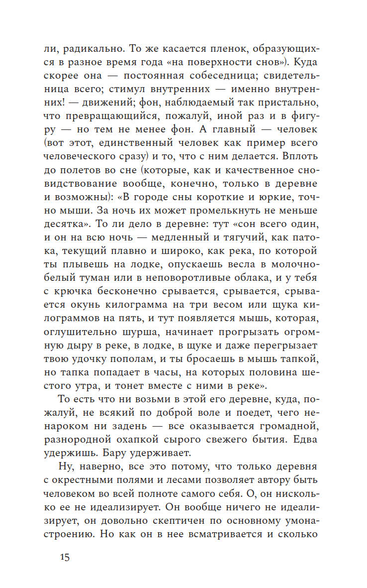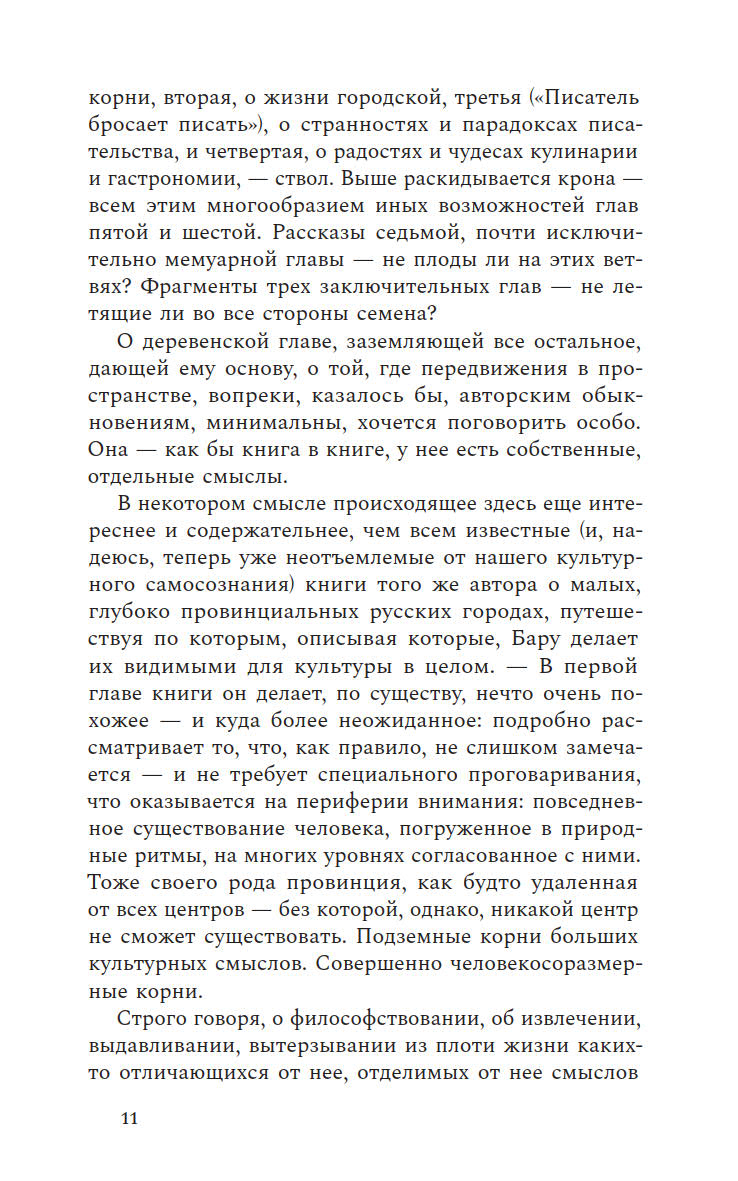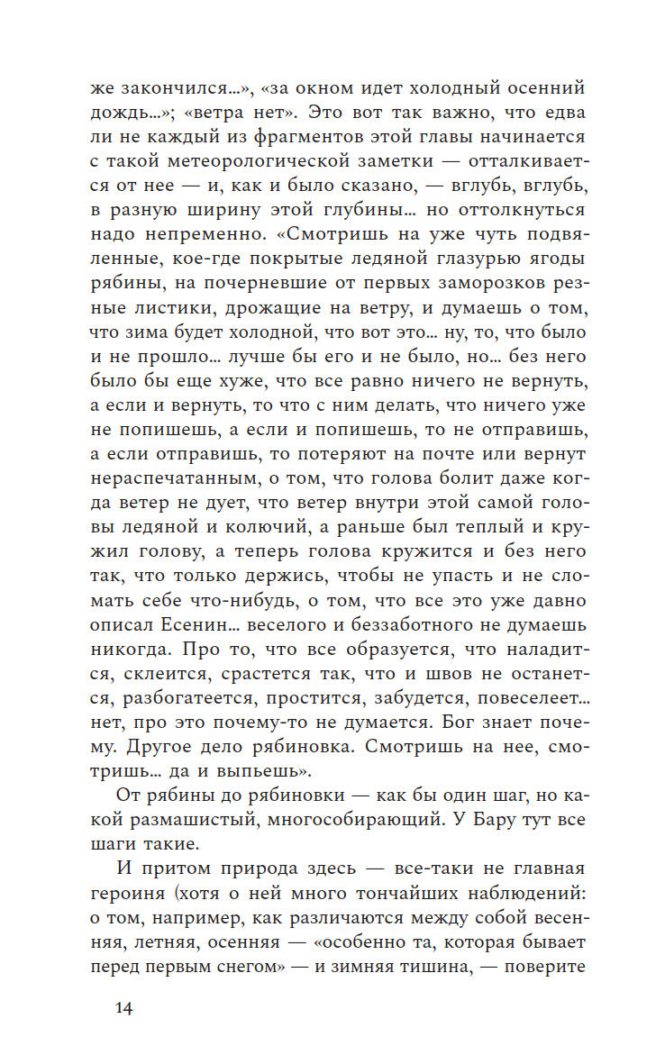 Бабье лето пролетает незаметно, а ты еще не успел написать о нем ничего особенного, что не было бы уже сказано другими или тобой самим. Новая книга Бару заметно отличается от предыдущих, где он собирал очерки о провинциальной жизни. На этот раз писатель отправляется в иное путешествие — внутрь самого себя. Поэтические, фрагментарные и многослойные эссе, из которых состоит книга, создают калейдоскопическую картину внутреннего мира автора, где переплетаются самые разные явления и голоса. От деревенской жизни и пристального внимания к природе до размышлений о литературном творчестве и парадоксах российской истории — Бару остается верным своему стилю, но теперь его взгляд направлен на окружающую реальность и его собственное внутреннее состояние.