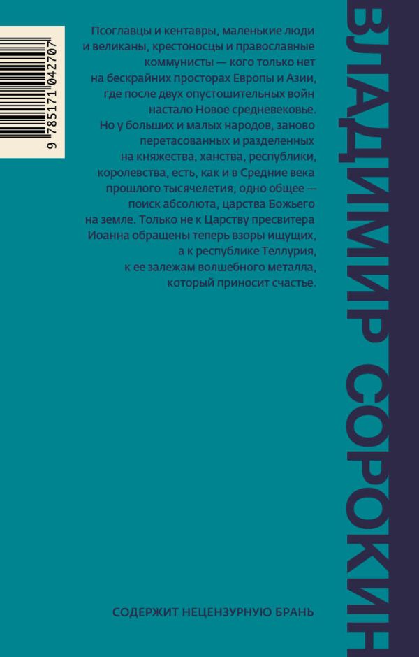 Роман «Теллурия» — это взгляд на будущее Европы, которое, несмотря на разительные перемены в мире и устройстве человека, кажется очень понятным и реальным. Узнаваемое и неузнаваемое мирно соседствуют на ярком гобелене Нового средневековья, населенном псоглавцами и кентаврами, маленькими людьми и великанами, крестоносцами и православными коммунистами. У бесконечно разных больших и малых народов, заново перетасованных и разделенных на княжества, ханства, республики и королевства, есть, как и в Средние века прошлого тысячелетия, одно общее — поиск абсолюта, царства Божьего на земле. Только не к Царству пресвитера Иоанна обращены теперь взоры ищущих, а к Республике Теллурии, к ее залежам волшебного металла, который приносит счастье.