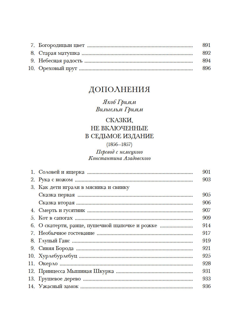 Помимо сказок и детских легенд, в издание включены тексты, которые братья исключили из последнего издания, но которые представляют несомненную ценность и даже стали знаменитыми (например, немецкая версия «Синей Бороды» и «Кота в сапогах»).