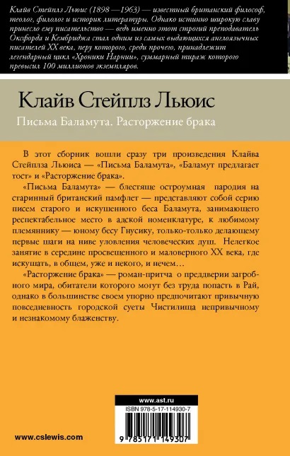 В этот сборник вошли сразу три произведения Клайва Стейплза Льюиса — «Письма Баламута», «Баламут предлагает тост» и «Расторжение брака».
