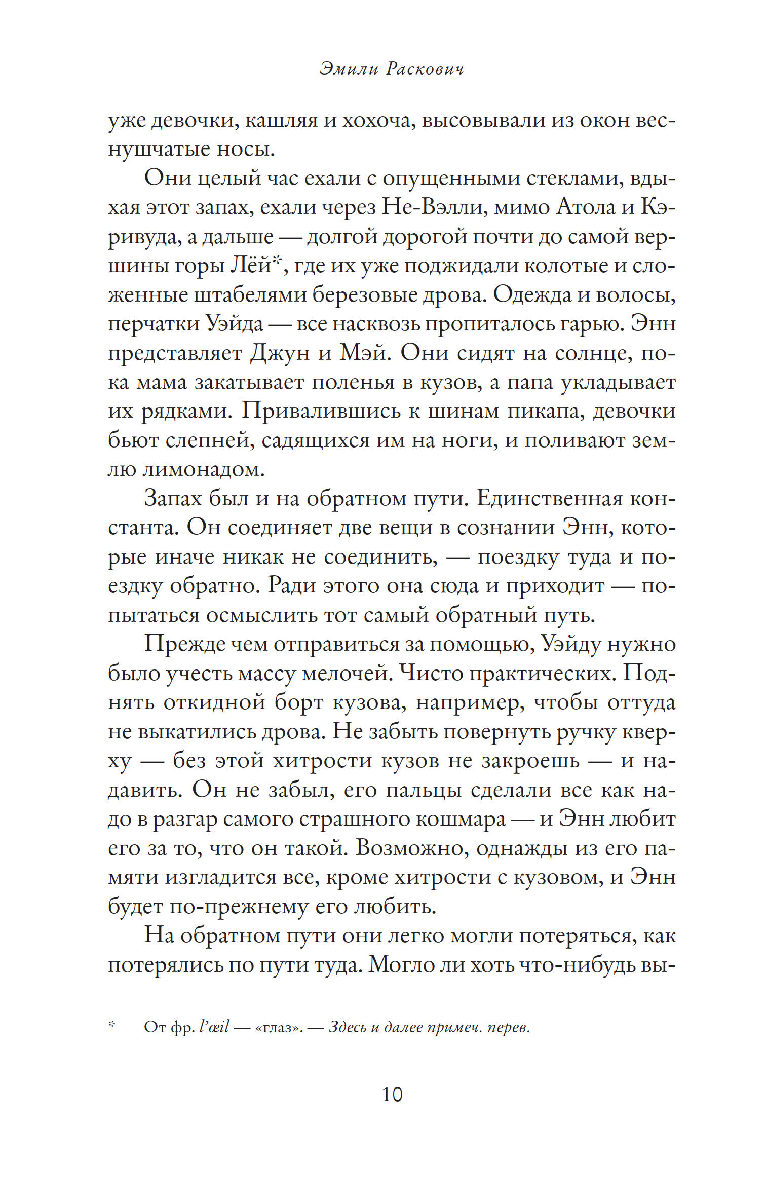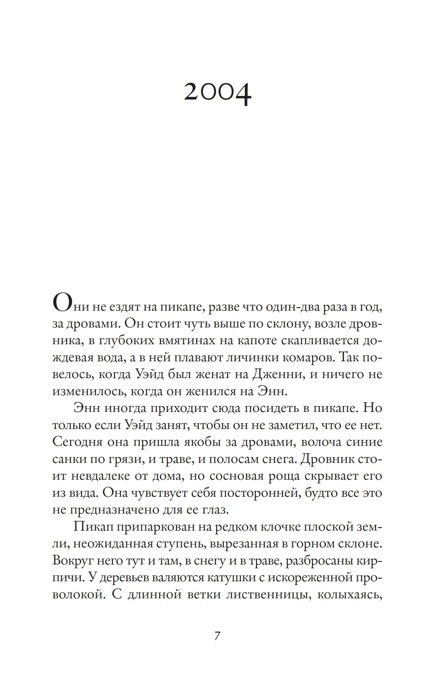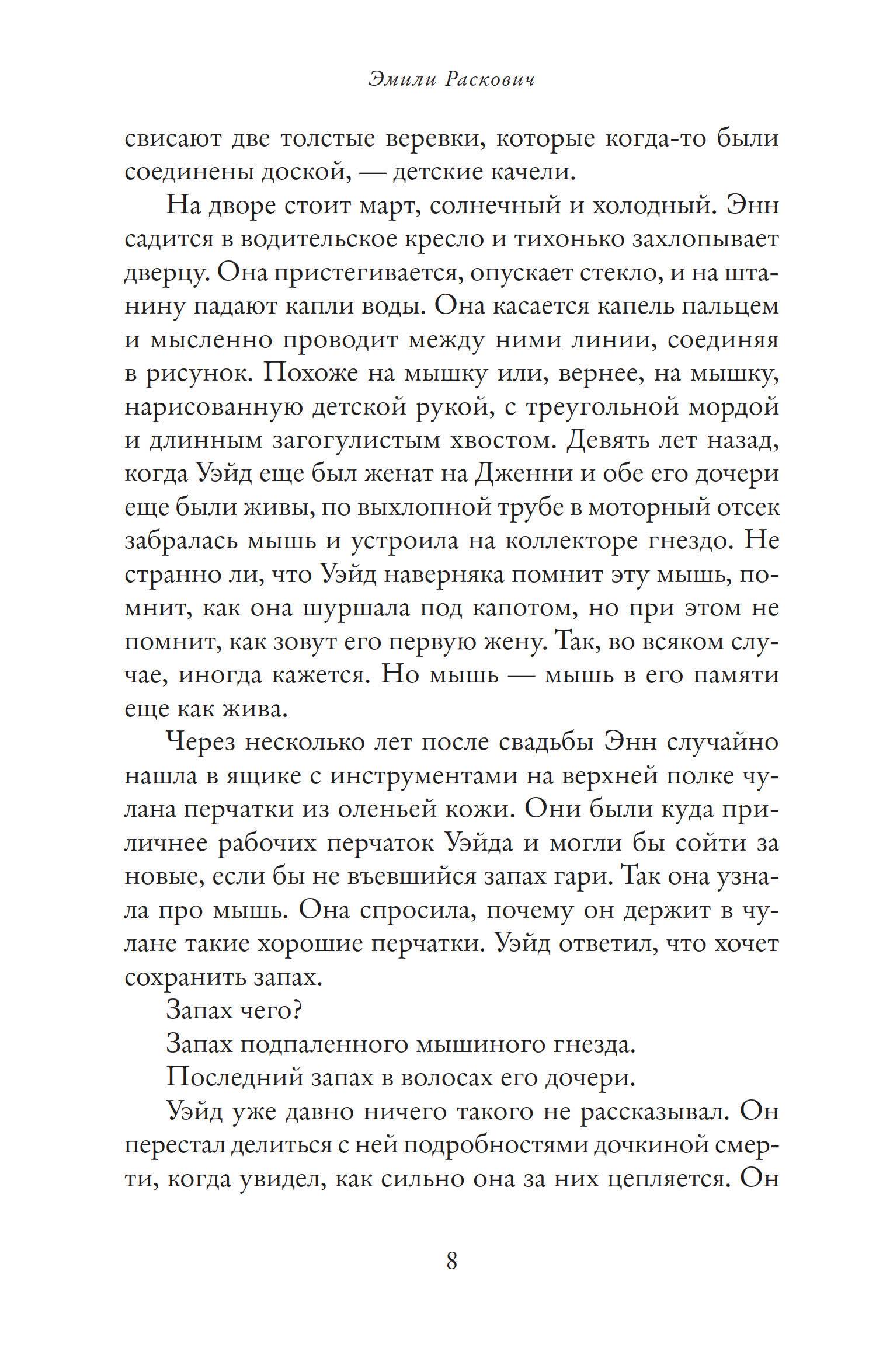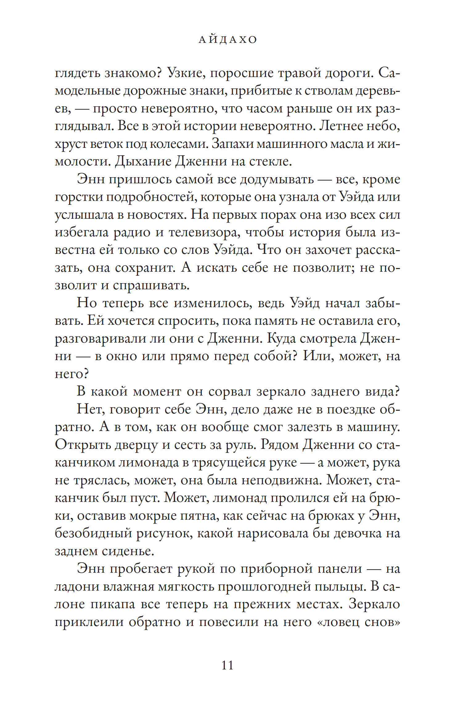 Мощный дебютный роман о любви и прощении, о памяти и беспамятстве. Энн и Уэйд ведут герметичную жизнь в суровых условиях Северного Айдахо. Их связывает не только любовь, но и память. Память, которая постепенно покидает Уэйда. Энн пытается собрать ее крупицы, осколки, касающиеся того, что случилось с Дженни, первой женой Уэйда, и двумя их дочерьми. Элегантно написанная история рассказывается с разных ракурсов — Энн, Уэйда и Дженни, которая уже много лет находится в тюрьме. Постепенно раскрывается давнее событие, трагичное и таинственное, сломавшее и Уэйда, и Дженни. Для обоих возвращением к тем годам, к самим себе, становится Энн, ее любовь и сострадание. В диком эмоциональном ландшафте, сохранившем прошлое в памяти Уэйда, Энн должна в одиночку понять семью, которую она никогда не знала, реконструировать их жизнь. В 2019 году роман получил одну из самых престижных литературных премий — Дублинскую премию.