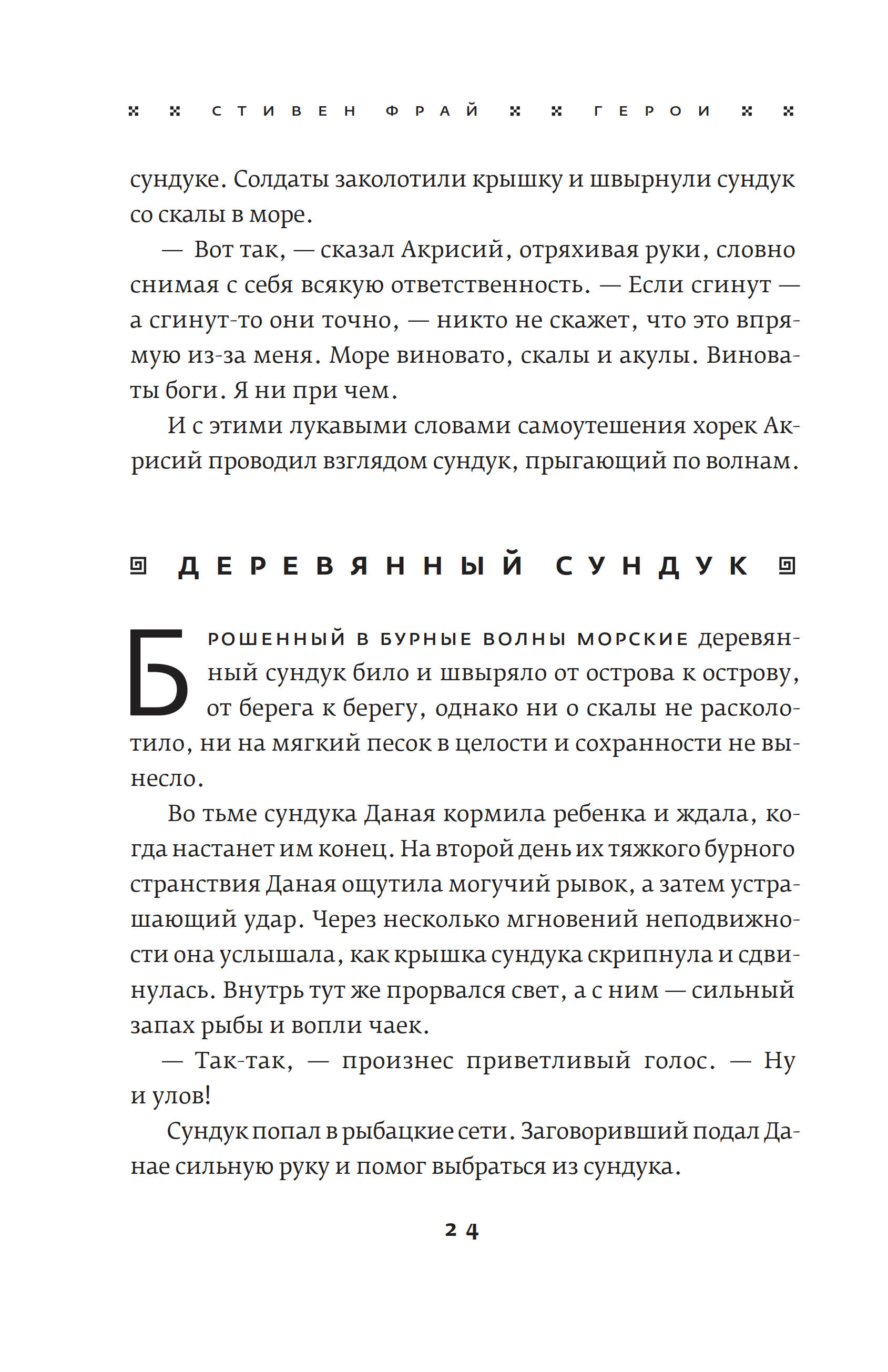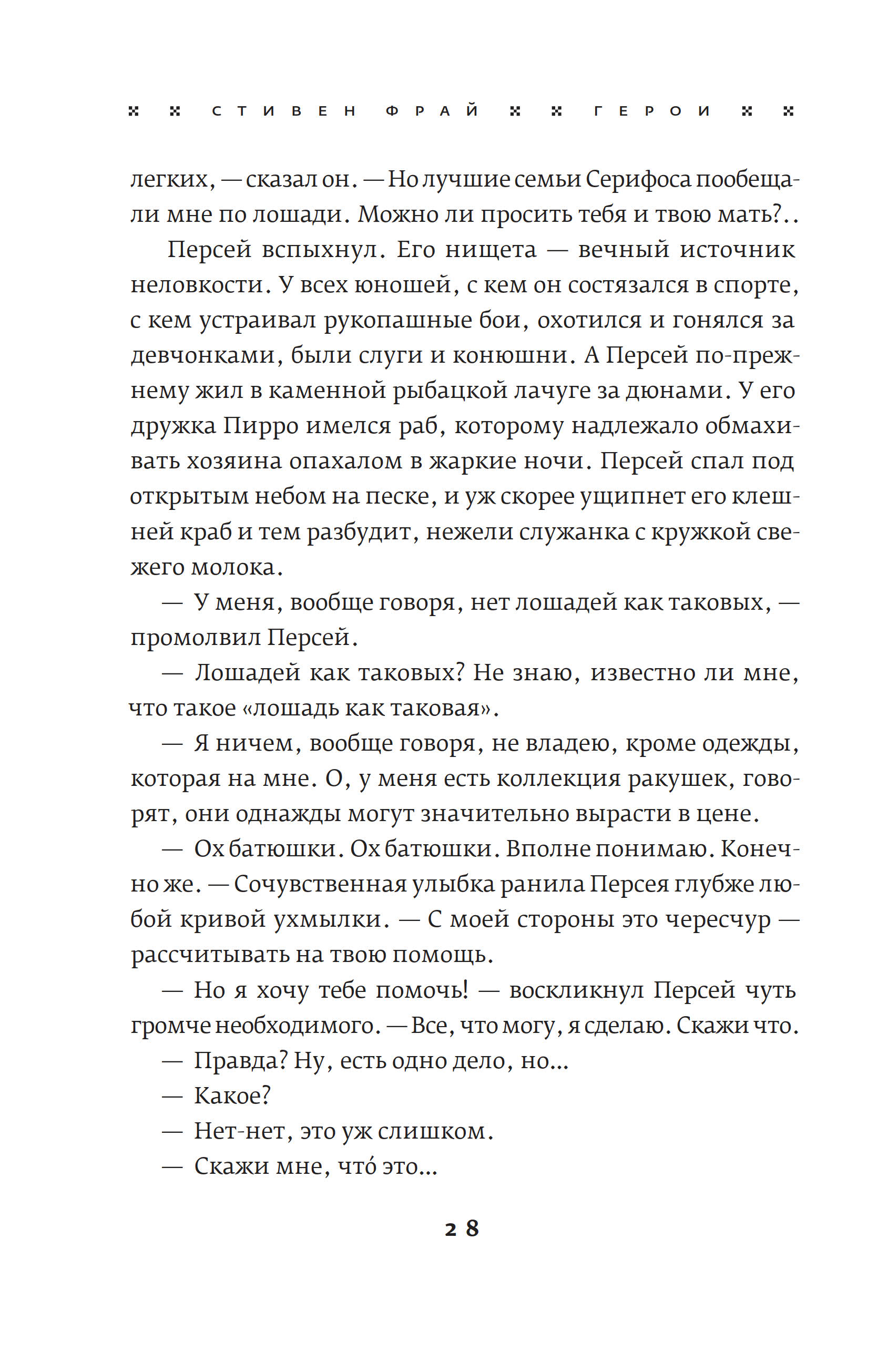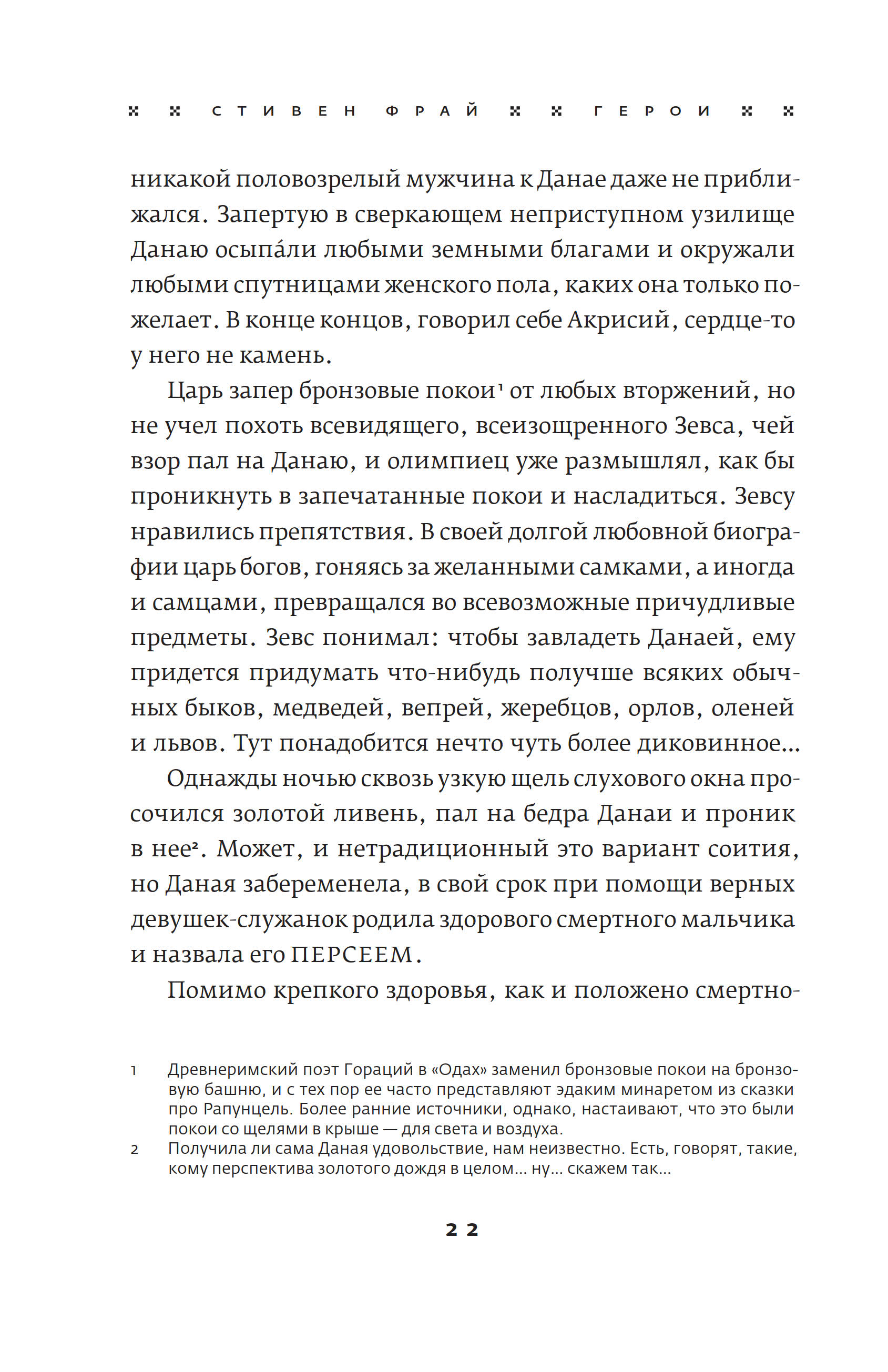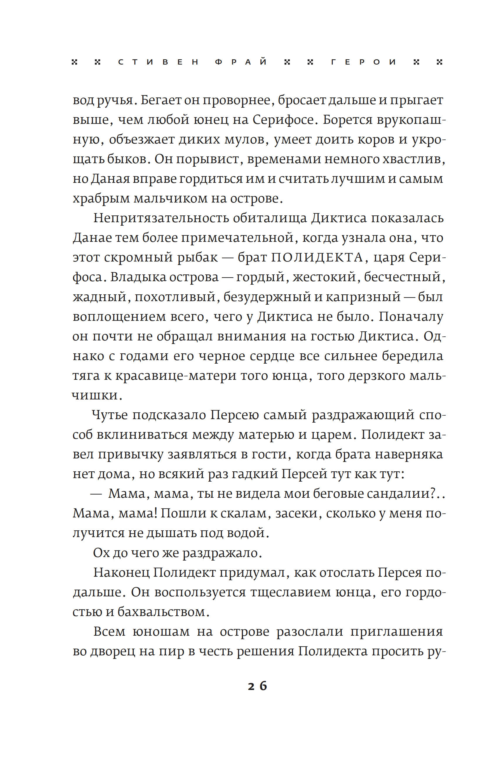 «Героев» можно считать продолжением книги"Миф«, где я изложил историю начала всего на свете, рождения титанов и богов и сотворения человечества. Чтобы разобраться в книге «Герои» — и, надеюсь, получить от нее удовольствие, — читать «Миф» необязательно, однако многие сноски отошлют вас к изданию «Мифа», то есть к соответствующим страницам в нем и к историям, персонажам и мифическим событиям, изложенным в предыдущей книге, где с ними можно познакомиться во всех подробностях. Некоторым кажется, что сноски отвлекают, однако многие читатели сообщили мне, что в первой книге им постраничные примечания понравились, а потому, надеюсь, под настроение и с удовольствием вы в них разберетесь и здесь. Вторая книга античного цикла Стивена Фрая. В ней речь пойдет о героях и их подвигах. Фрай блестяще пересказывает драматические, смешные, трагические истории. Ясон и Геракл, Персей и Орфей, Эдип и Беллерофонт. Загадки, погони, сражения, невероятные головоломки, убийства и спасения. «Герои» — это истории о тех невероятных подвигах, глупостях, актах отчаянии и храбрости, на которые мы, смертные, способны, если уж очень припечет.