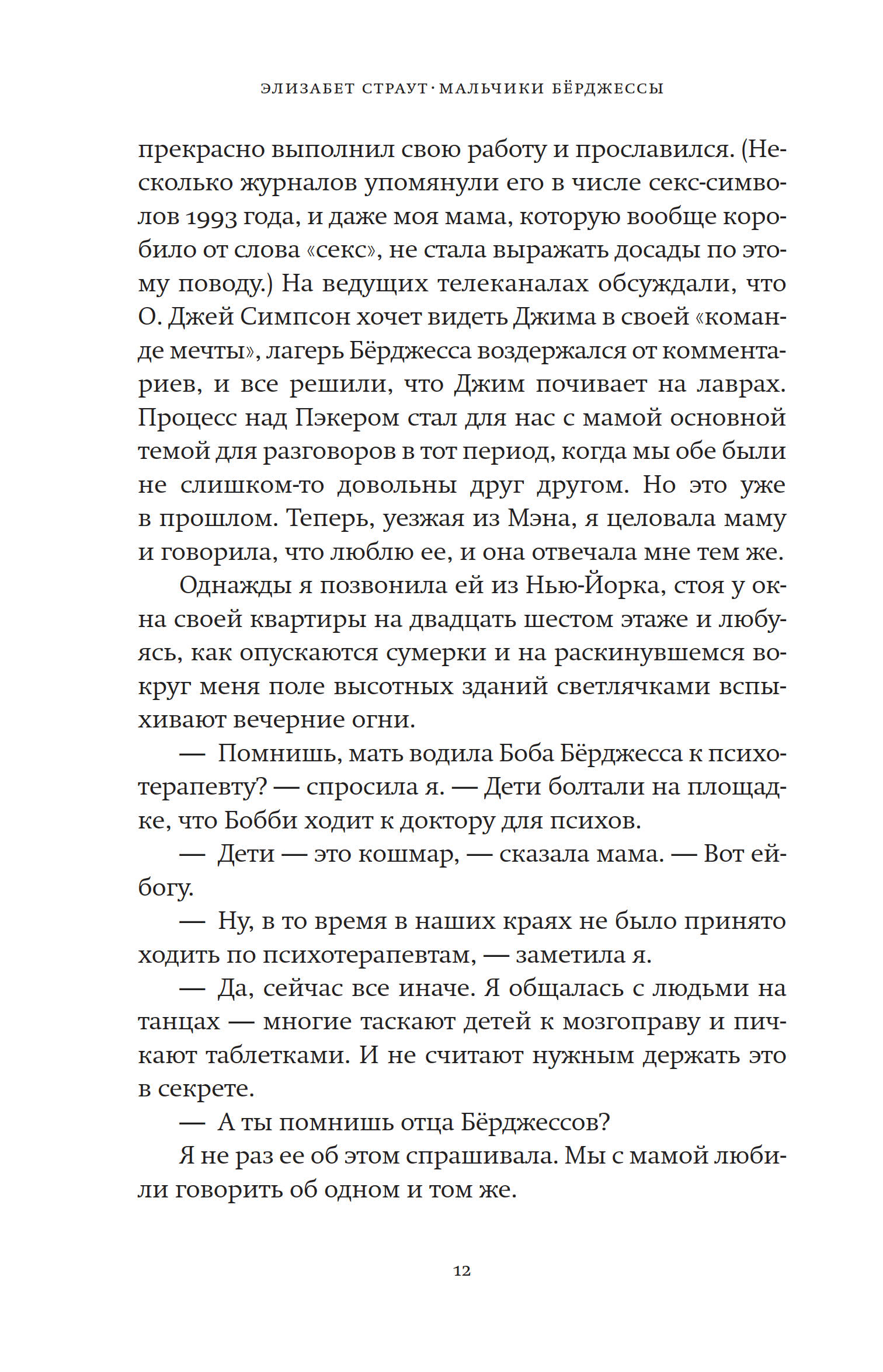 Джим и Боб Бёрджессы давно покинули родной городок в штате Мэн. Смерть их отца была трагической, и ни один из братьев до сих пор не пережил ее, оба так и живут с травмой в душе. Первый — успешный адвокат, прагматичный и циничный, второй — незадачливый юрист, добродушный, с несложившейся личной жизнью. Спустя годы братья вынуждены вернуться в родительский дом, чтобы разобраться с историей, в которую угодил еще один Бёрджесс — их племянник. И все, что, как им казалось, они сумели забыть, оставить в прошлом, наваливается с новой силой. В этом романе, как и в своей культовой книге «Оливия Киттеридж», Элизабет Страут проникает в самую суть природы радостей и страданий обычного человека. Роман очень близок по духу, настроению и даже географии (действие его происходит практически там же) роману «Эмпайр Фоллз» Ричарда Руссо.