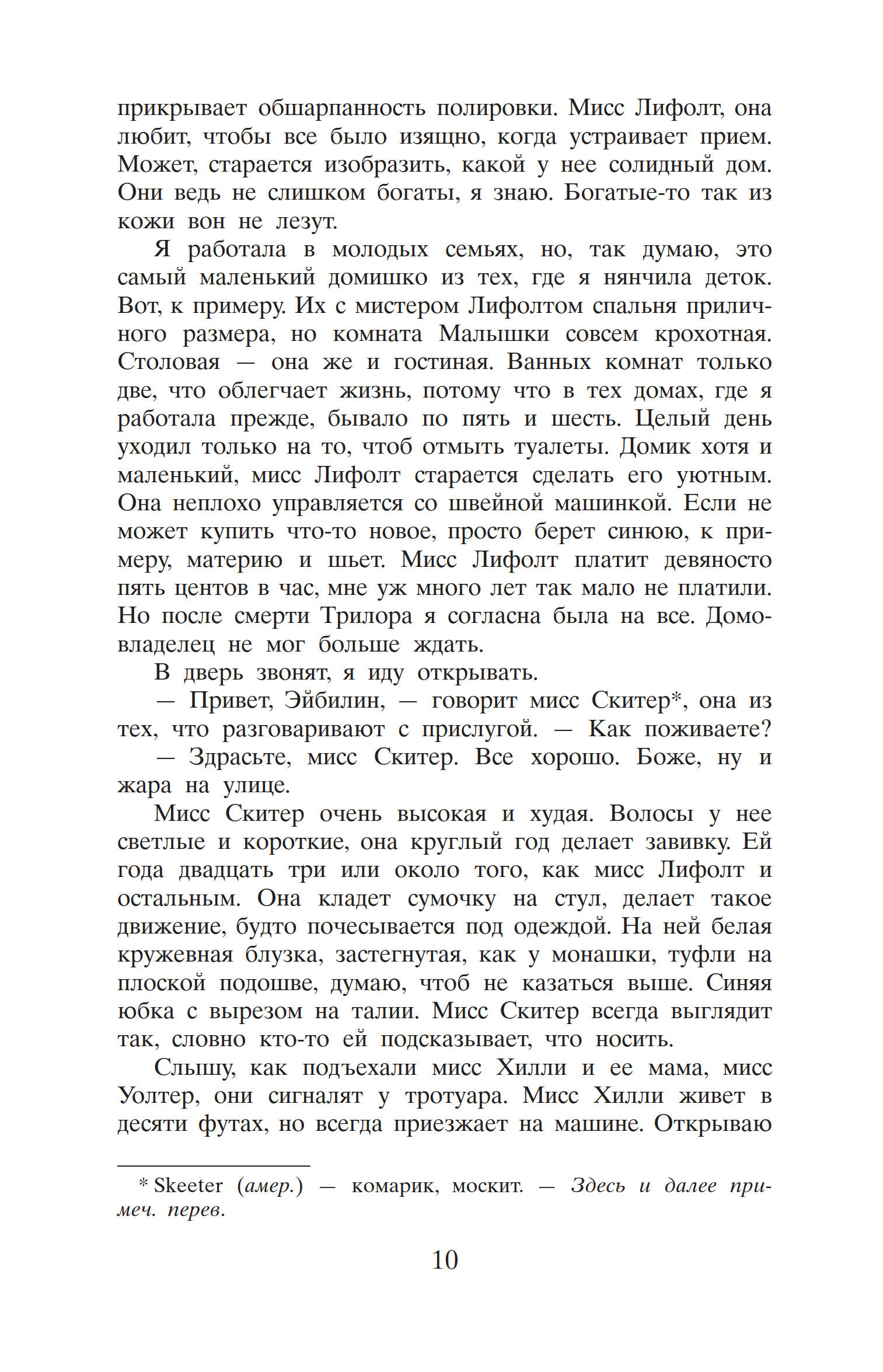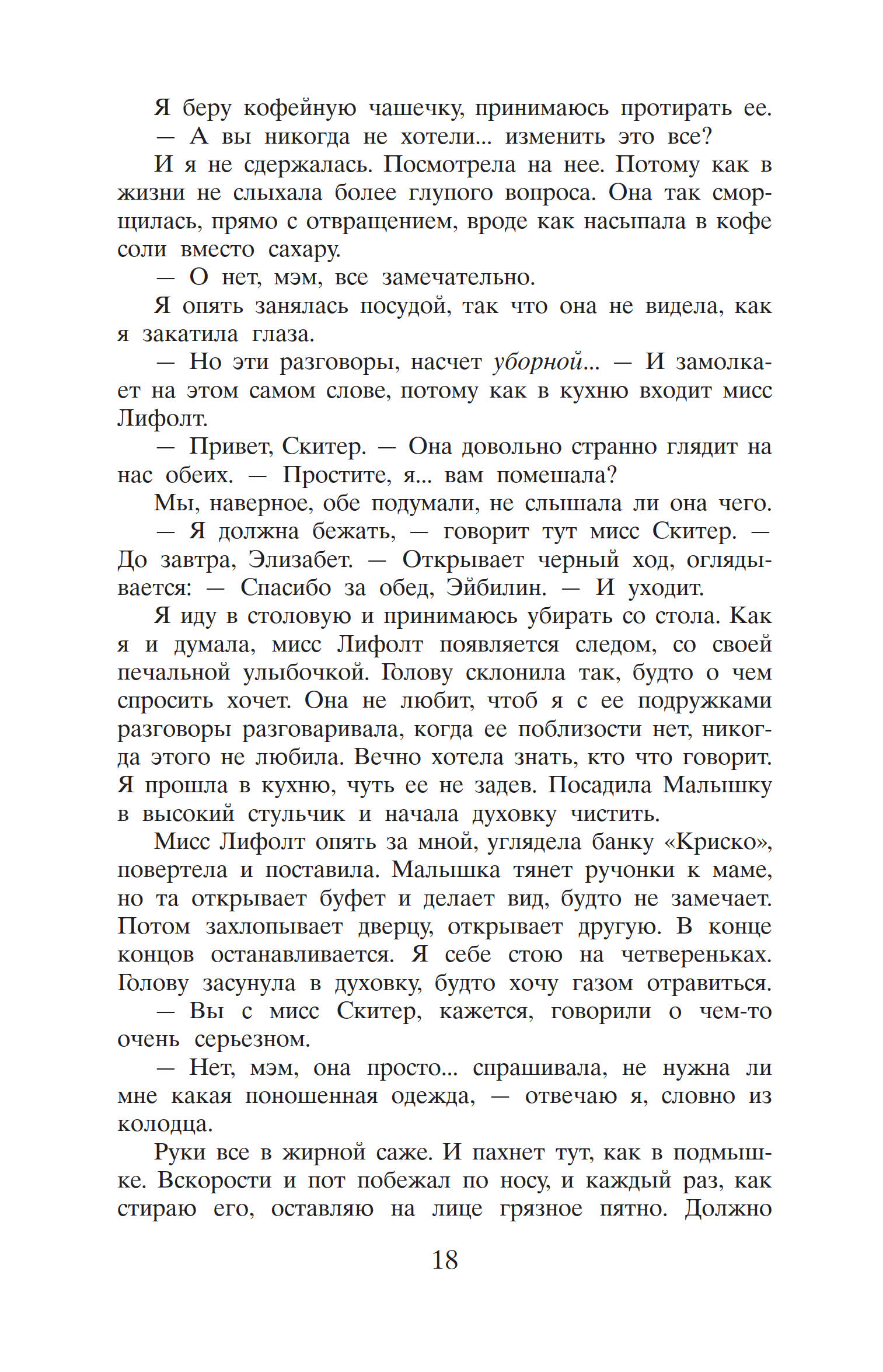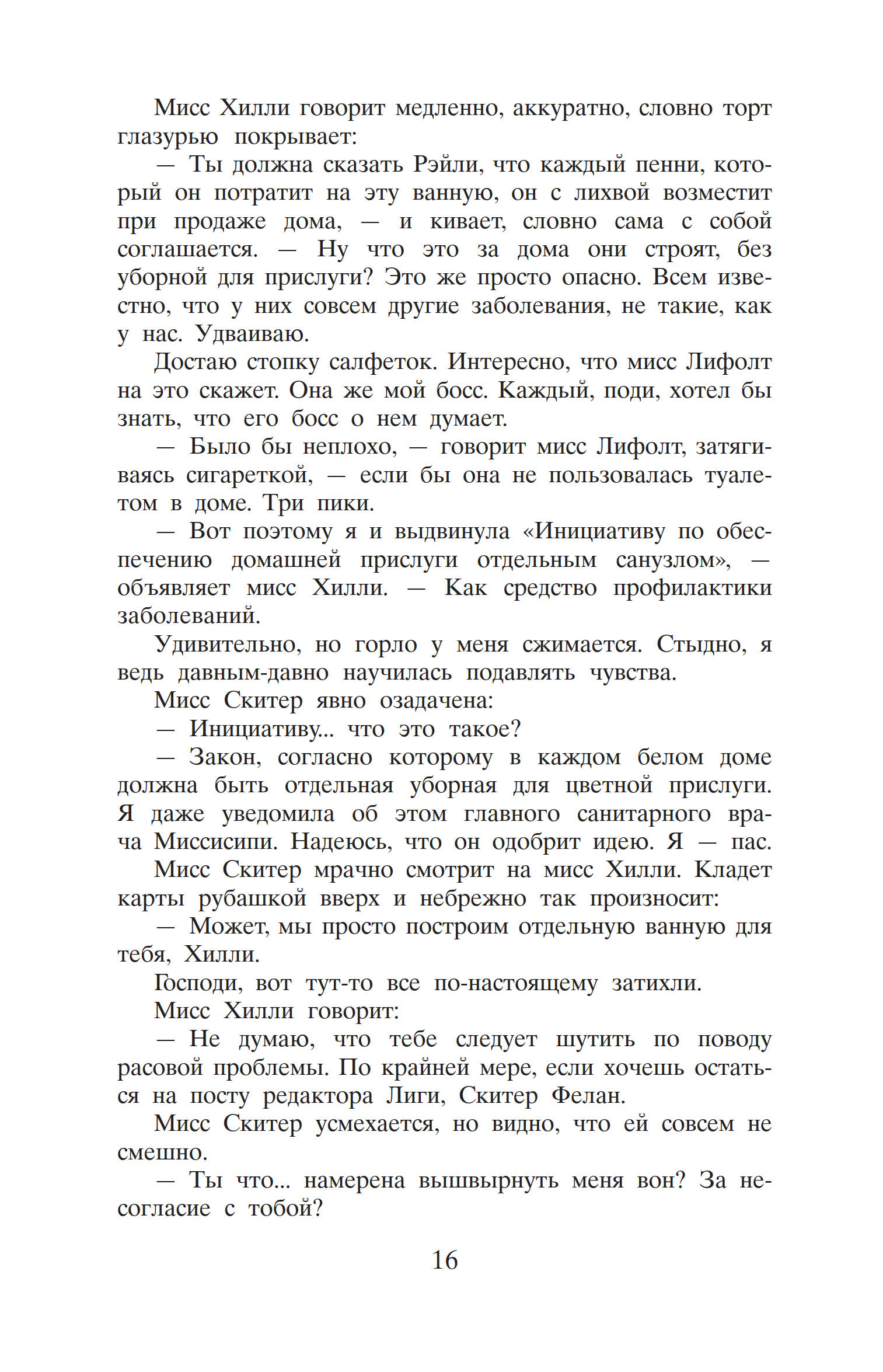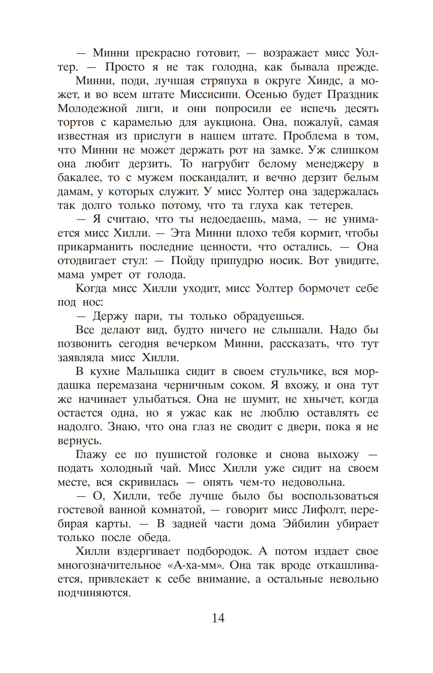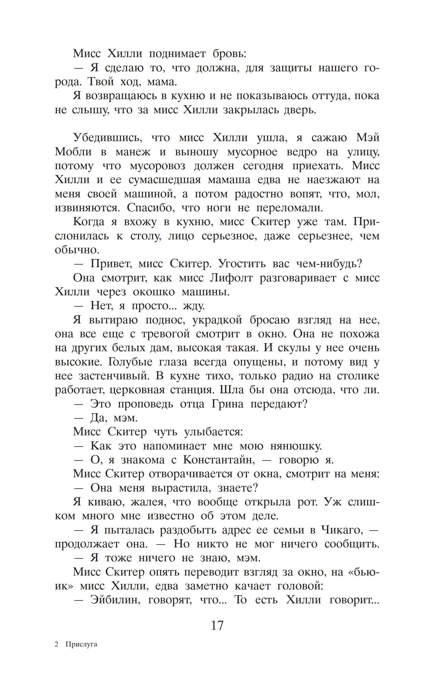 Американский Юг, на дворе 1960-е годы. Скитер только-только закончила университет и возвращается домой, в сонный городок Джексон, где никогда ничего не происходит. Она мечтает стать писательницей, вырваться в большой мир. Но для приличной девушки с Юга не пристало тешиться столь глупыми иллюзиями, приличной девушке следует выйти замуж и хлопотать по дому. Мудрая Эйбилин на тридцать лет старше Скитер, она прислуживает в домах белых всю свою жизнь, вынянчила семнадцать детей, и давно уже ничего не ждет от жизни, ибо сердце ее разбито после смерти единственного сына. Минни — самая лучшая стряпуха во всем Джексоне, а еще она самая дерзкая служанка в городе. И острый язык не раз уже сослужил ей плохую службу. На одном месте Мини никогда подолгу не задерживается. Но с Минни лучше не связываться даже самым высокомерным белым дамочкам. Двух черных служанок и белую неопытную девушку объединяет одно — обостренное чувство справедливости и желание хоть как-то изменить порядок вещей. Смогут ли эти трое противостоять целому миру? Сумеют ли они выжить в этой борьбе? «Прислуга» — потрясающе теплый, человечный и драматичный роман, книга переведена на 40 языков, в 2009-2010 годах роман стал главнм мировым бестселлером.
