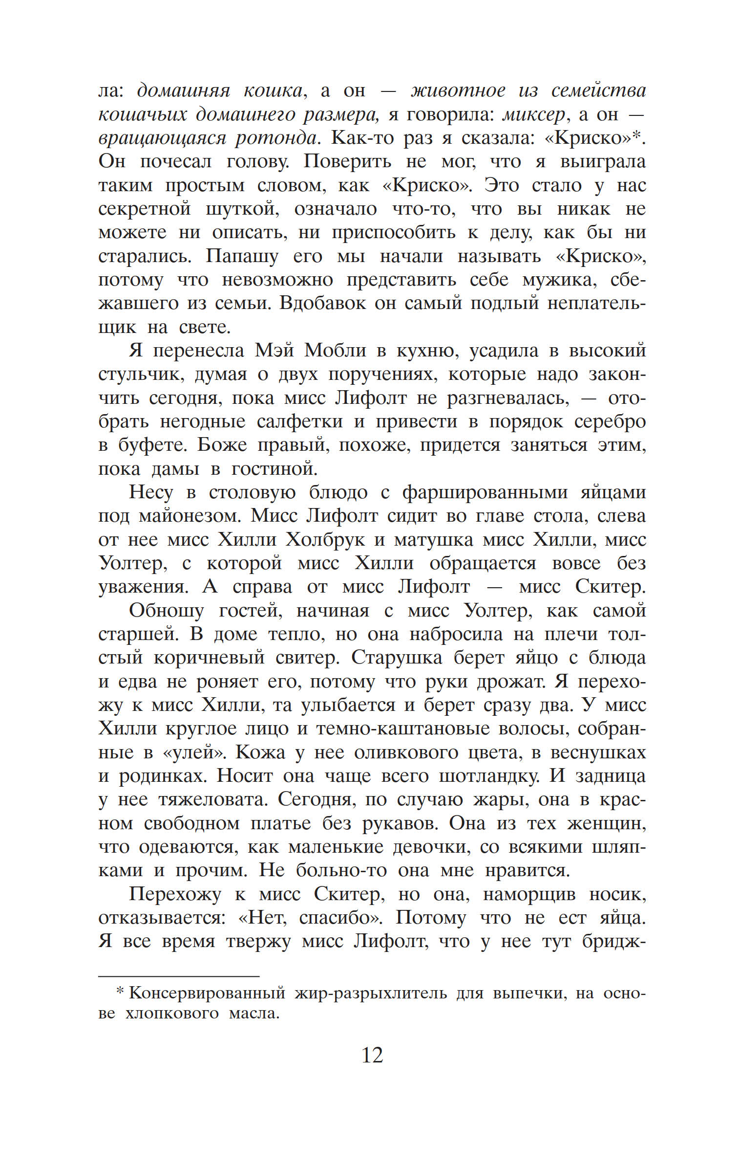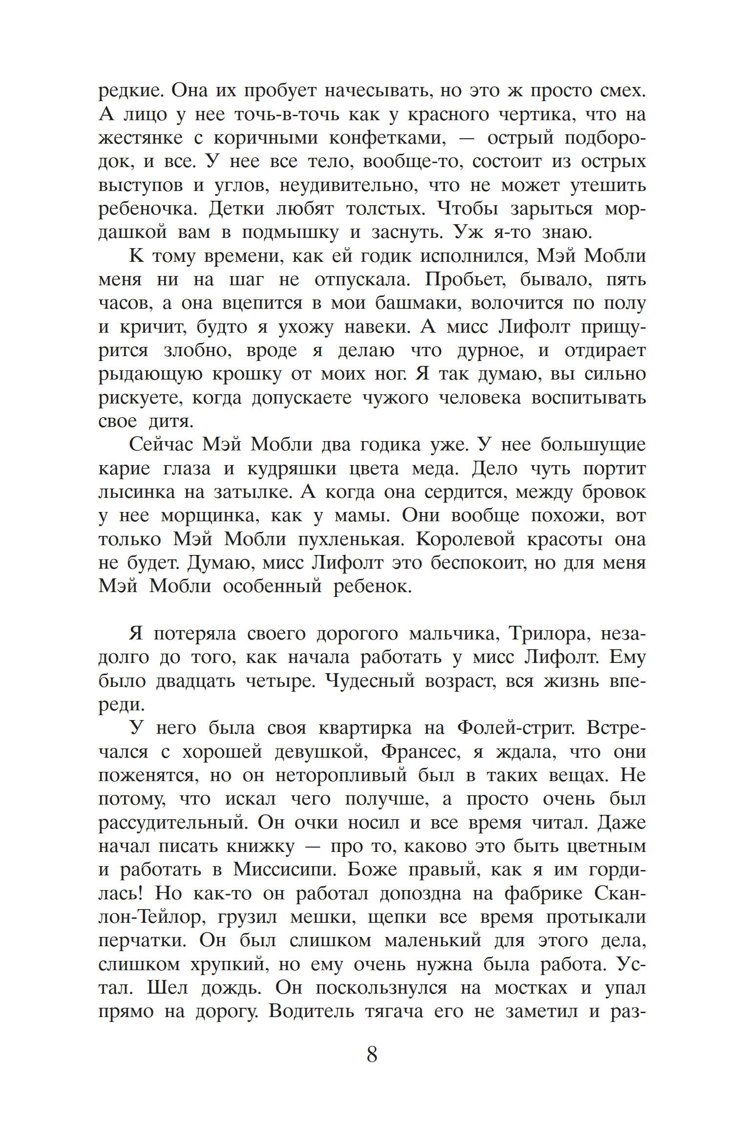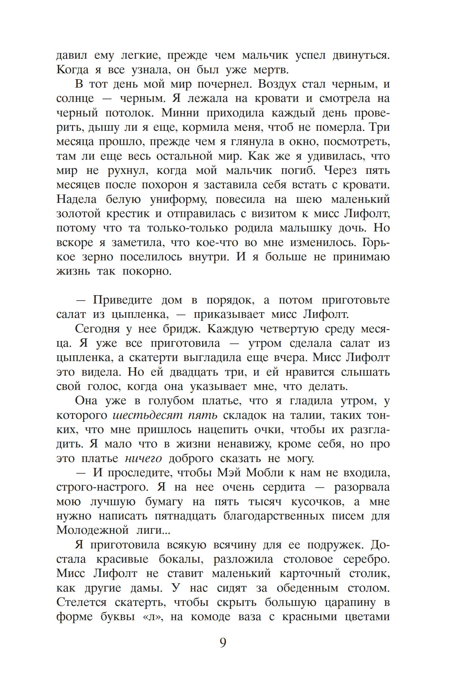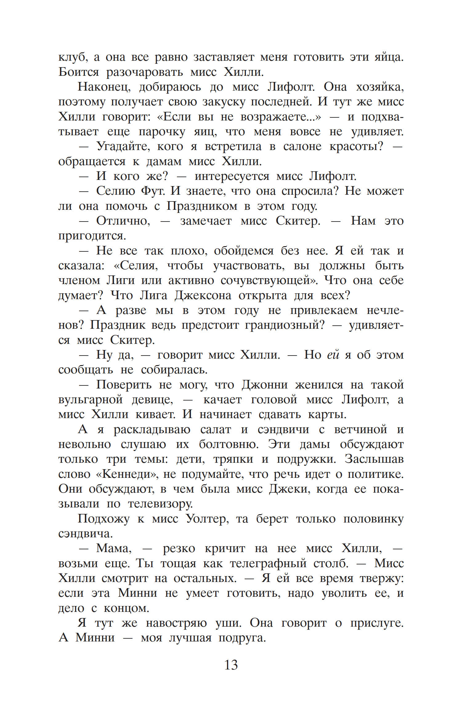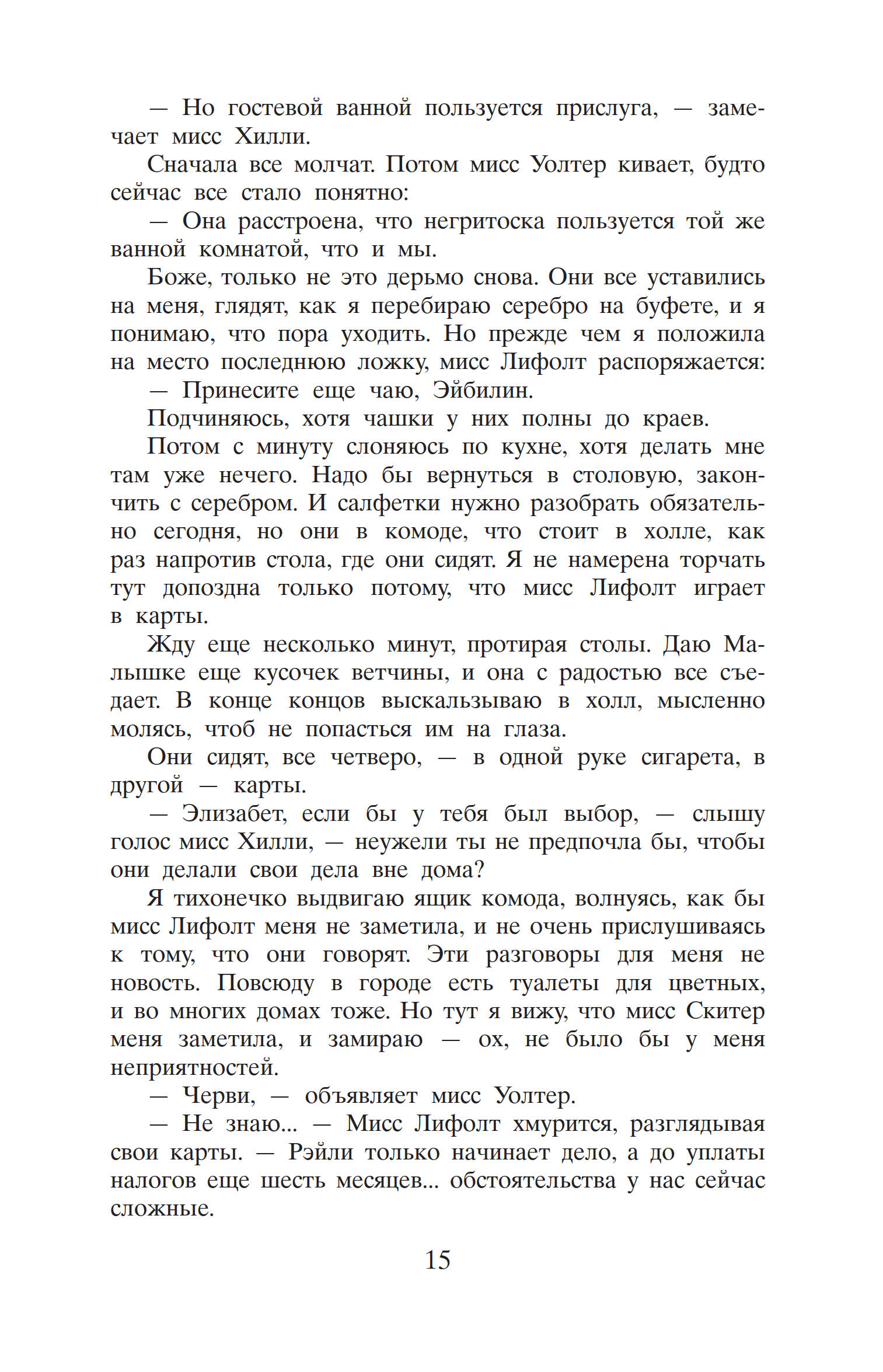 Американский Юг, на дворе 1960-е годы. Скитер только-только закончила университет и возвращается домой, в сонный городок Джексон, где никогда ничего не происходит. Она мечтает стать писательницей, вырваться в большой мир. Но для приличной девушки с Юга не пристало тешиться столь глупыми иллюзиями, приличной девушке следует выйти замуж и хлопотать по дому. Мудрая Эйбилин на тридцать лет старше Скитер, она прислуживает в домах белых всю свою жизнь, вынянчила семнадцать детей, и давно уже ничего не ждет от жизни, ибо сердце ее разбито после смерти единственного сына. Минни — самая лучшая стряпуха во всем Джексоне, а еще она самая дерзкая служанка в городе. И острый язык не раз уже сослужил ей плохую службу. На одном месте Мини никогда подолгу не задерживается. Но с Минни лучше не связываться даже самым высокомерным белым дамочкам. Двух черных служанок и белую неопытную девушку объединяет одно — обостренное чувство справедливости и желание хоть как-то изменить порядок вещей. Смогут ли эти трое противостоять целому миру? Сумеют ли они выжить в этой борьбе? «Прислуга» — потрясающе теплый, человечный и драматичный роман, книга переведена на 40 языков, в 2009-2010 годах роман стал главнм мировым бестселлером.