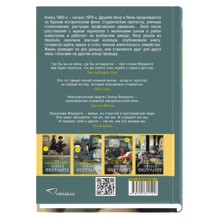 Действие третьей части неаполитанского квартета, уже названного «лучшей литературной эпопеей современности», происходит в конце 1960-х и в 1970-е годы. История дружбы Лену Греко и Лилы Черулло продолжается на бурном историческом фоне: студенческие протесты, уличные столкновения, растущее профсоюзное движение... Лила после расставания с мужем переехала с маленьким сыном в район новостроек и работает на колбасном заводе. Лену уехала из Неаполя, окончила элитный колледж, опубликовала книгу, готовится выйти замуж и стать членом влиятельного семейства. Жизнь разводит их все дальше, они становятся друг для друга лишь голосами на другом конце провода. Выдержат ли их отношения испытание переменами?