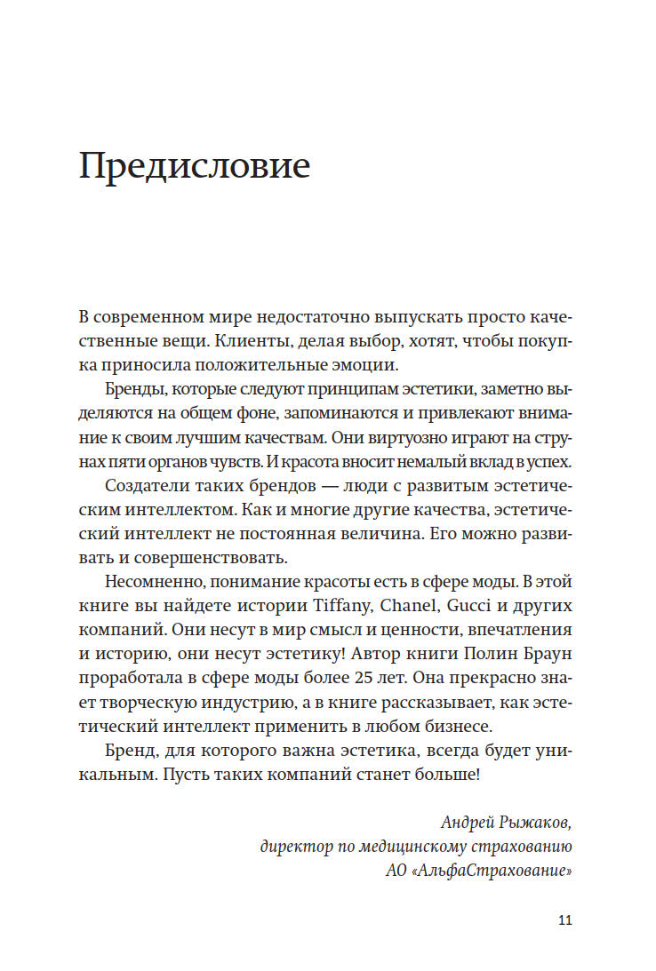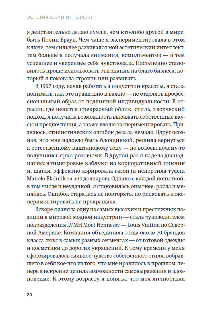 Полин Браун в течение 25 лет возглавляла североамериканское подразделение LVMH (Moet Hennessy Louis Vuitton — французская транснациональная компания, известный производитель предметов роскоши под торговыми марками Christian Dior, Louis Vuitton и других). Она знает об индустрии моды и красоты практически все. Полин уверена: сейчас нужно работать в первую очередь не с функциональными свойствами продукта, а с чувствами и эмоциями клиентов. Только так можно создать успешные и, что самое важное, долговечные бренды. В этой книге Полин на примерах многих известных компаний рассказывает, как разные подходы к работе с эстетическими принципами делают бизнес процветающим или, наоборот, увеличивают риск фиаско (если не налажена работа с эстетической составляющей). Кроме того, она показывает, как самостоятельно развить эстетический интеллект (а значит, и личный стиль): с ее точки зрения, это не данность, а навык, который можно тренировать (хотя на это потребуются время и силы).