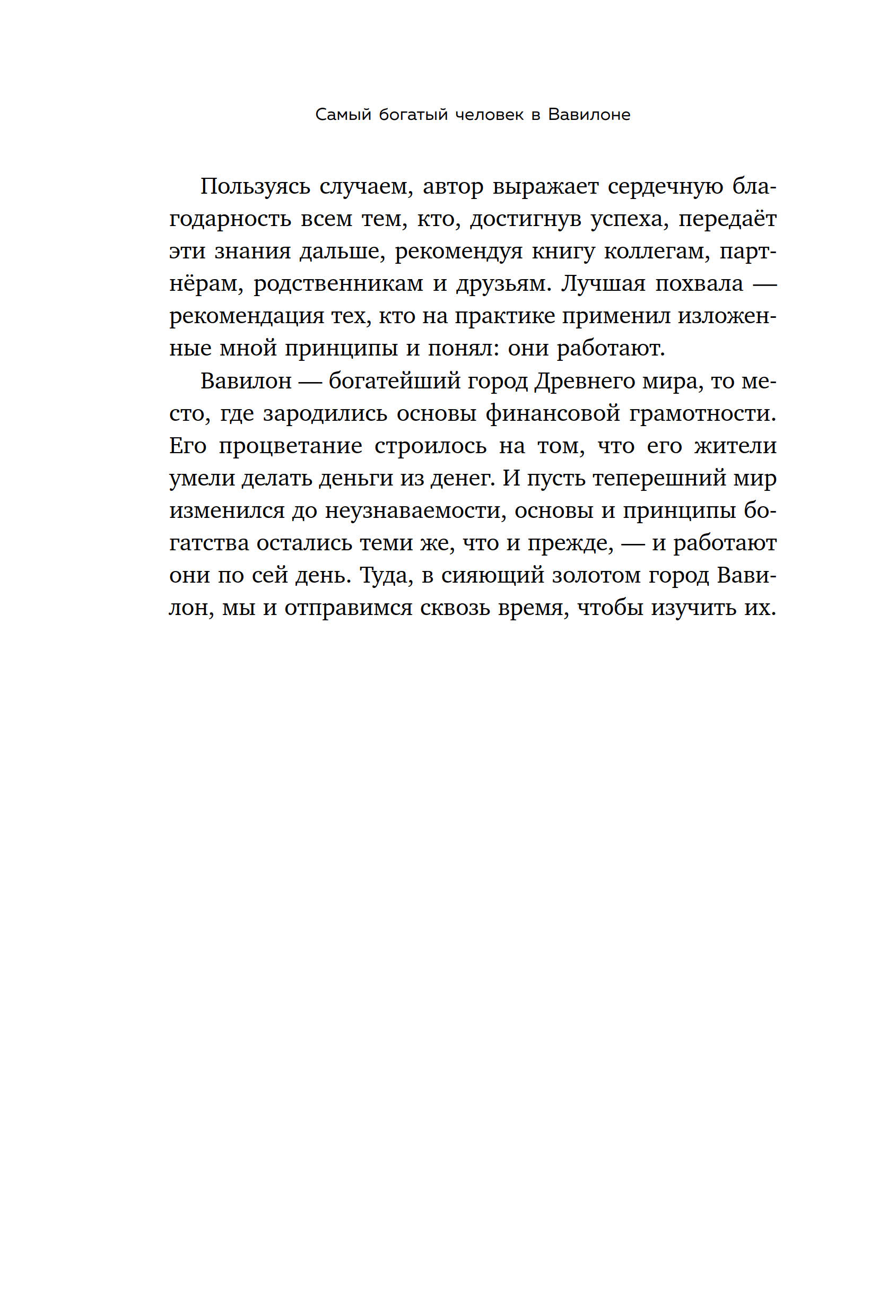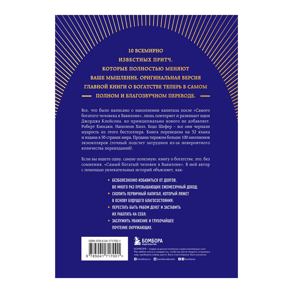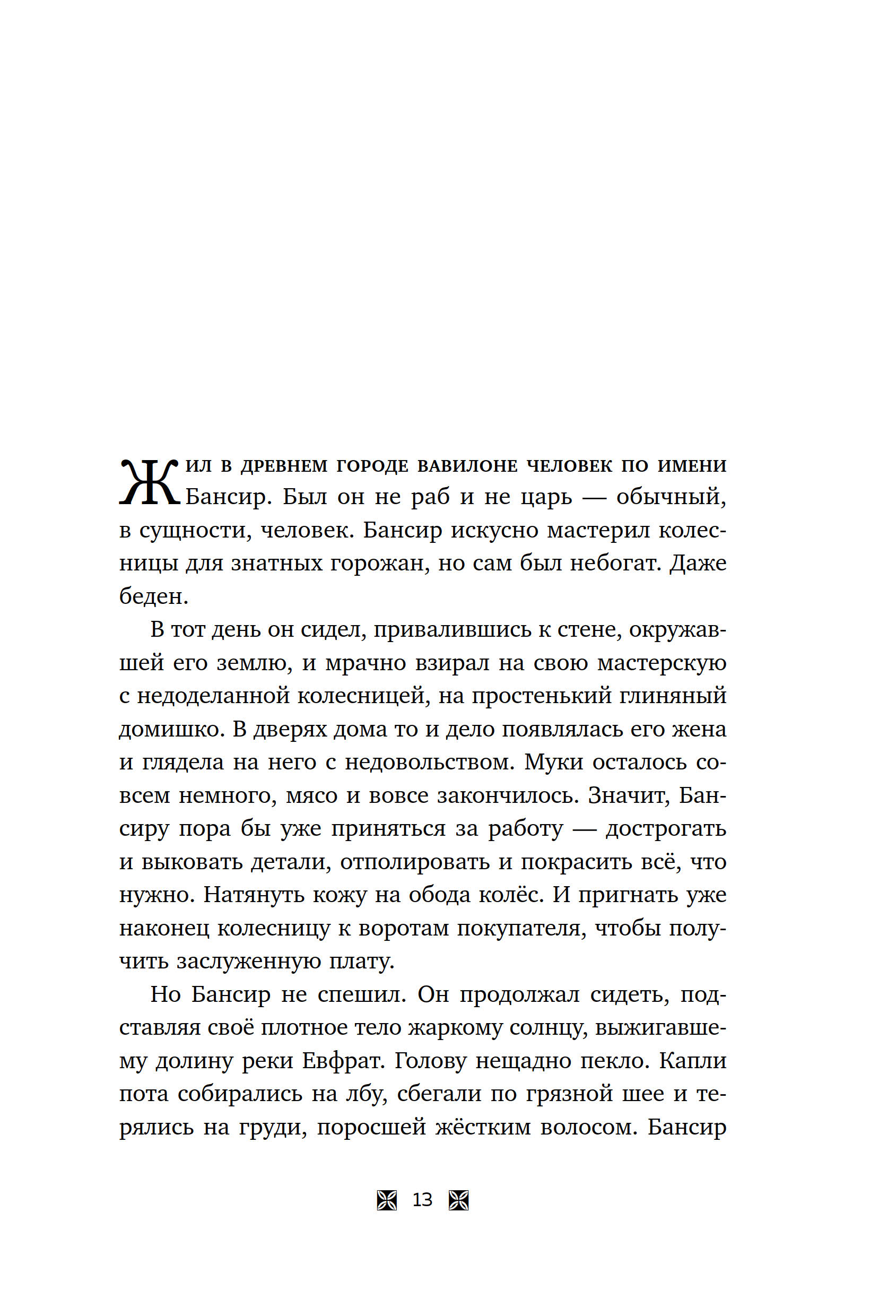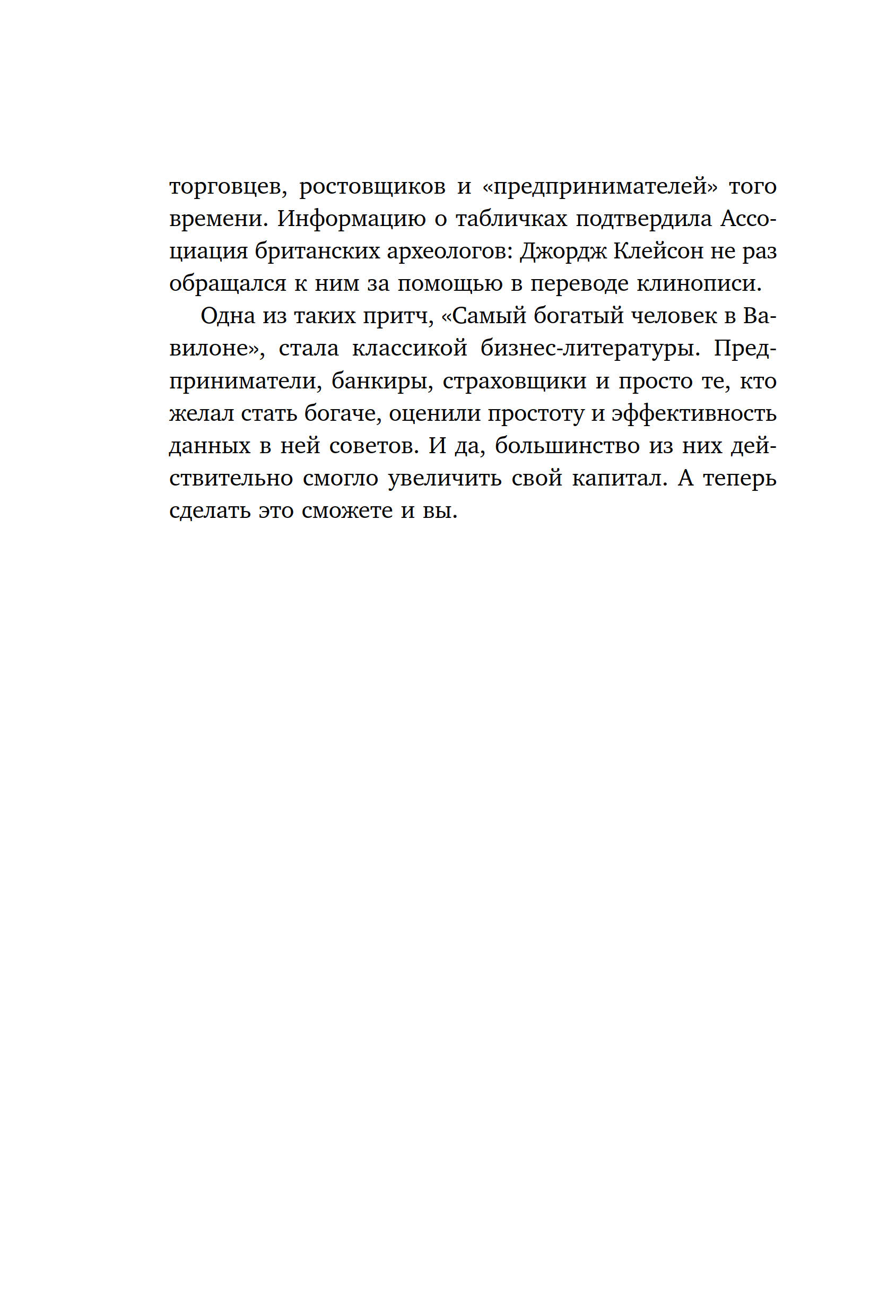 Если вы ищете одну, самую полезную книгу о богатстве, это без сомнения «Самый богатый человек в Вавилоне». В ней автор с помощью увлекательных историй объясняет, как: • безболезненно избавиться от долгов, во много раз превышающих ежемесячный доход; • скопить первичный капитал, который ляжет в основу будущего благосостояния; • перестать быть рабом денег и заставить их работать на себя; • заслужить уважение и глубочайшее почтение окружающих.
