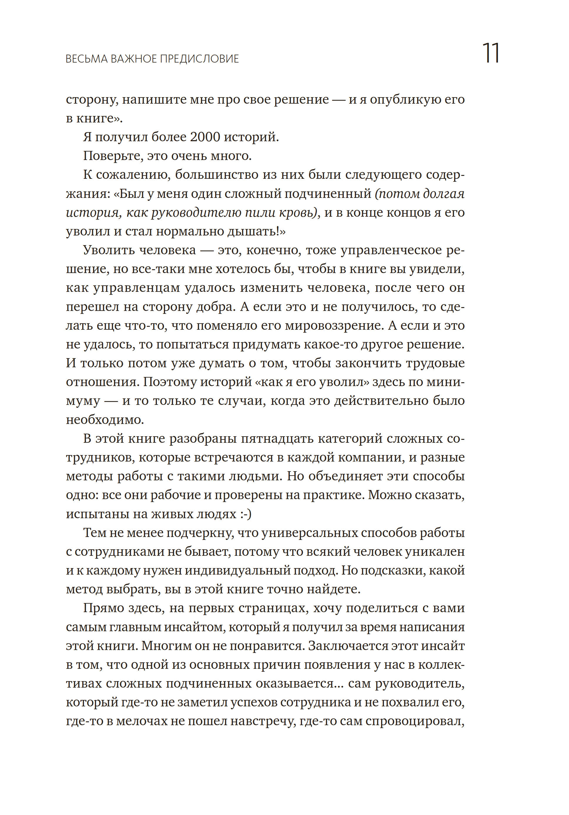Перед тем как написать эту книгу, автор собрал и проанализировал несколько тысяч кейсов российских менеджеров. Получилось 15 категорий сложных сотрудников — от опоздунов и безынициативных до выгоревших и нарциссов. Это основные типы, которые встречаются в каждой компании. Батырев описывает их в книге и рассказывает, как с ними работать. Все советы проверены на практике.
