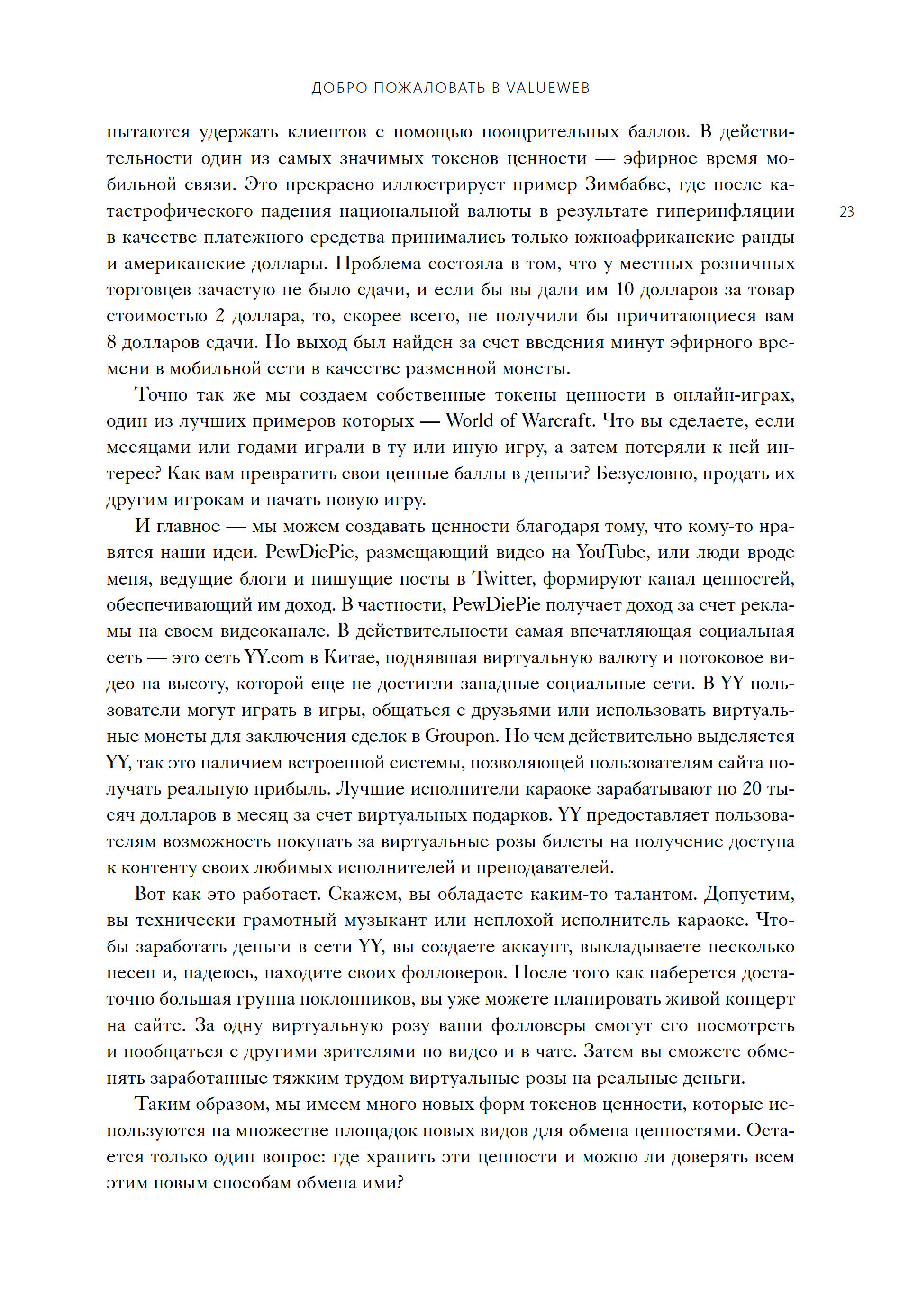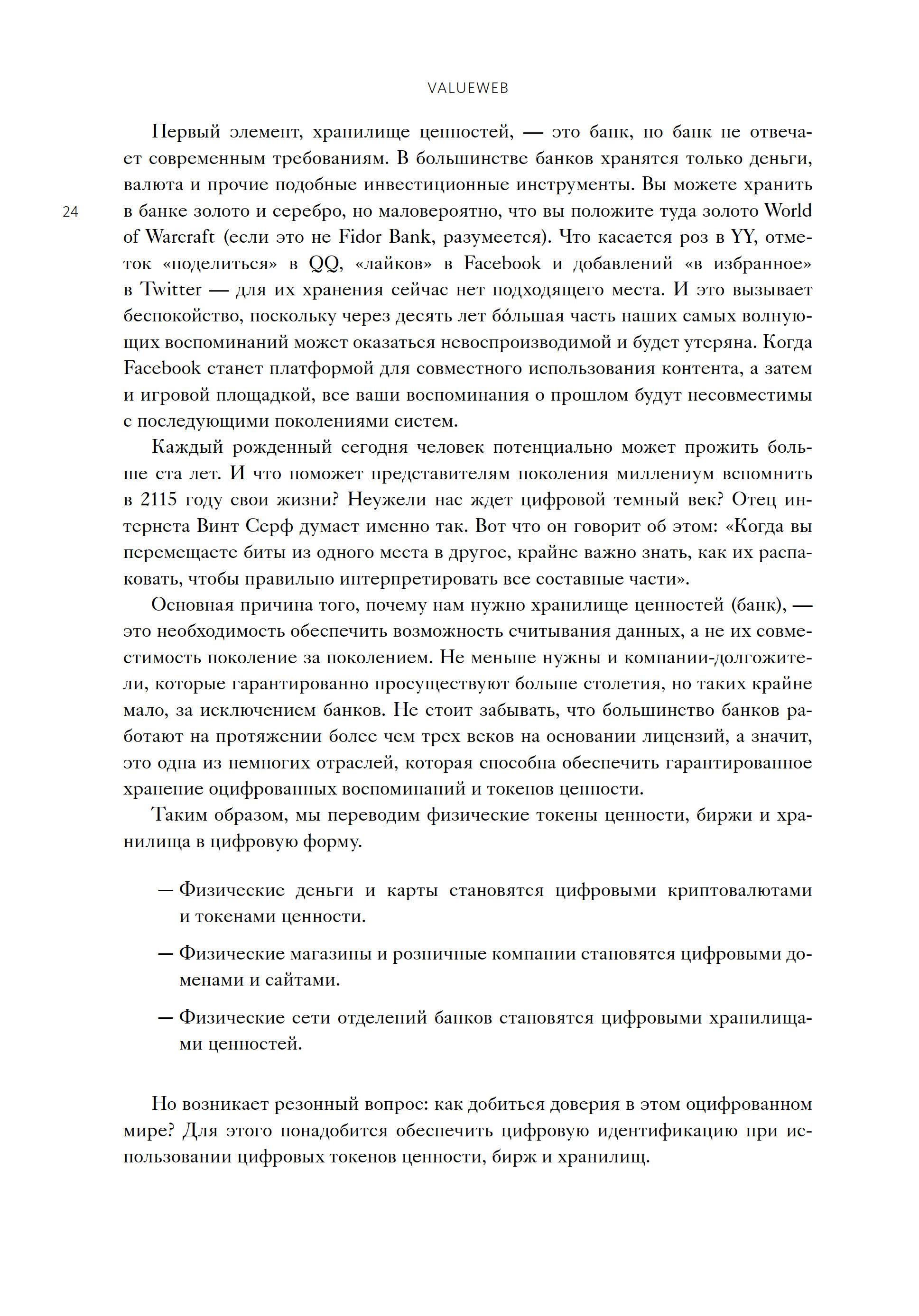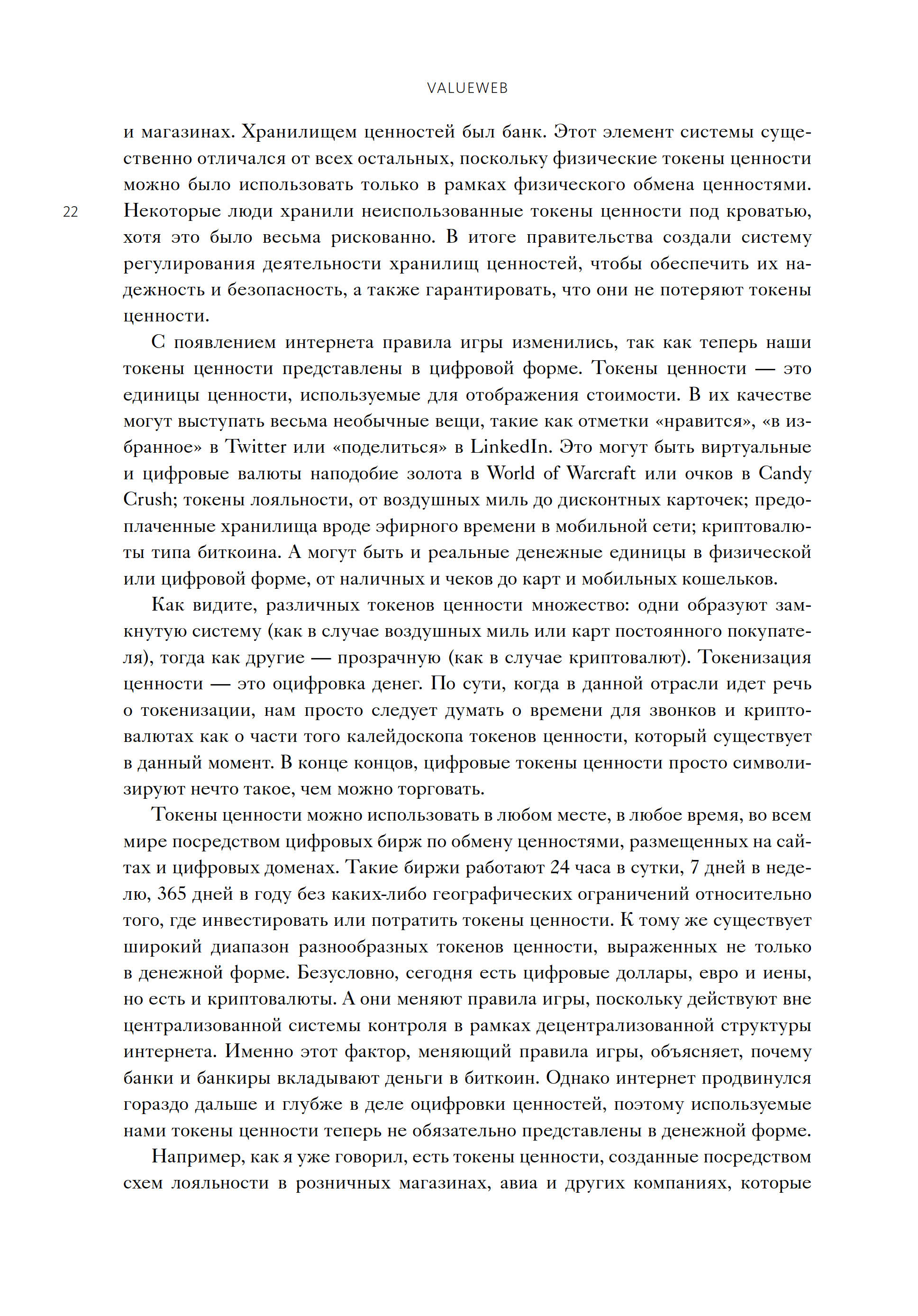 В книге, ставшей продолжением «Цифрового банка», Крис Скиннер проводит глубокий анализ обмена ценностями в развивающемся цифровом мире. На основе примеров из практики, интервью и личных наблюдений Крис объясняет, как мир переходит от традиционных валют к ValueWeb, интернету ценностей. Это еще одна книга, которую необходимо прочитать не только тем, кого интересует мир финансовых технологий, но и всем тем, кто стремится составить представление о будущем, в котором денежные и неденежные переводы осуществляются мгновенно посредством мобильных и цифровых сетей.