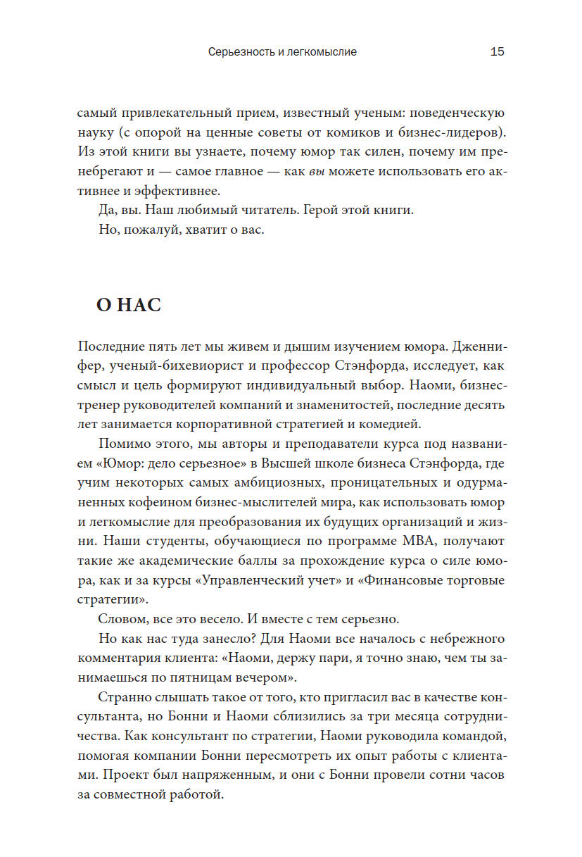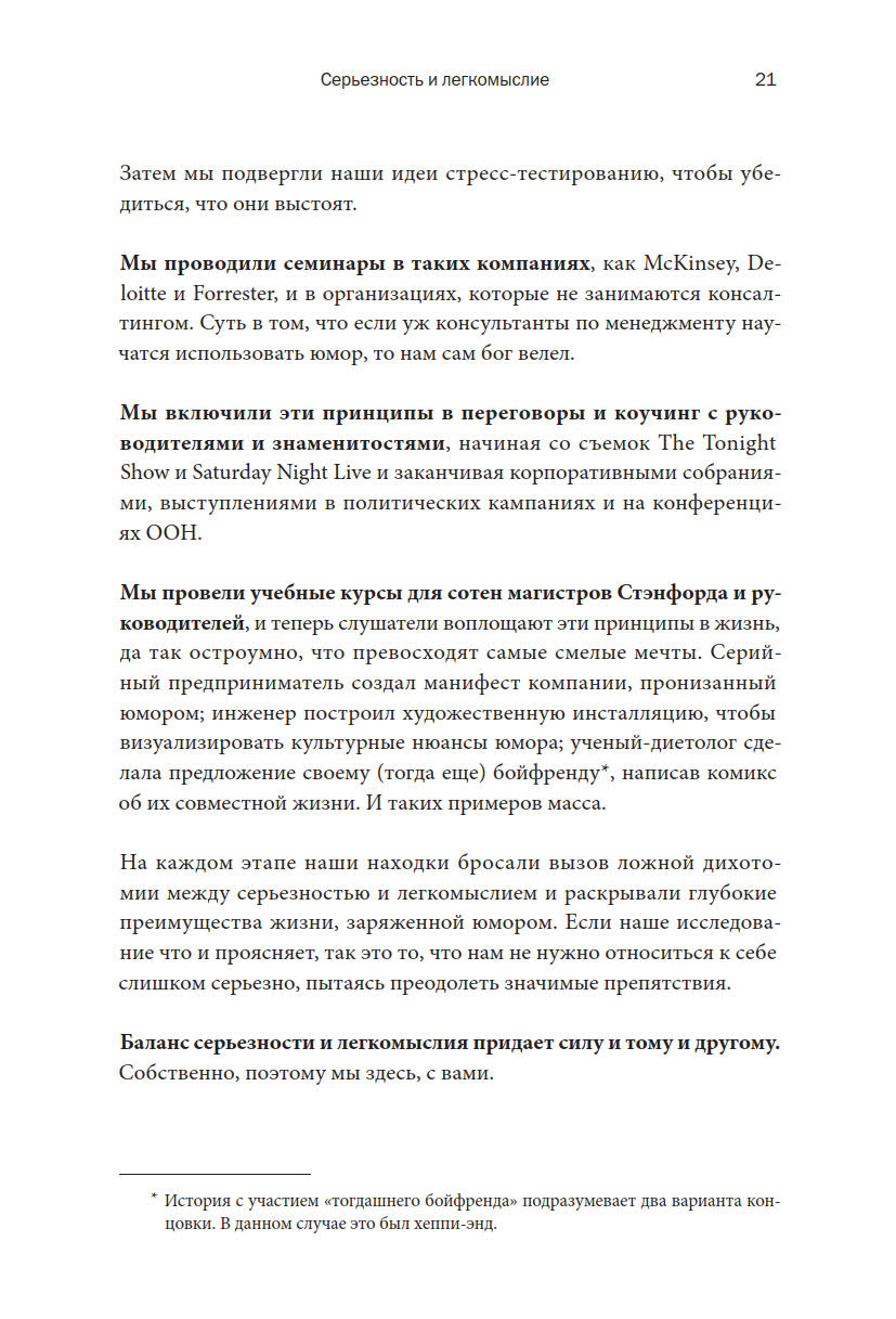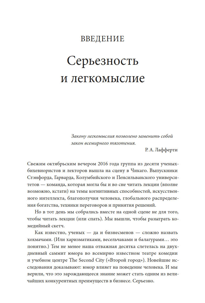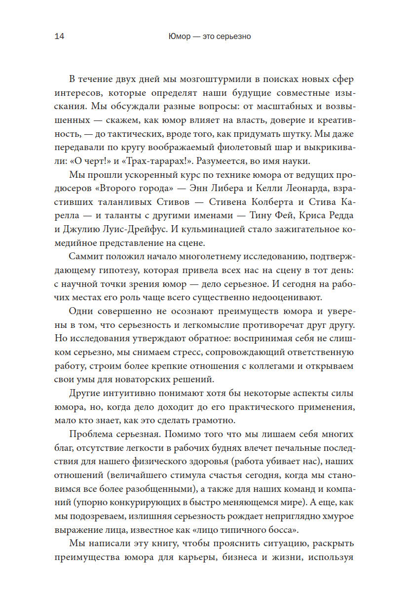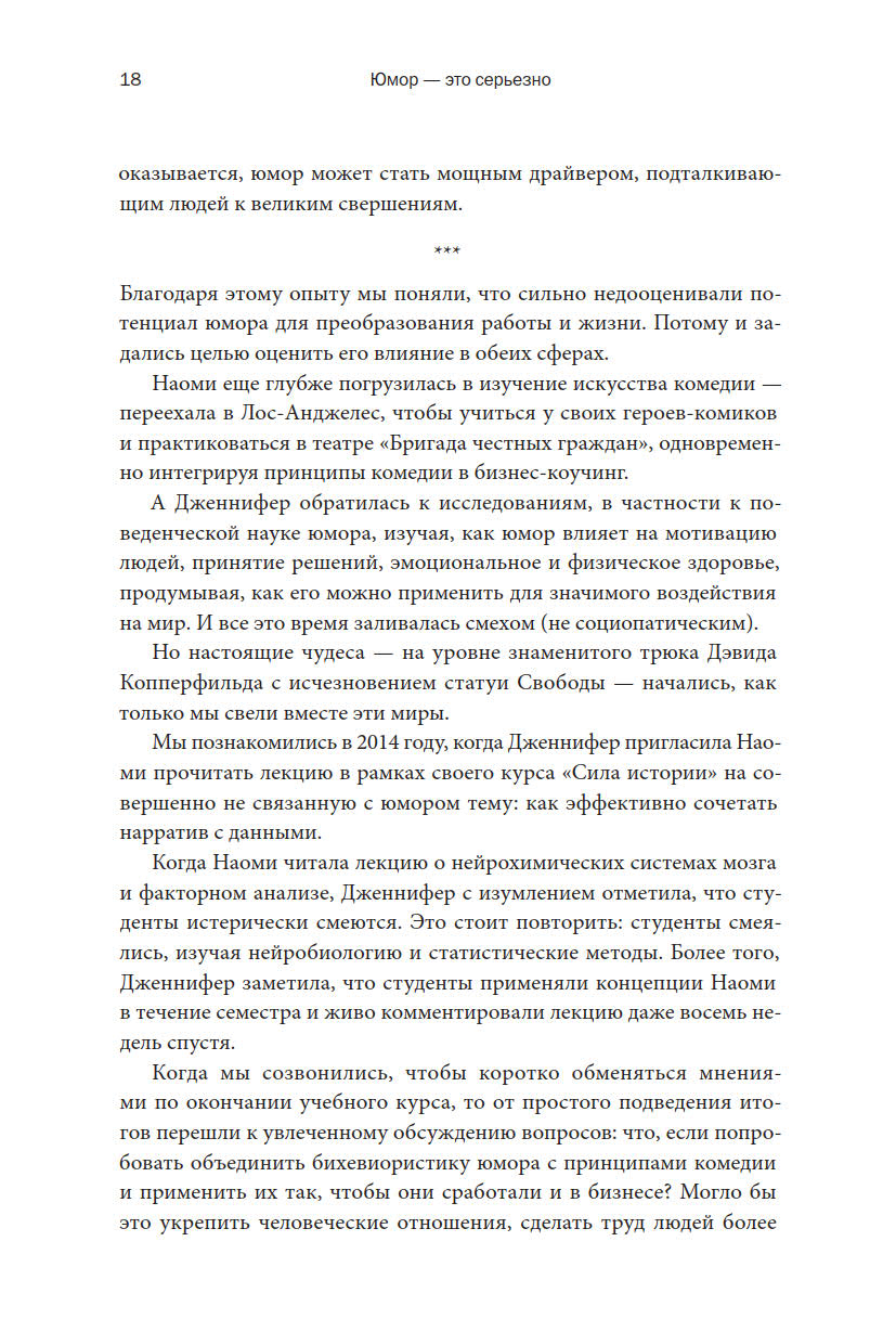 Мы написали эту книгу, чтобы прояснить ситуацию, раскрыть преимущества юмора для нашей карьеры, нашего бизнеса и нашей жизни, используя самый привлекательный прием, известный ученым: поведенческую науку (с опорой на ценные советы от комиков и бизнес-лидеров). Из этой книги вы узнаете, почему юмор так силен, почему недоиспользуется и — самое главное — как вы можете использовать его активнее и эффективнее.
