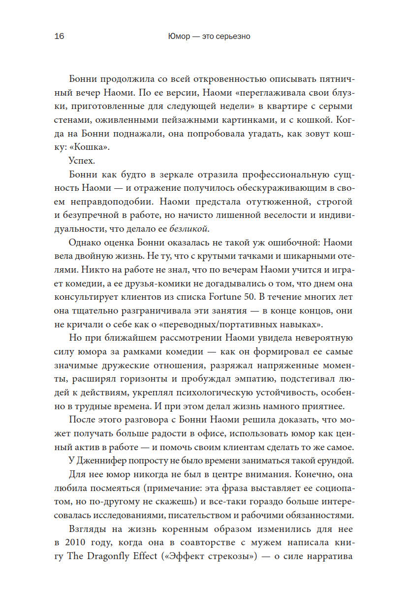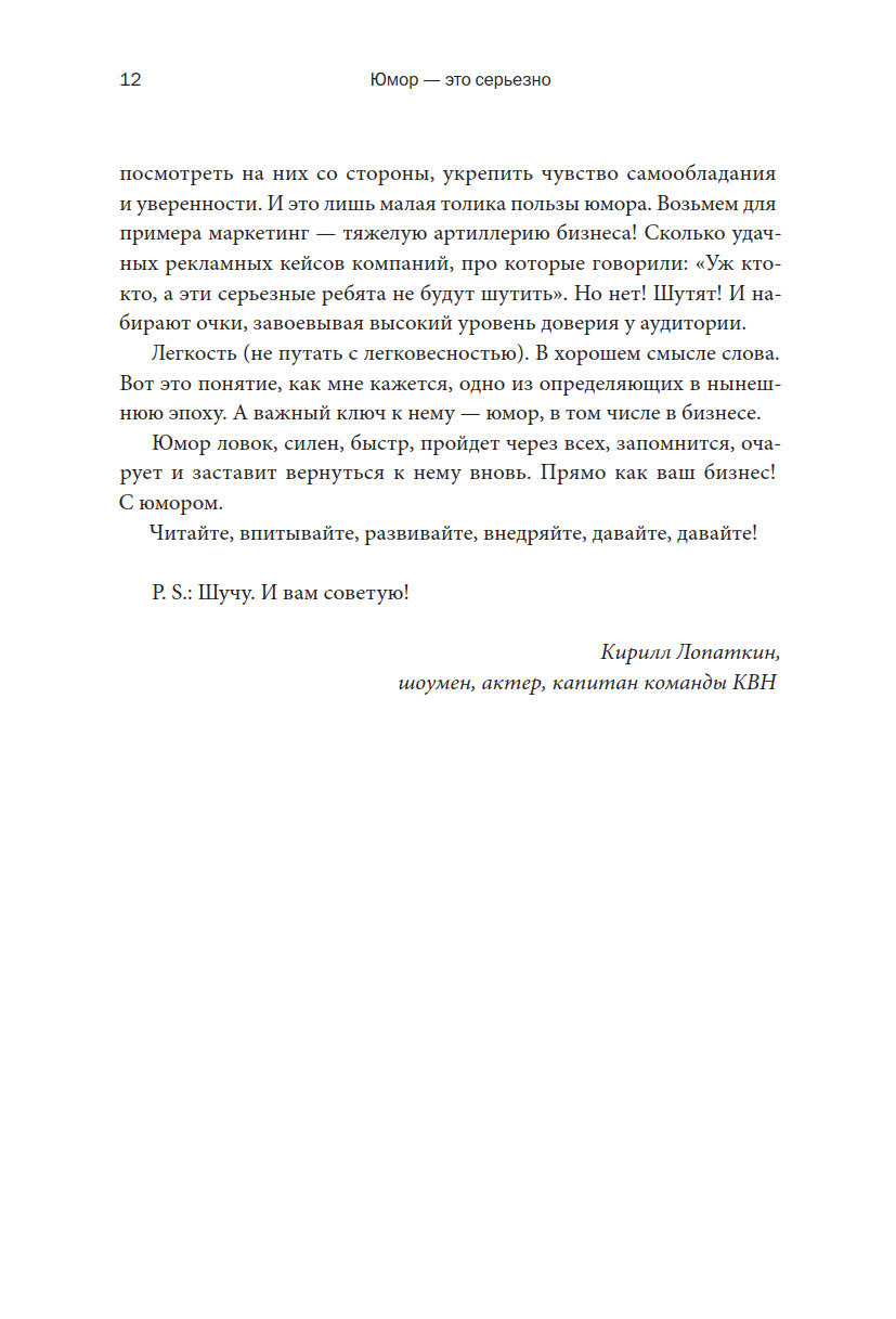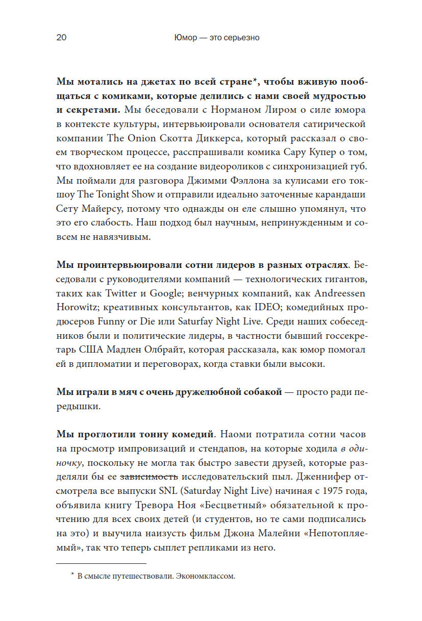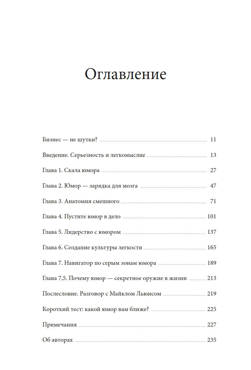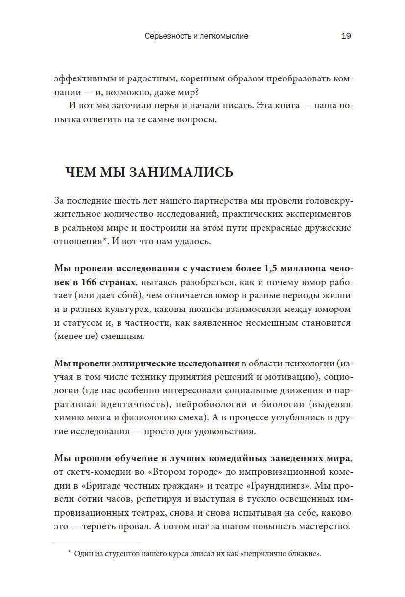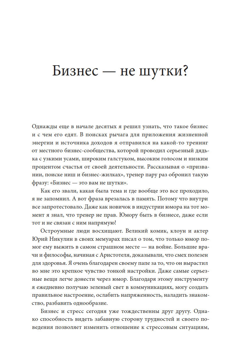 Мы написали эту книгу, чтобы прояснить ситуацию, раскрыть преимущества юмора для нашей карьеры, нашего бизнеса и нашей жизни, используя самый привлекательный прием, известный ученым: поведенческую науку (с опорой на ценные советы от комиков и бизнес-лидеров). Из этой книги вы узнаете, почему юмор так силен, почему недоиспользуется и — самое главное — как вы можете использовать его активнее и эффективнее.