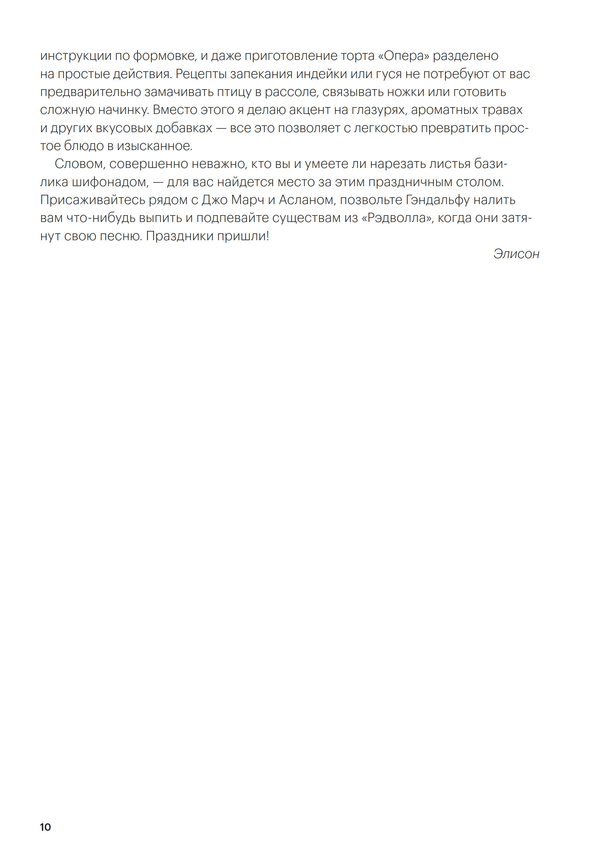 — Когда я взялась за «Праздничные рецепты из Страны чудес, Изумрудного города и других литературных миров», мне хотелось создать кулинарную книгу, которой в равной мере могли бы насладиться любители еды и любители чтения. Для меня было важно, чтобы она подошла читателям с любым уровнем кулинарного мастерства. Конечно, мне хотелось расширить границы собственных умений и воображения, но не за счёт простоты приготовления. Я твёрдо верю: наслаждаться едой из любимых литературных произведений можно даже не отличая венчик с шариками от лопатки для рыбы.