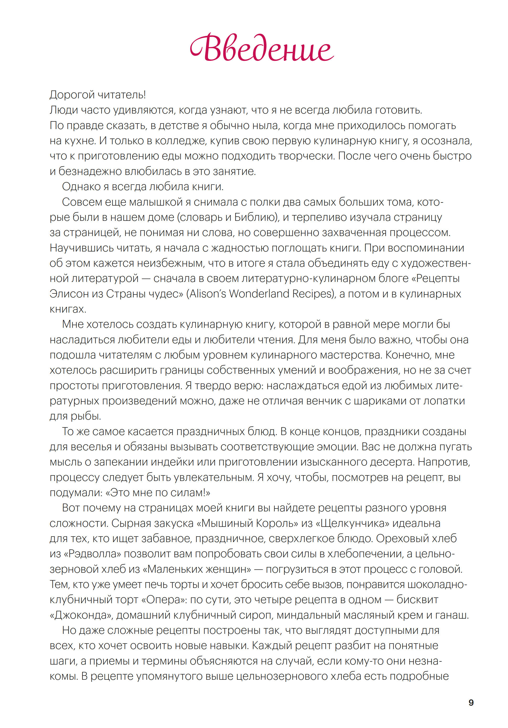 — Совсем ещё малышкой я снимала с полки два самых больших тома, которые были в нашем доме, — словарь и Библию — и терпеливо изучала страницу за страницей, не понимая ни слова, но совершенно захваченная процессом. Научившись читать, я начала с жадностью поглощать книги. При воспоминании об этом кажется неизбежным, что в итоге я стала объединять еду с художественной литературой — сначала в своём литературно-кулинарном блоге «Рецепты Элисон из Страны Чудес» (Alison’s Wonderland Recipes), а потом и в кулинарных книгах.
