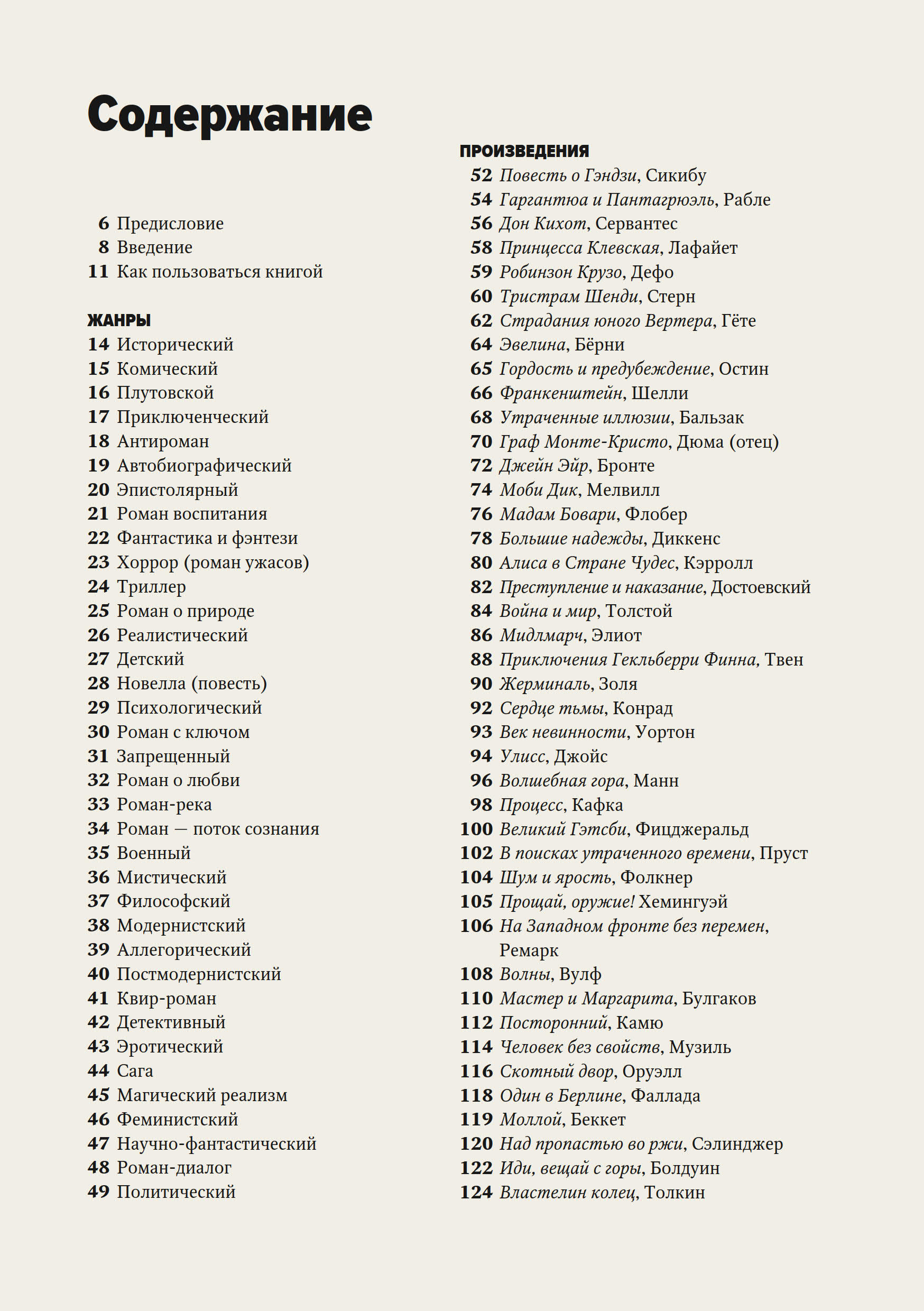 Хотя большинство представленных в книге произведений написаны после изобретения печатного станка и принадлежат к относительно короткому периоду — последним пятистам годам, — самому старому из них почти две тысячи лет. Каждый из упомянутых здесь романов в свое время совершил прорыв или отступил от общепринятых норм и сильно повлиял на развитие литературной формы. Все эти романы читают до сих пор, они переведены на огромное количество языков. Все они обсуждаются и анализируются в контексте конкретной эпохи; краткие биографии авторов сообщают подробности об их жизни, времени и источниках вдохновения.