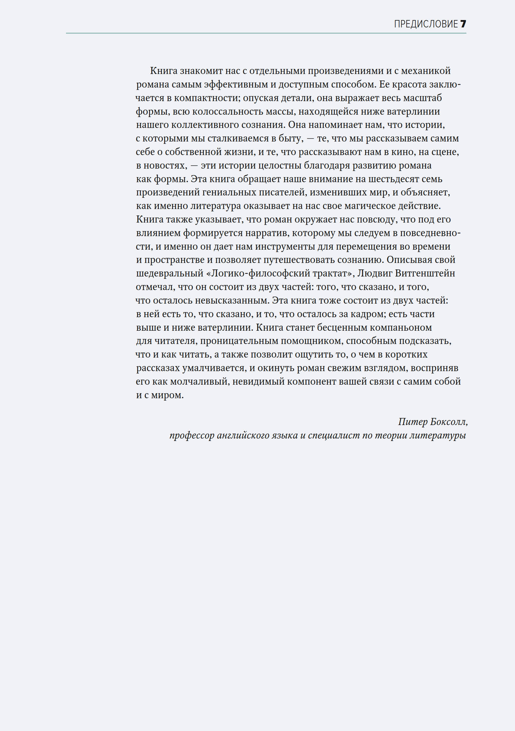 Книга станет бесценным компаньоном, проницательным помощником, способным подсказать, что и как читать, а также позволит окинуть роман свежим взглядом, восприняв его как молчаливый, невидимый компонент нашей связи с самим собой и с миром.