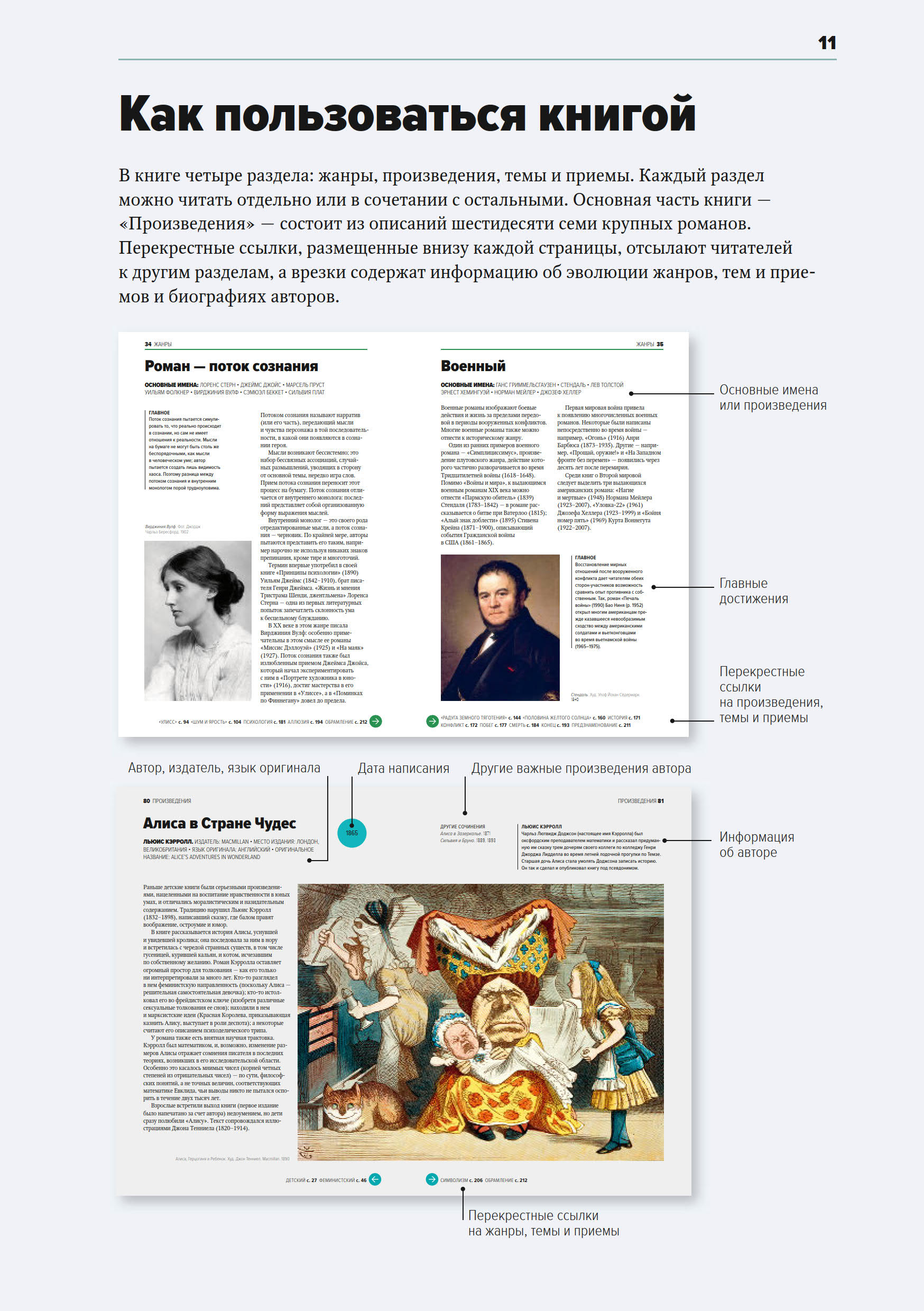 Перекрестные ссылки внизу каждой страницы позволяют увидеть внутренние связи и пересечения, а во врезках рассказывается о главных романах прошлого и их создателях.